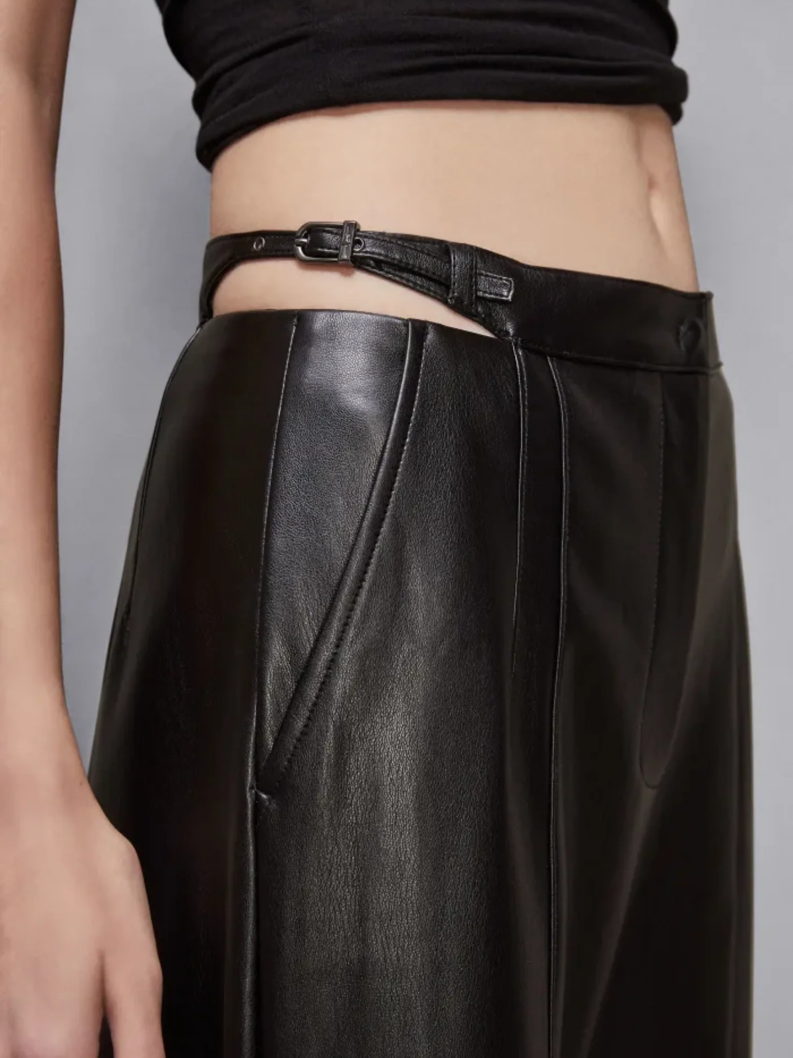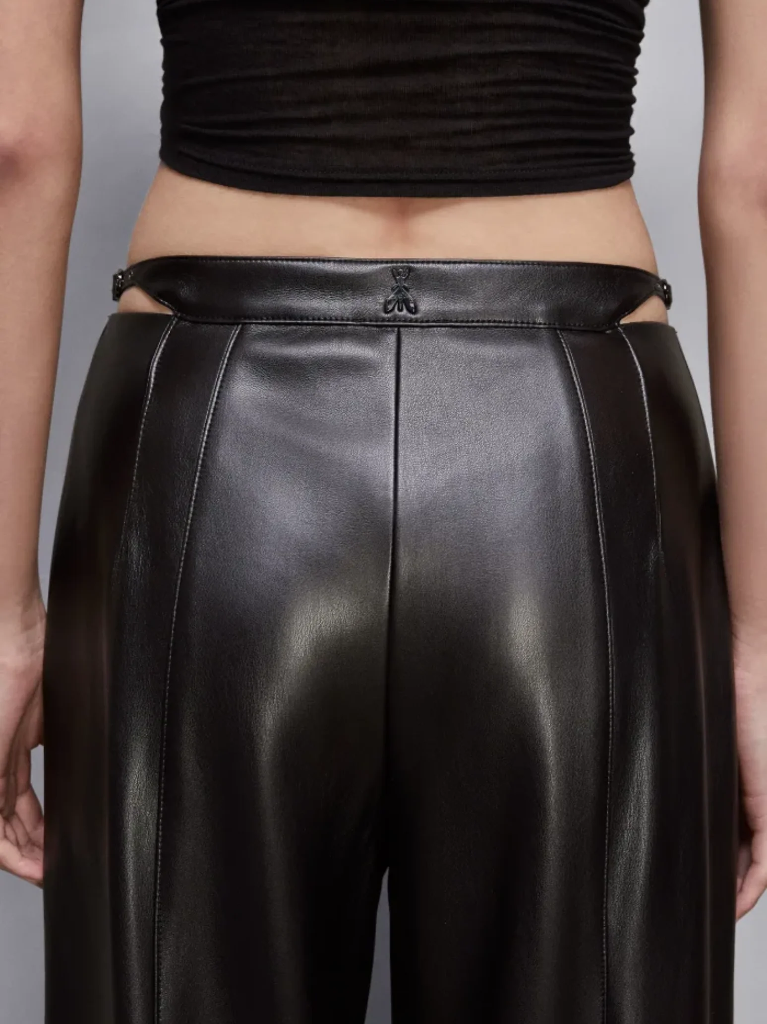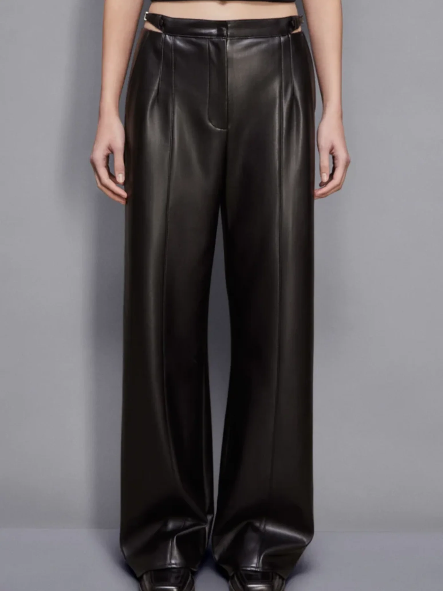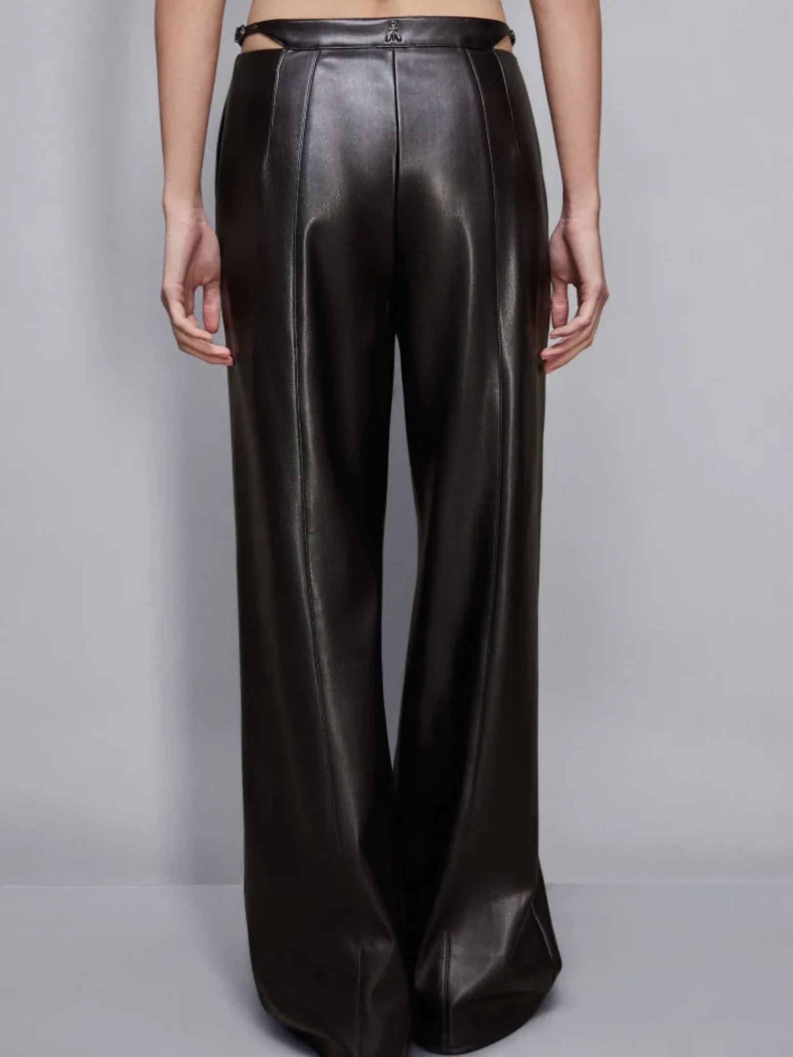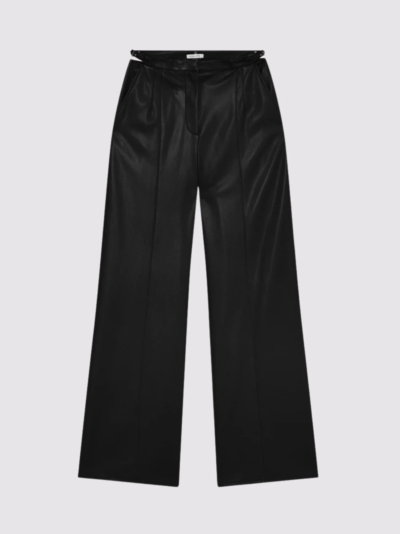 Questi pantaloni palazzo in tessuto spalmato aggiungono un’inconfondibile allure glam rock al tuo look, con una vestibilità slim che valorizza la silhouette. Gli slash laterali in vita e il cinturino con fibbie logate conferiscono un accento sensuale e audace, creando un contrasto perfetto tra raffinatezza e carattere.