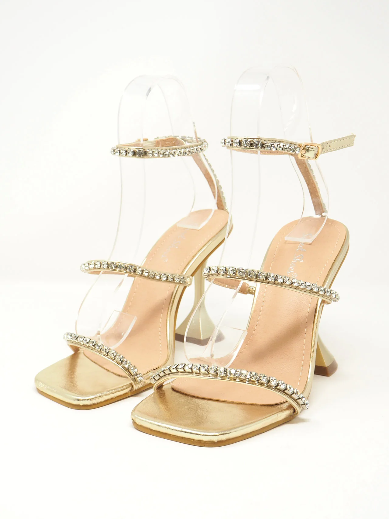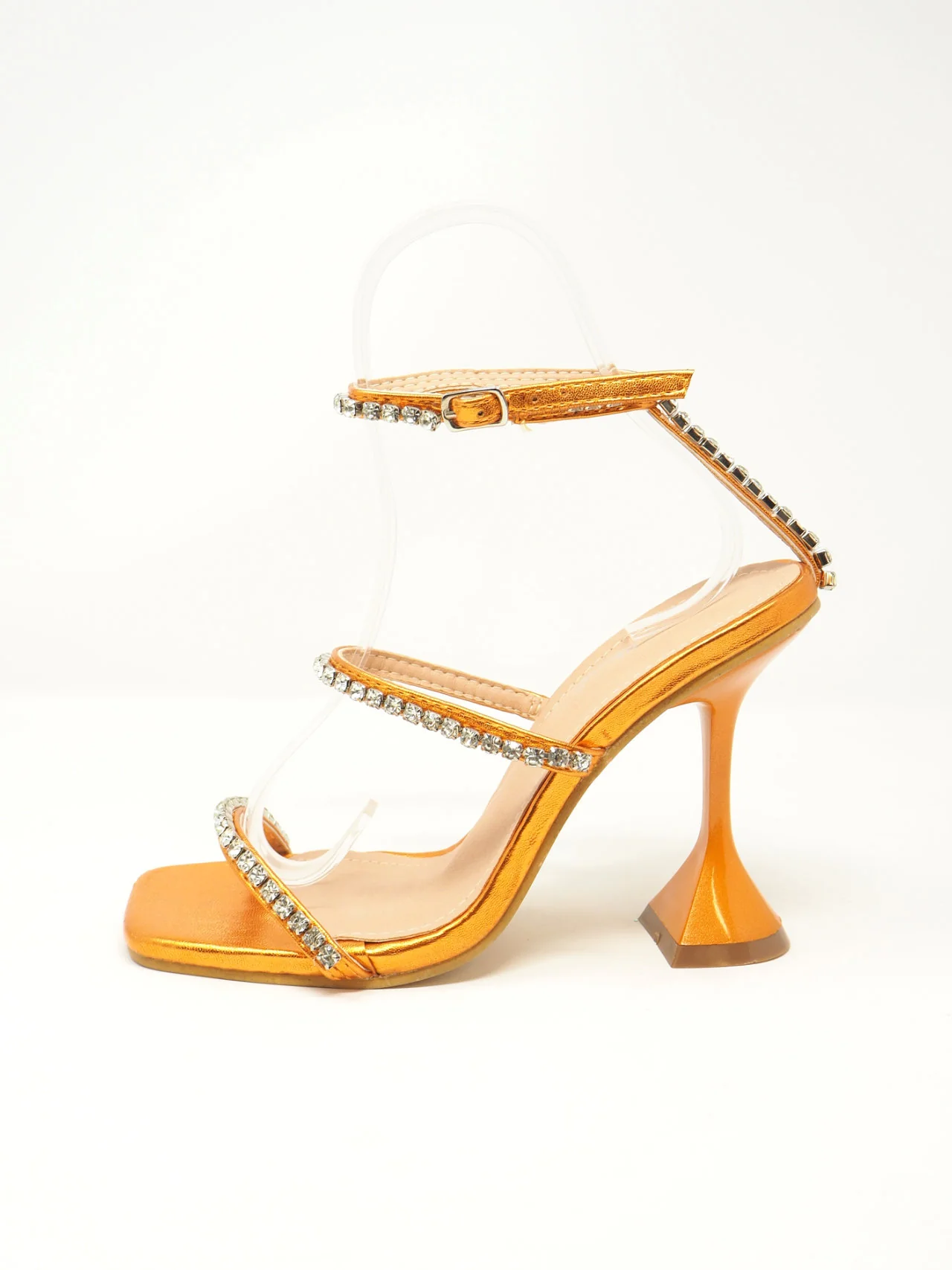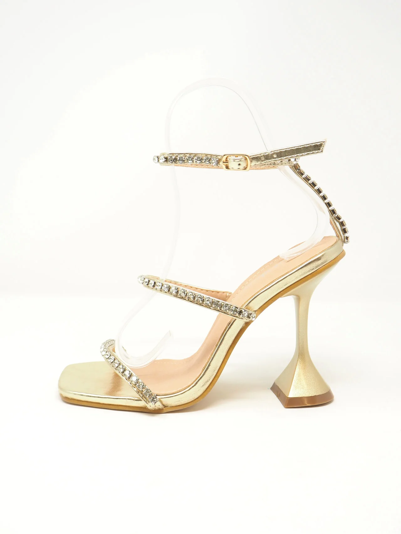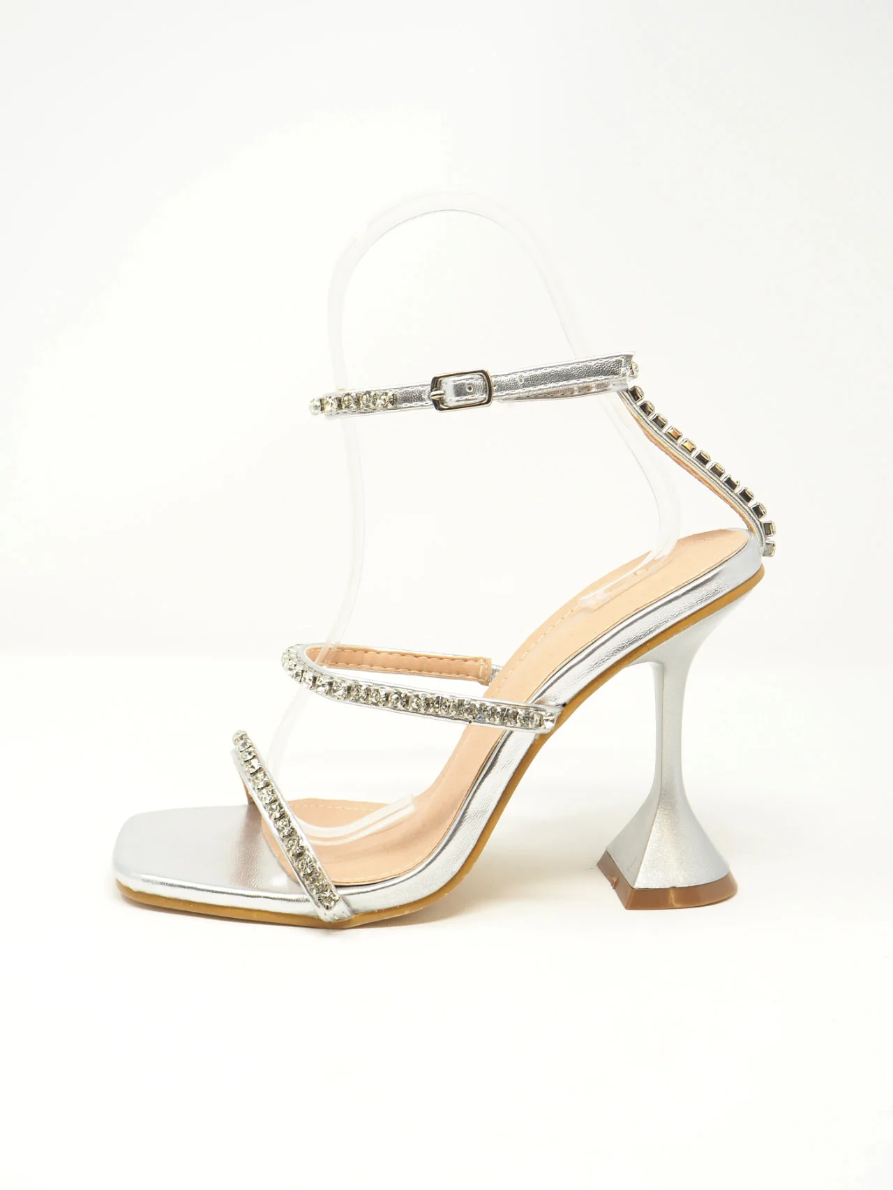 - Sandali con fascette di strass e laccio alla caviglia con tacco a rocchetto, adatti ad un look fashion e chic