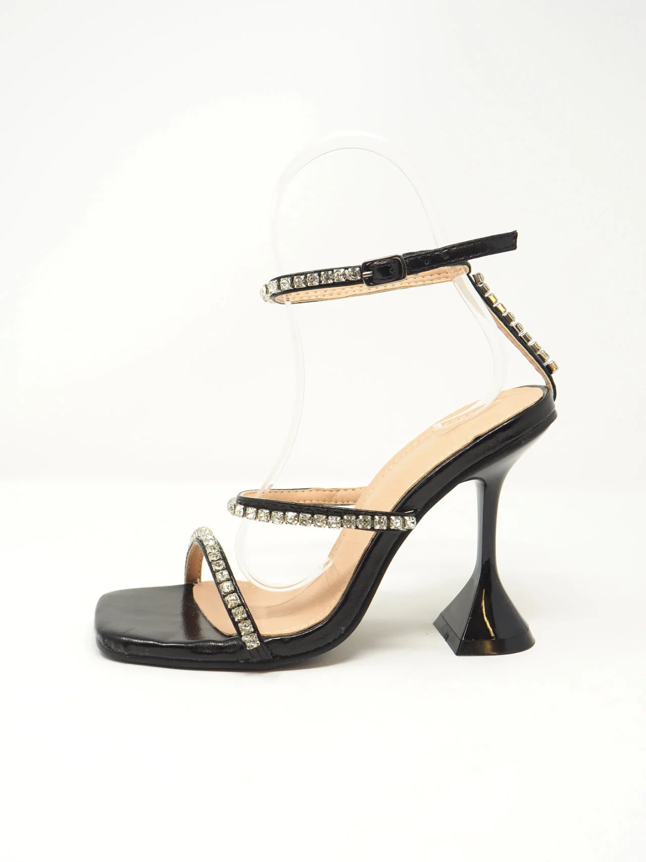 Sandali con fascette di strass e laccio alla caviglia con tacco a rocchetto, adatti ad un look fashion e chic Tomaia sintetica Suola sintetica Tacco altezza: 12 cmtacco larghezza: 4 cm Art. 2541-1