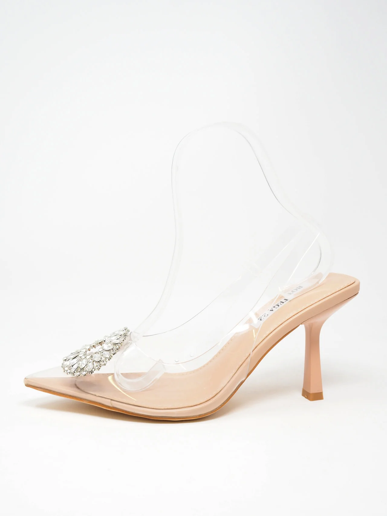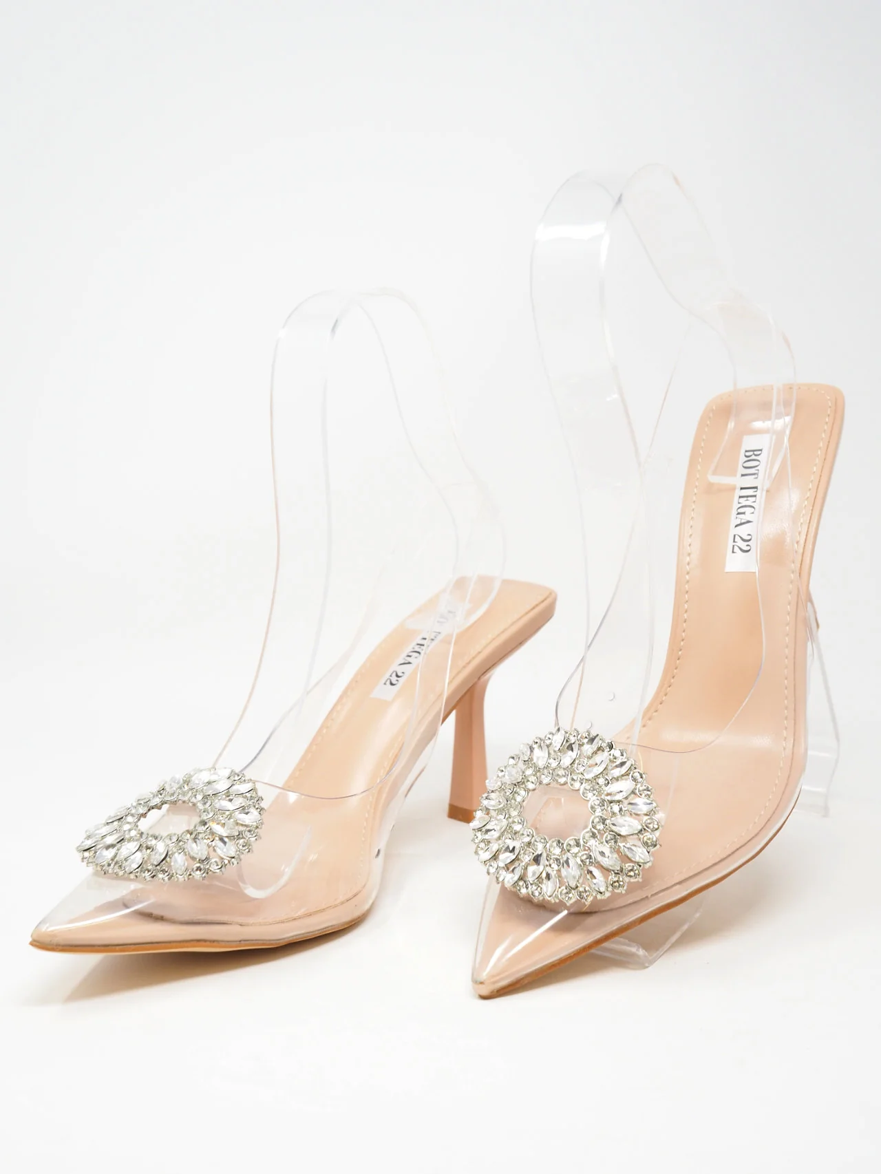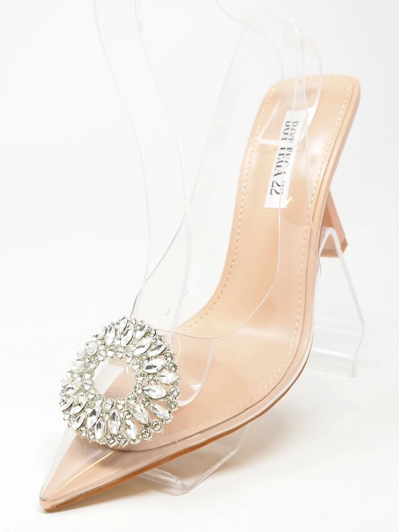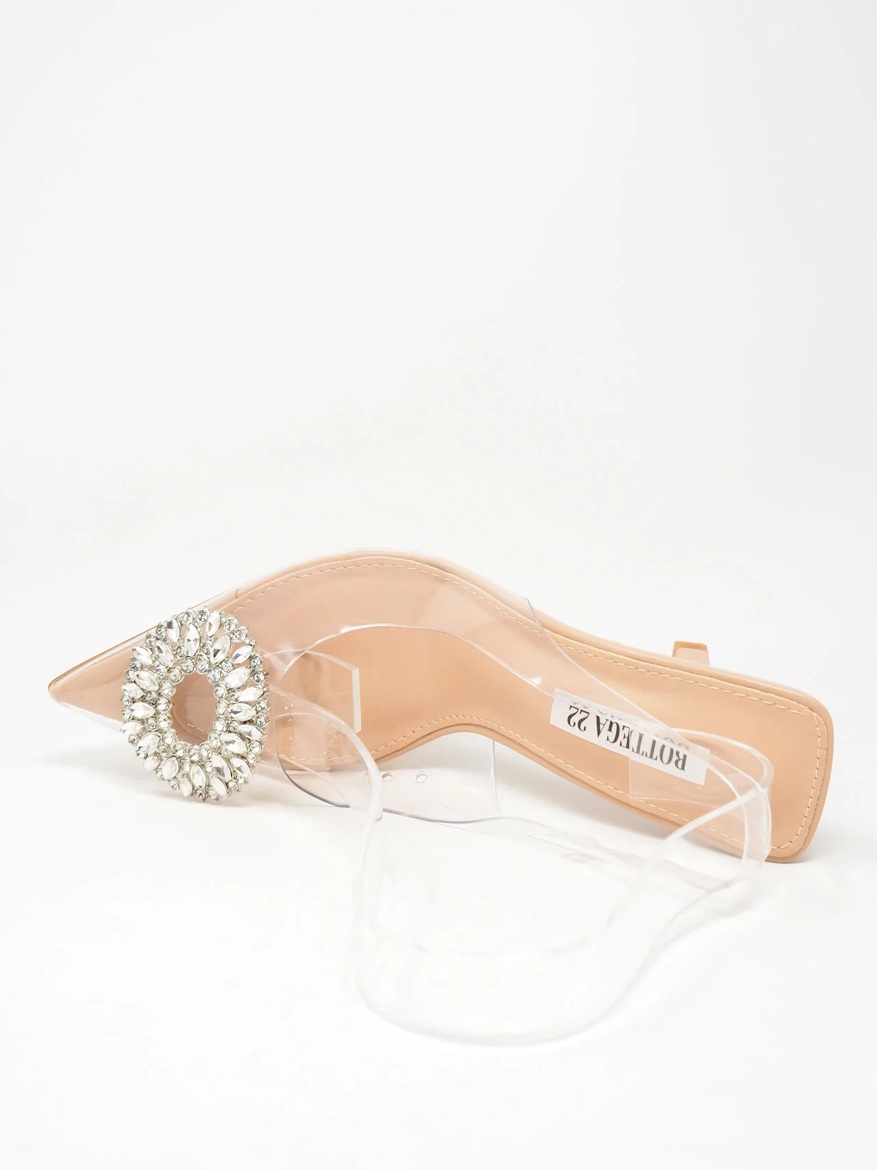 - Décolleté trasparenti a punta aperte dietro con laccetto e diadema di strass davanti, tacco fine, per un look fashion e chic.