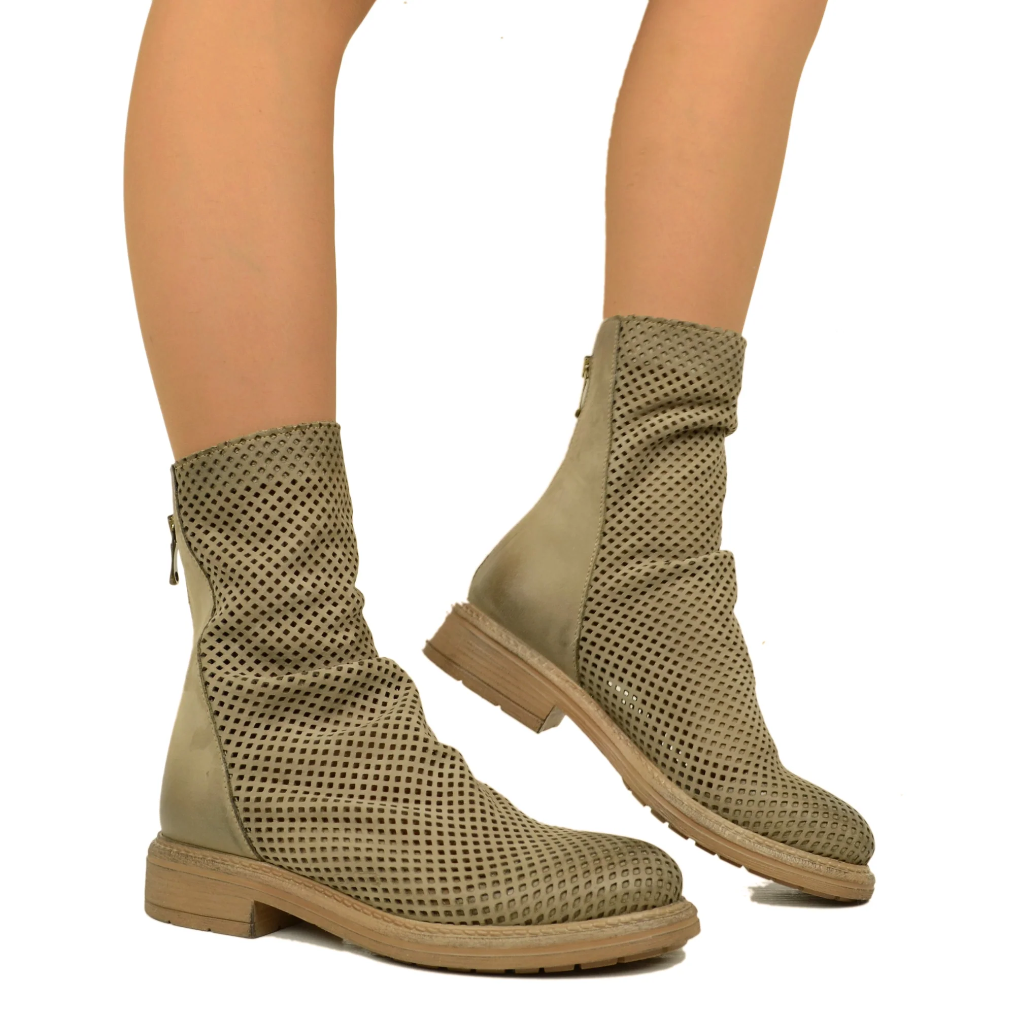 Stivaletti Biker Donna Traforati con Zip. Biker con Tacco Basso e Largo, Fondo in Gomma. Lavorazione Artigianale Made in Italy.