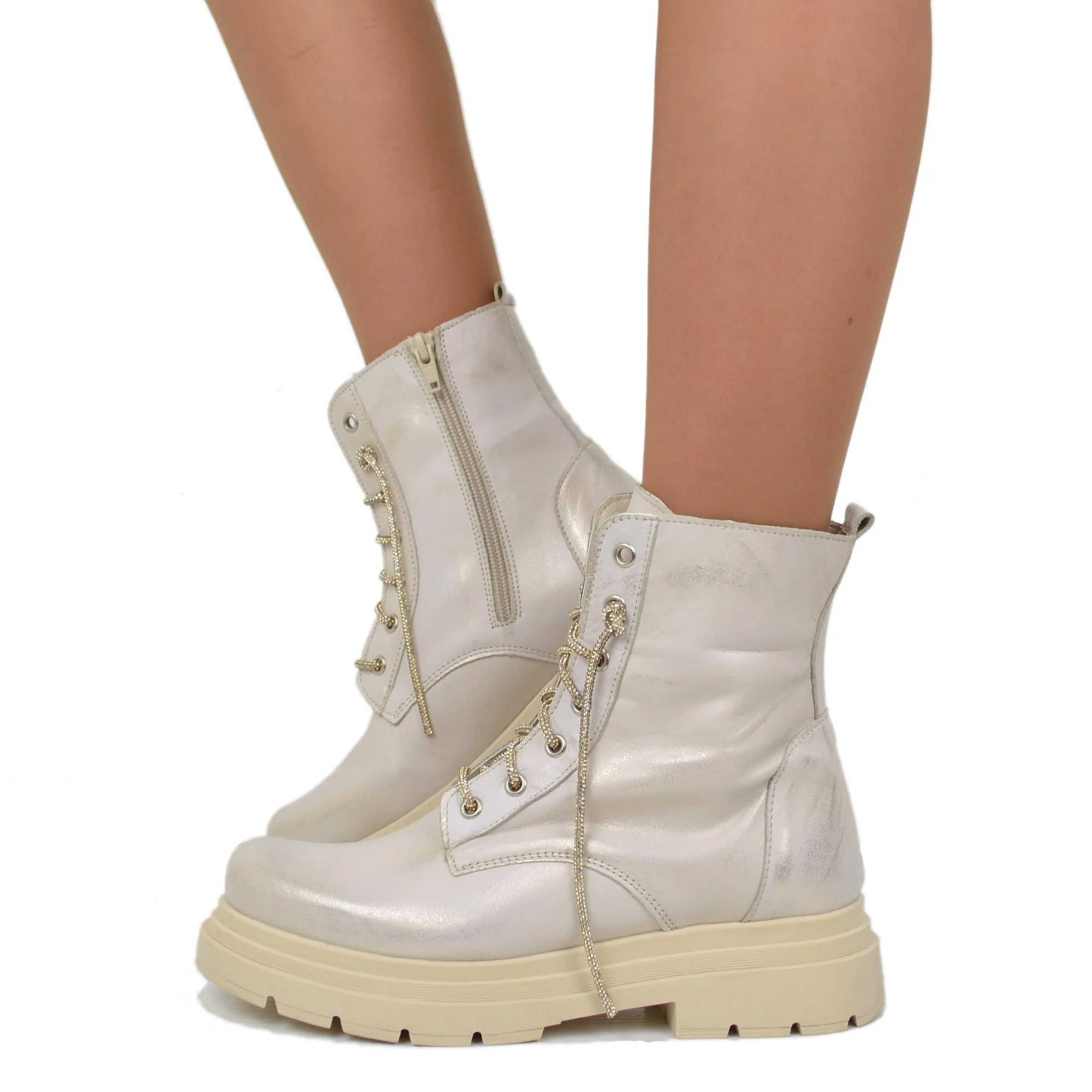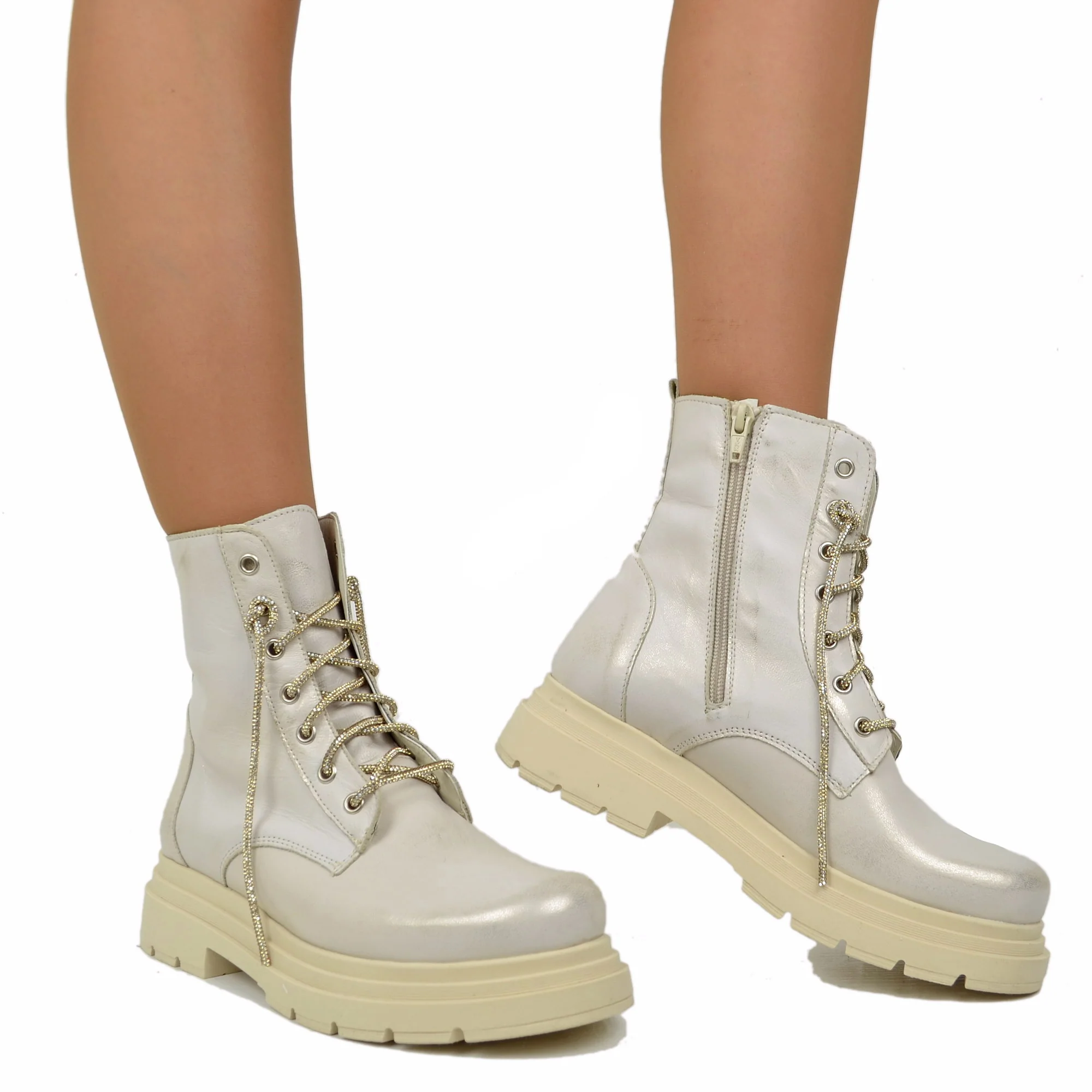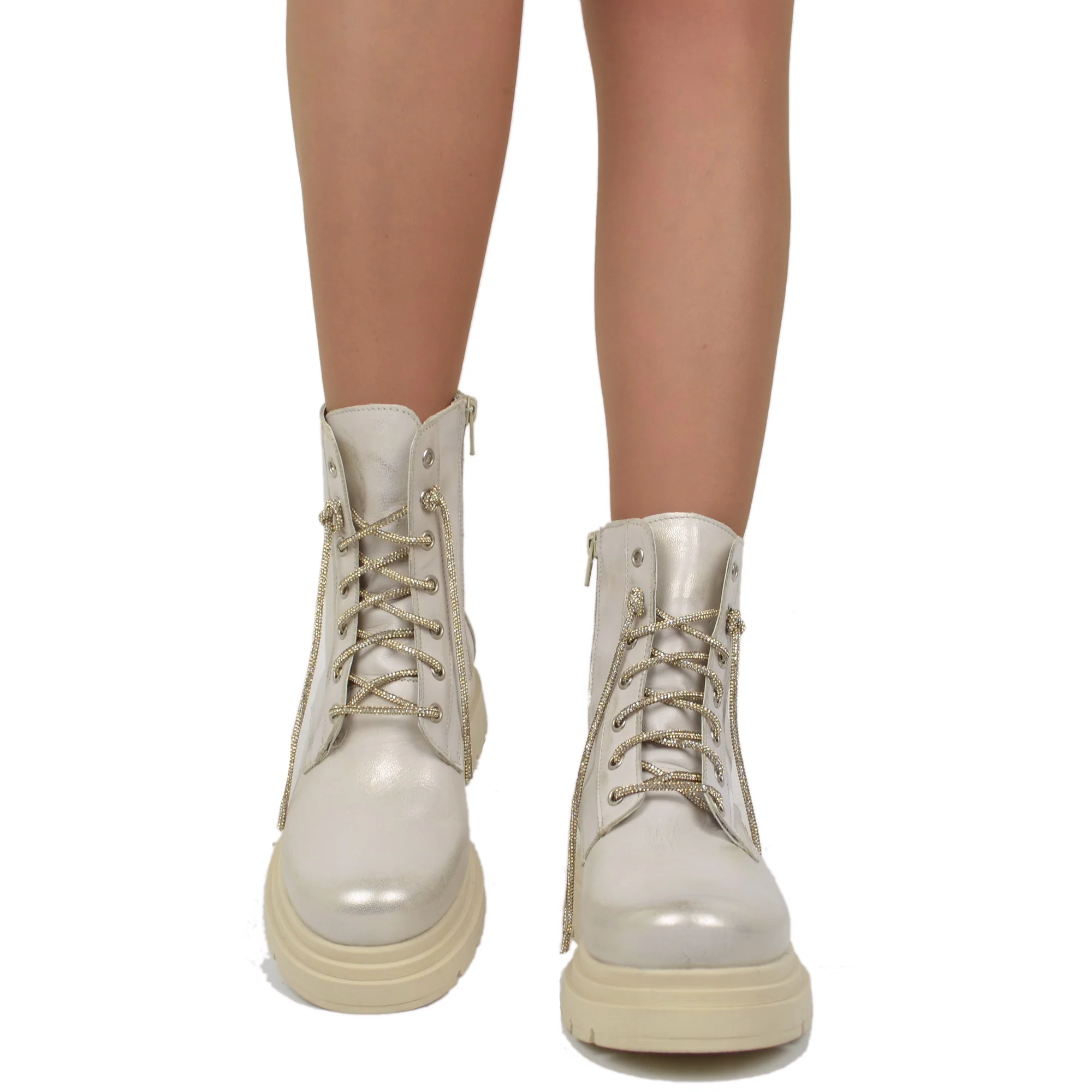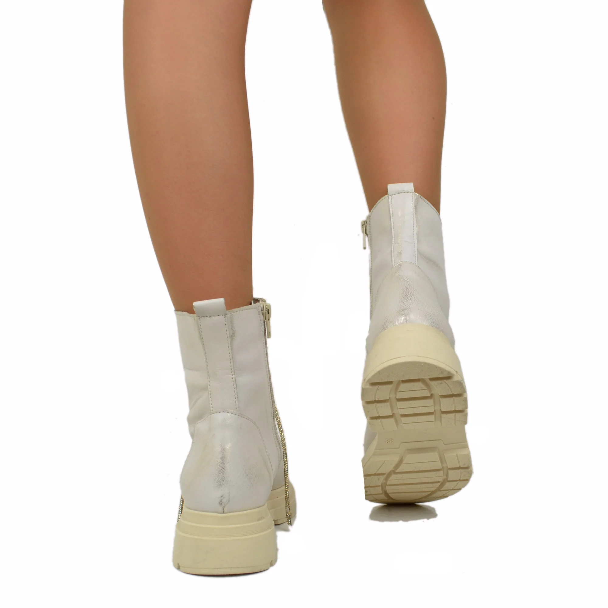 Stivaletti Biker Platino con Strass e Zip Laterale Made in Italy