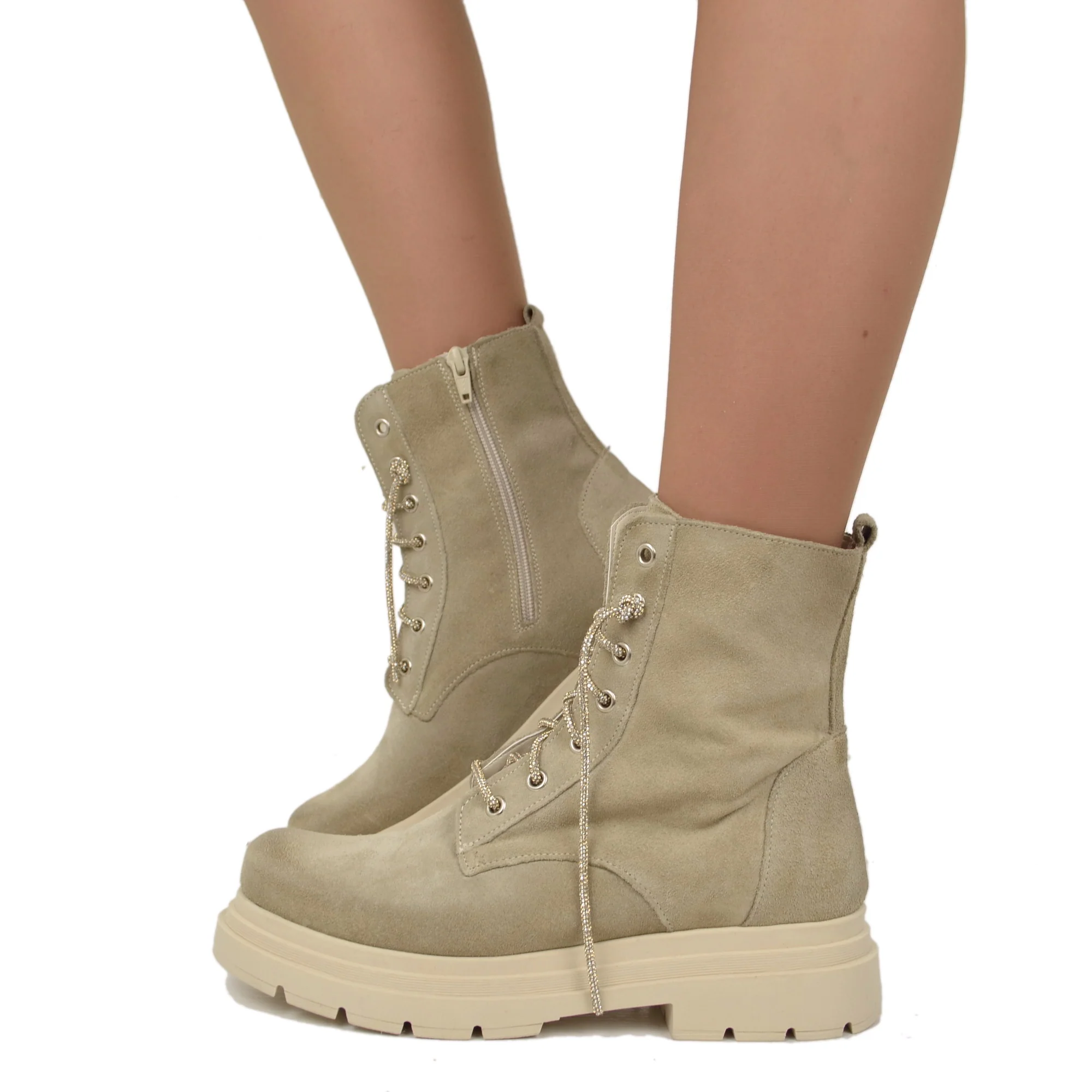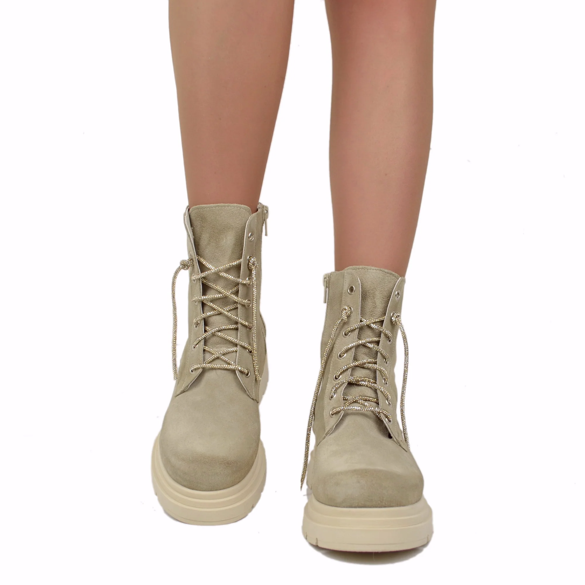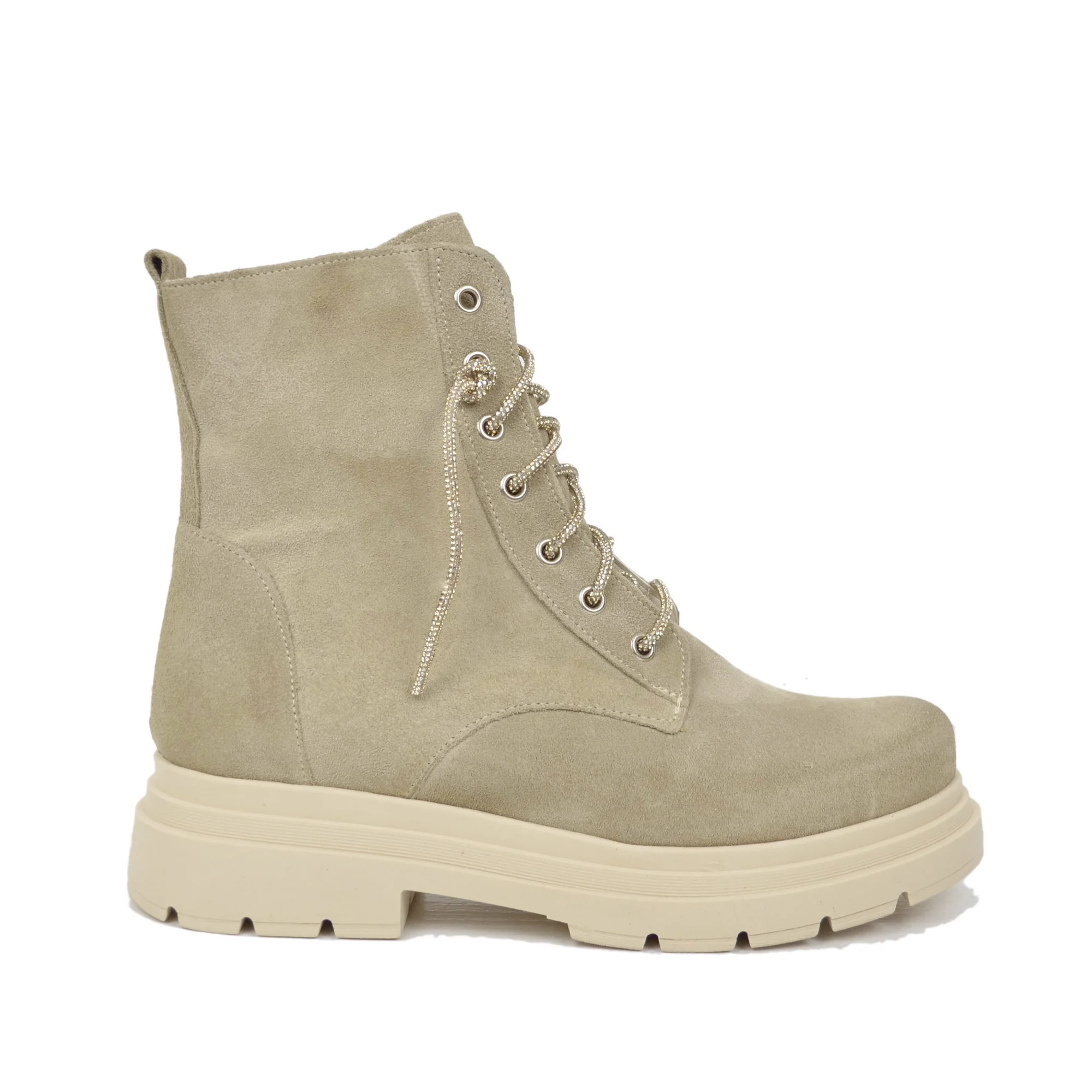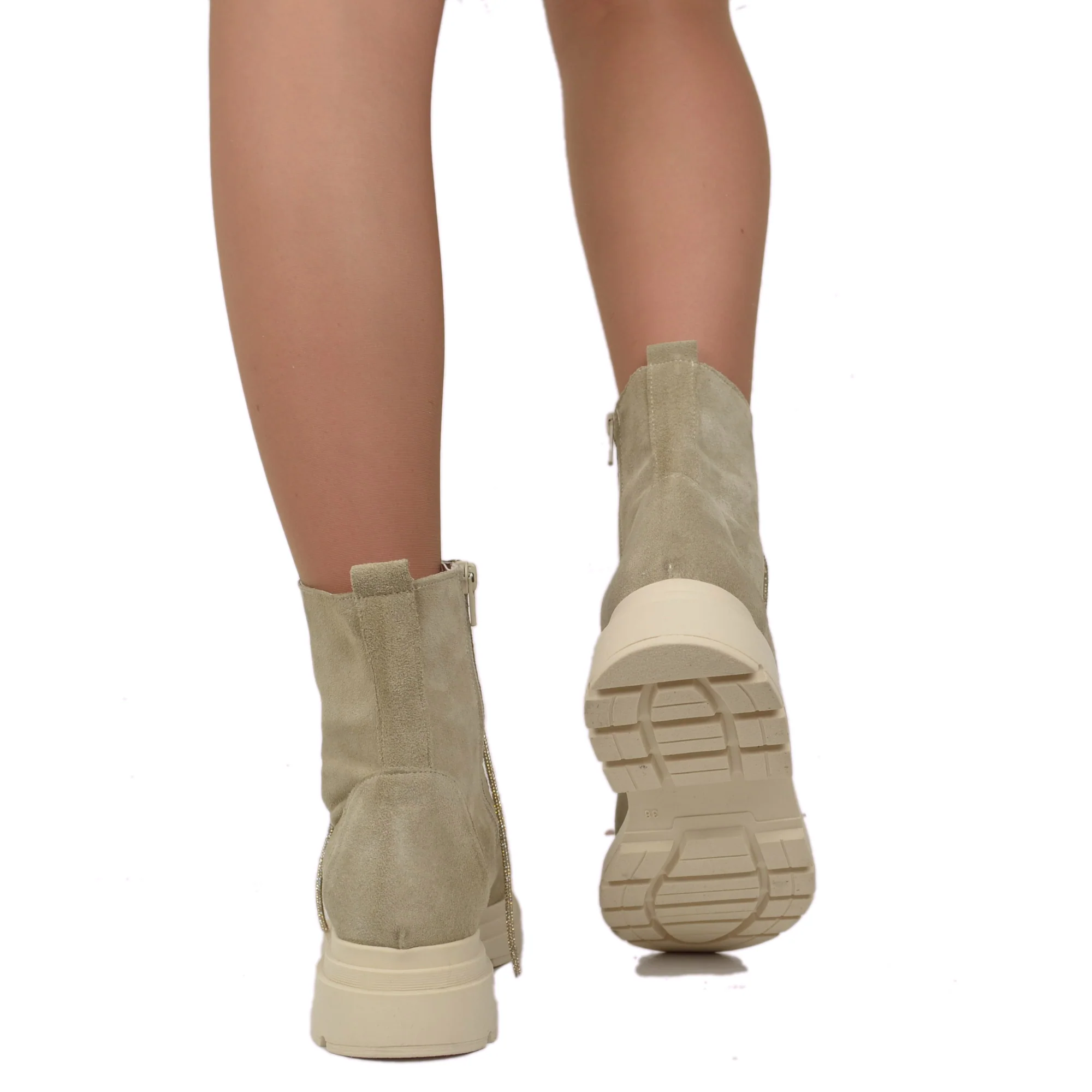 Stivaletti Biker Scamosciati Beige con Strass e Zip Laterale