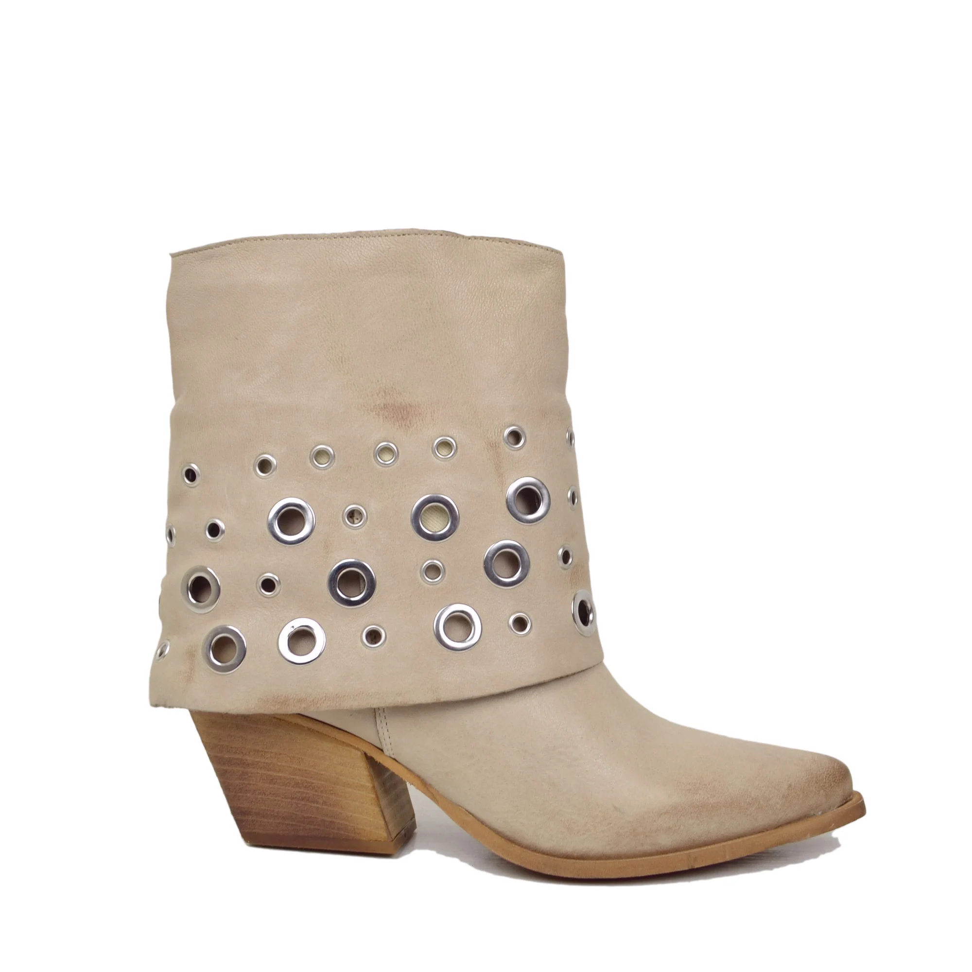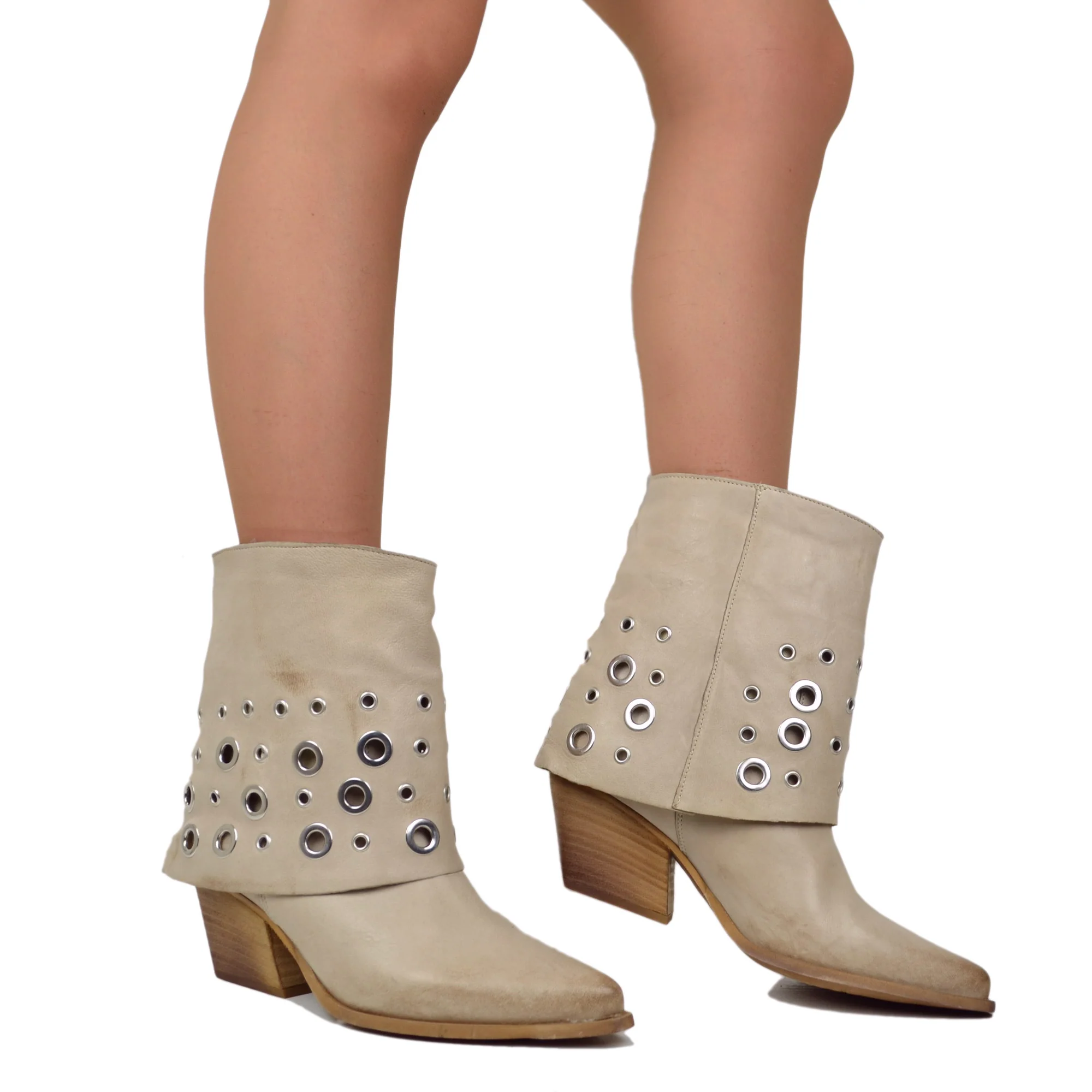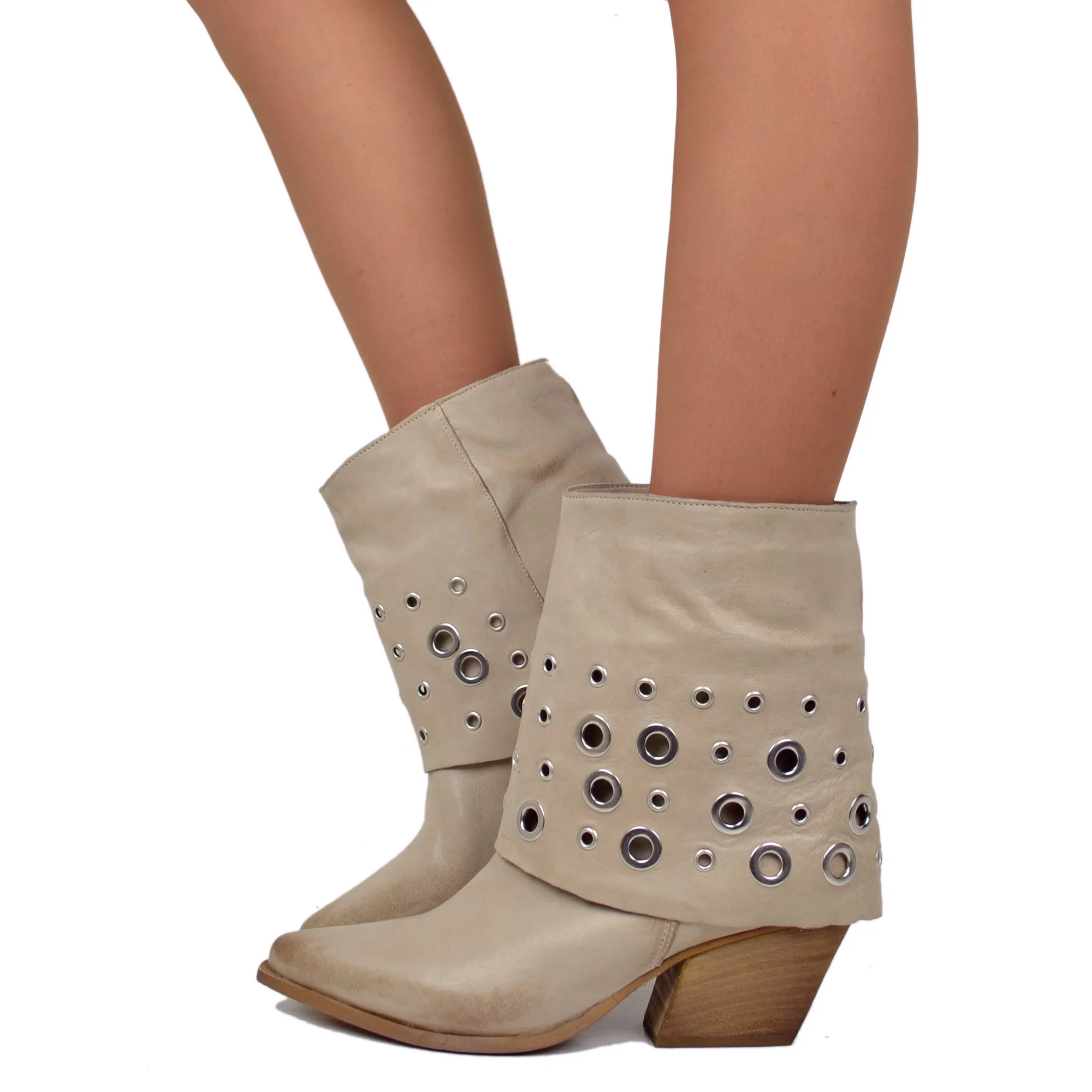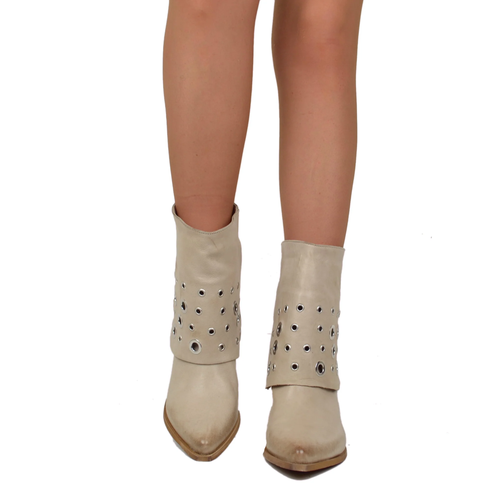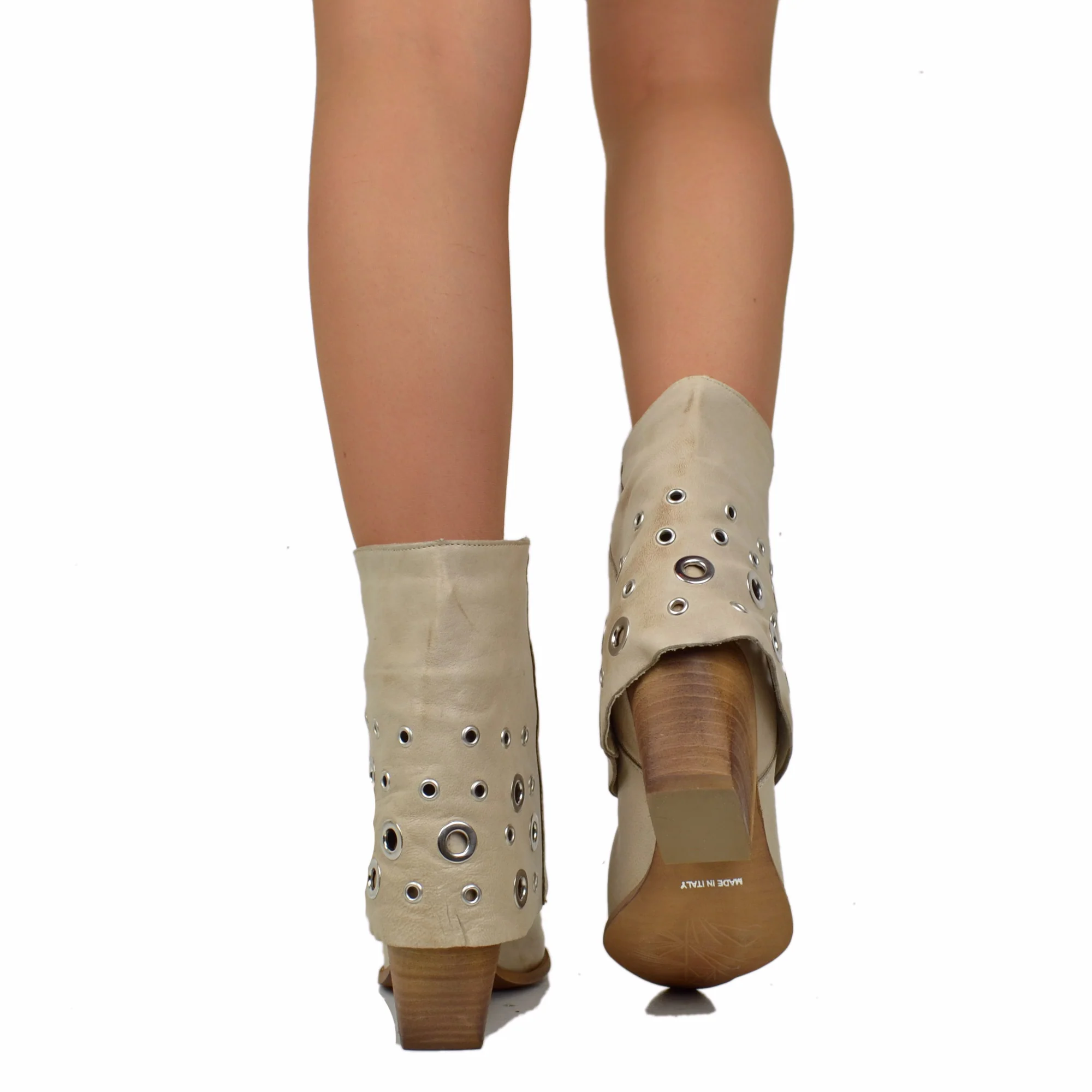 Stivaletti con Ghetta e Borchie Argentate alla Caviglia Vera Pelle Rag Panna Tacco 7 cm