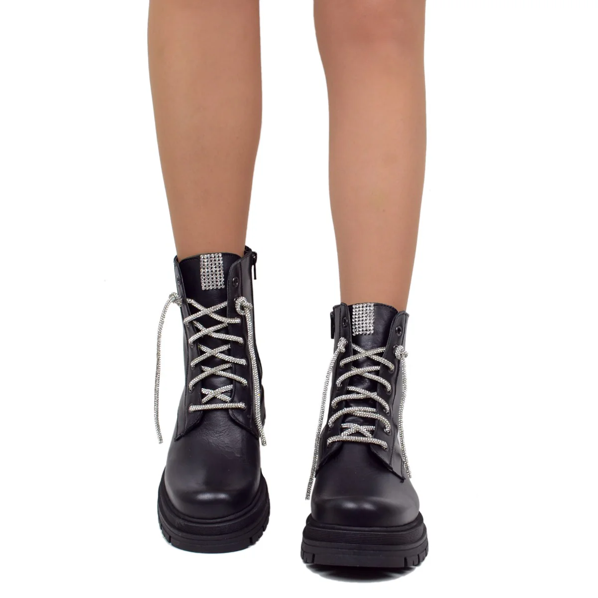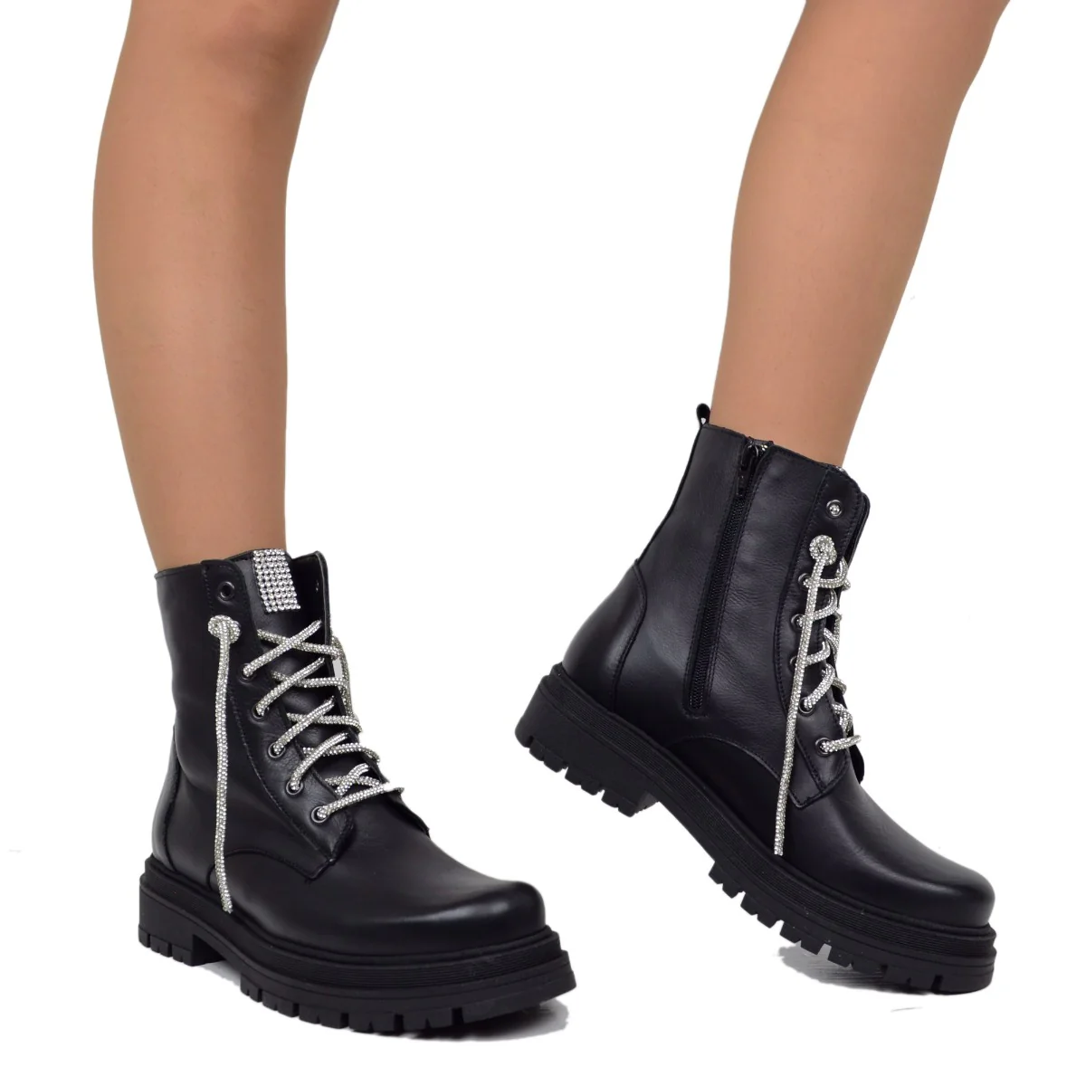 Stivaletti Donna Biker con Strass e Zip Laterale Made in Italy