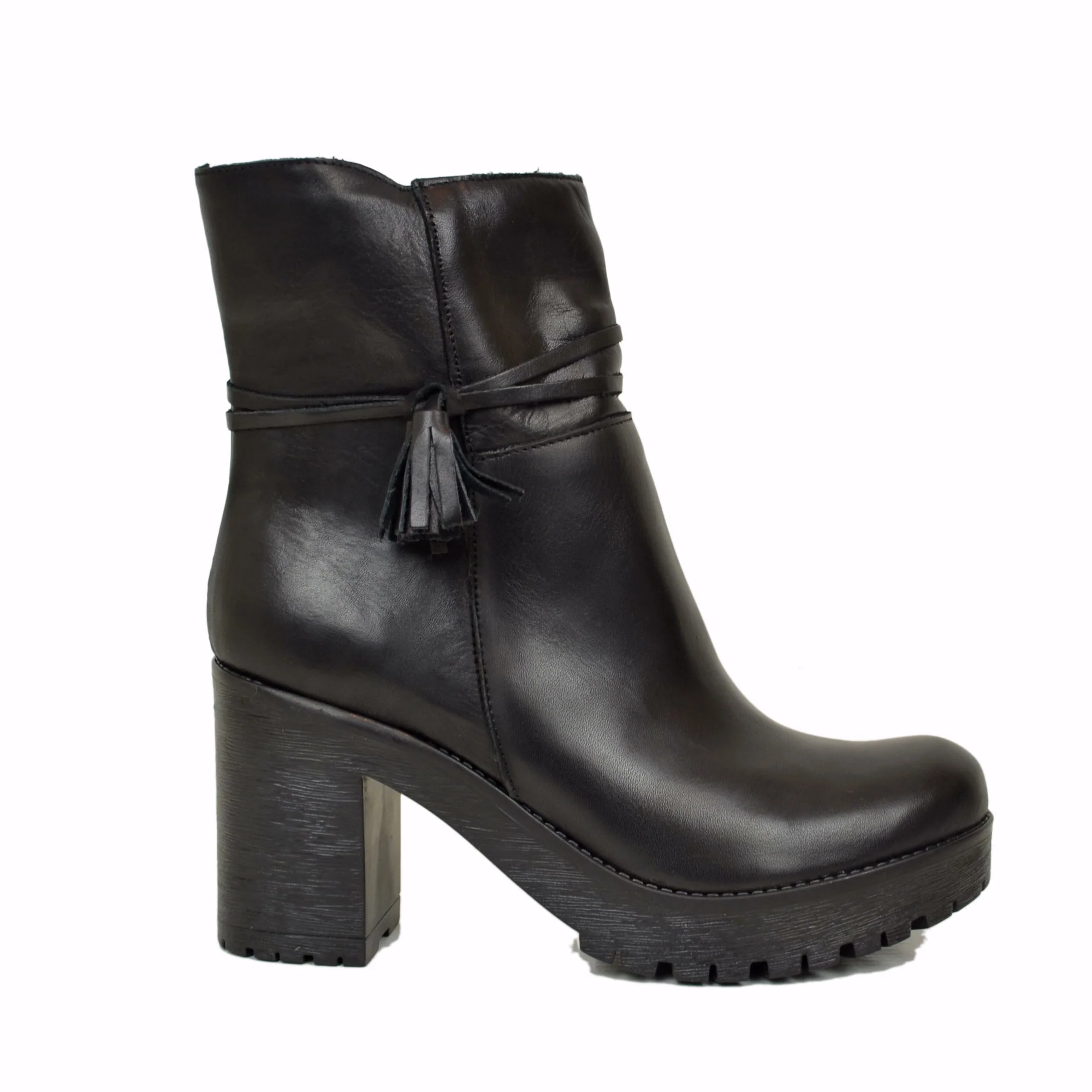 Stivaletti da donna neri con zip. Realizzati in pelle italiana e nappina laterale, un mix di eleganza e praticità, perfetti per aggiungere un tocco di stile al tuo look.