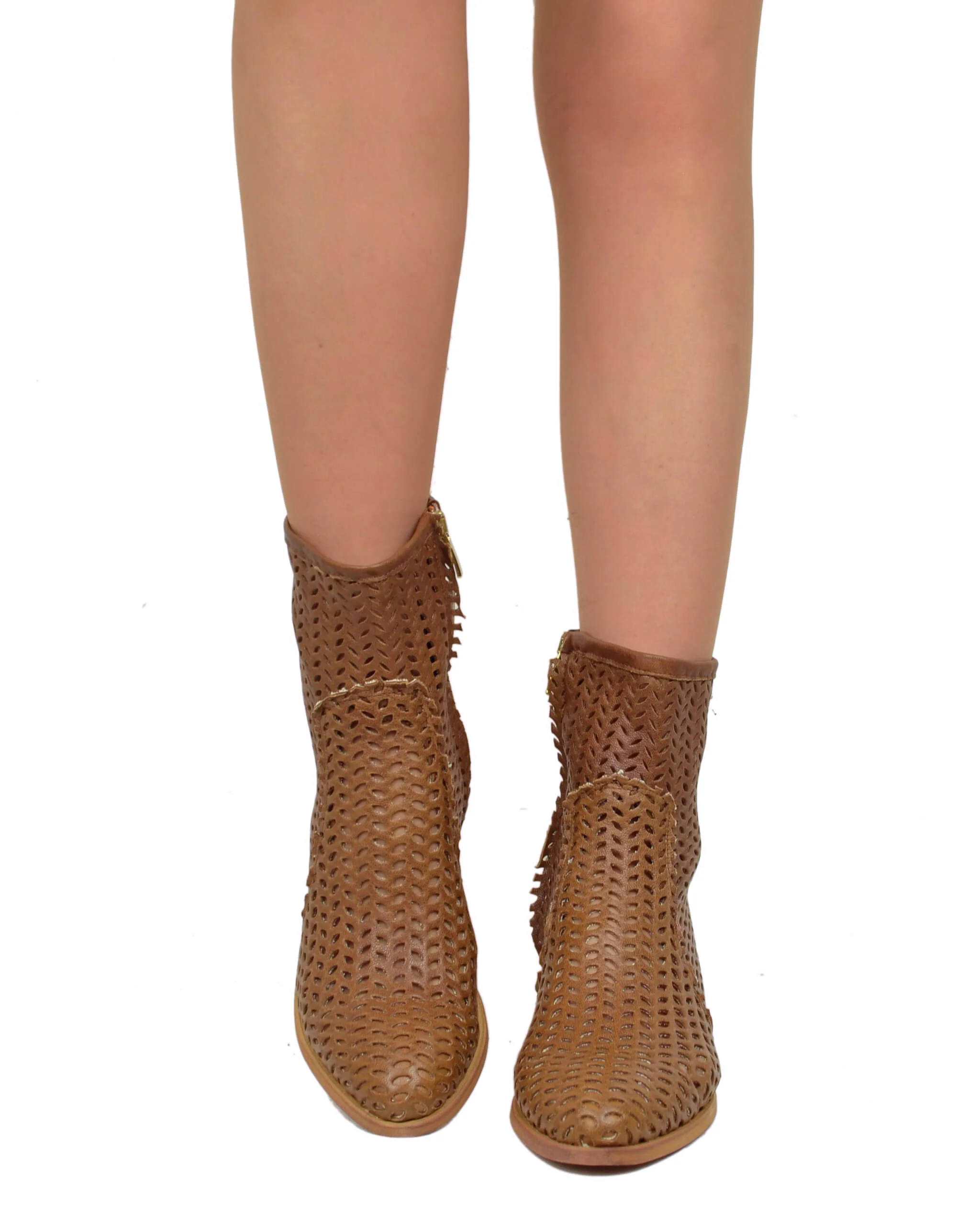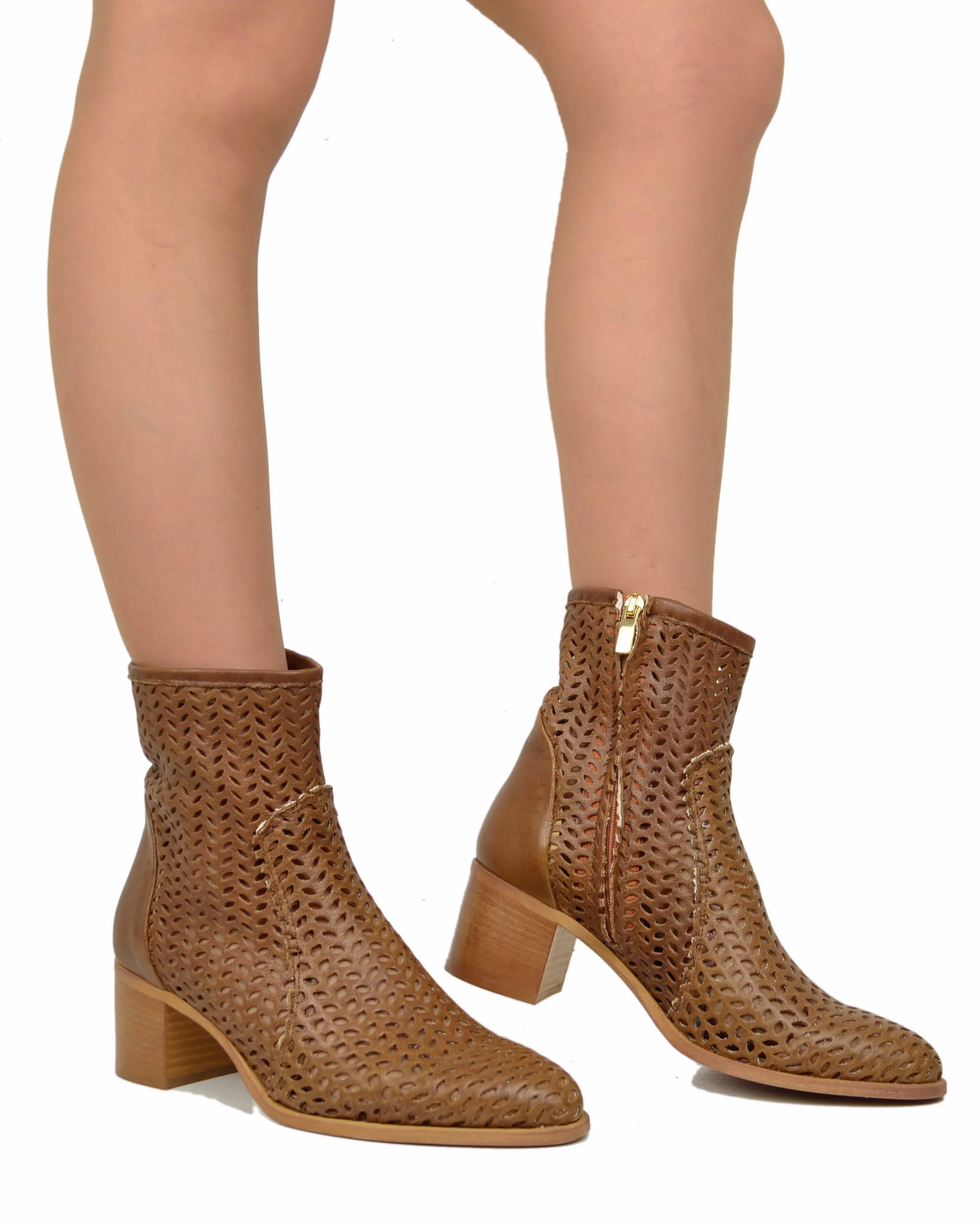 Stivaletti Donna Tacco Medio Cuoio Traforati con Zip Made in Italy