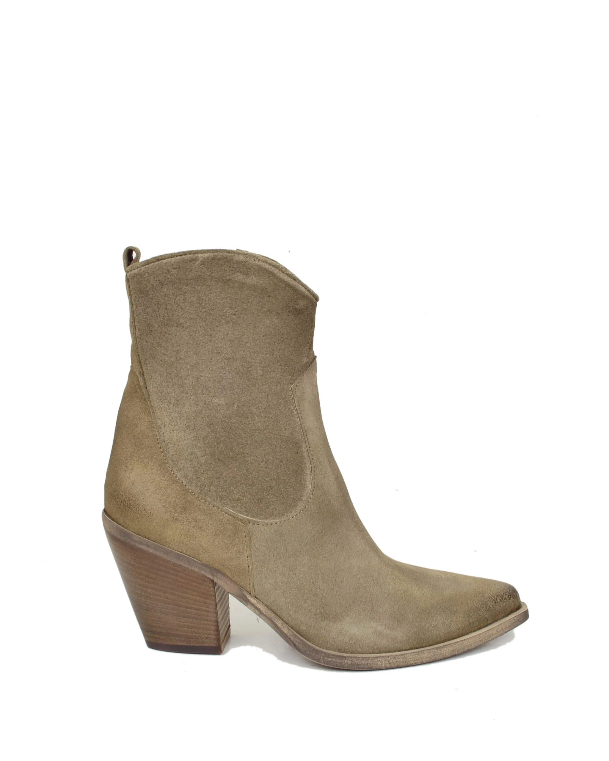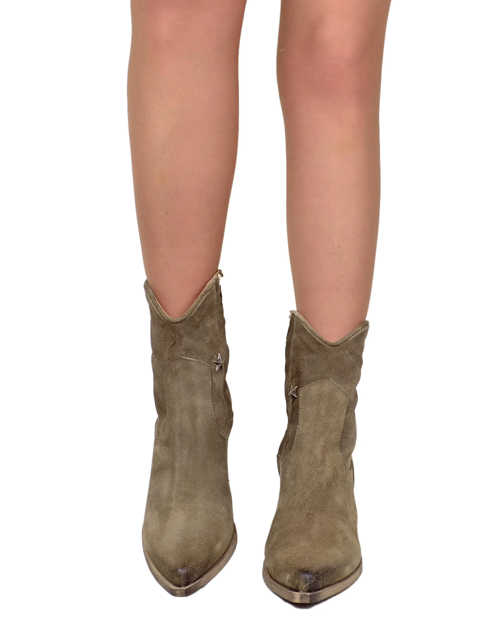 Stivaletti estivi in pelle scamosciata taupe, leggeri e comodi. Con tacco di 9 cm, donano una silhouette elegante. Perfetti per ogni occasione, regalando un tocco di stile e femminilitร . Ideali per camminare comodamente grazie alla stabilitร del tacco e la morbidezza della pelle.