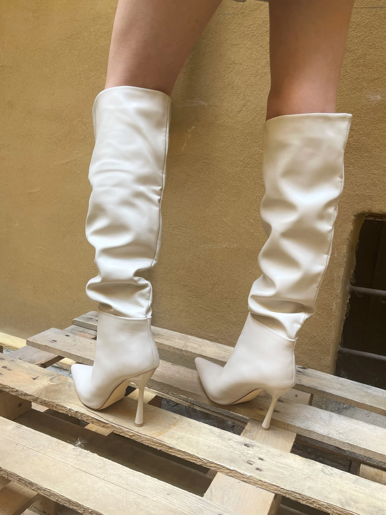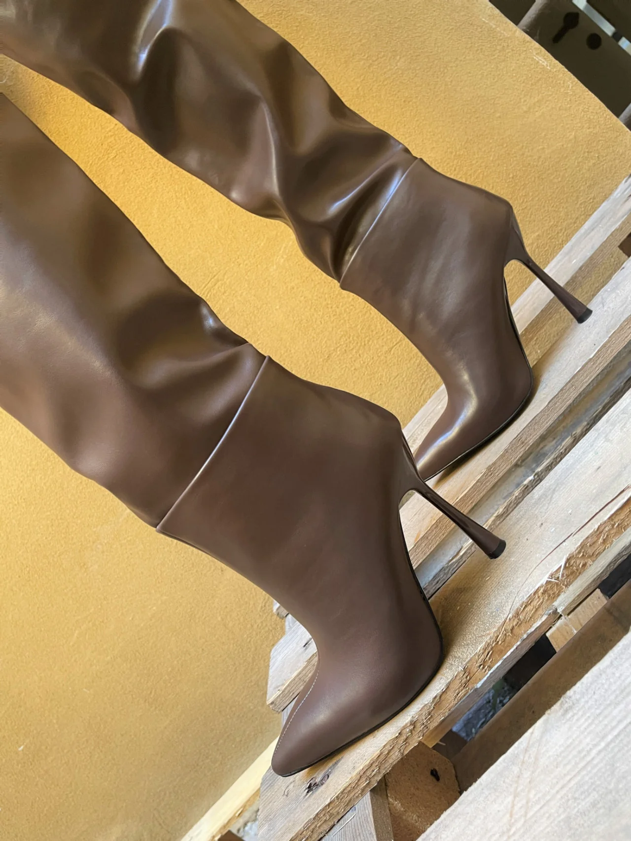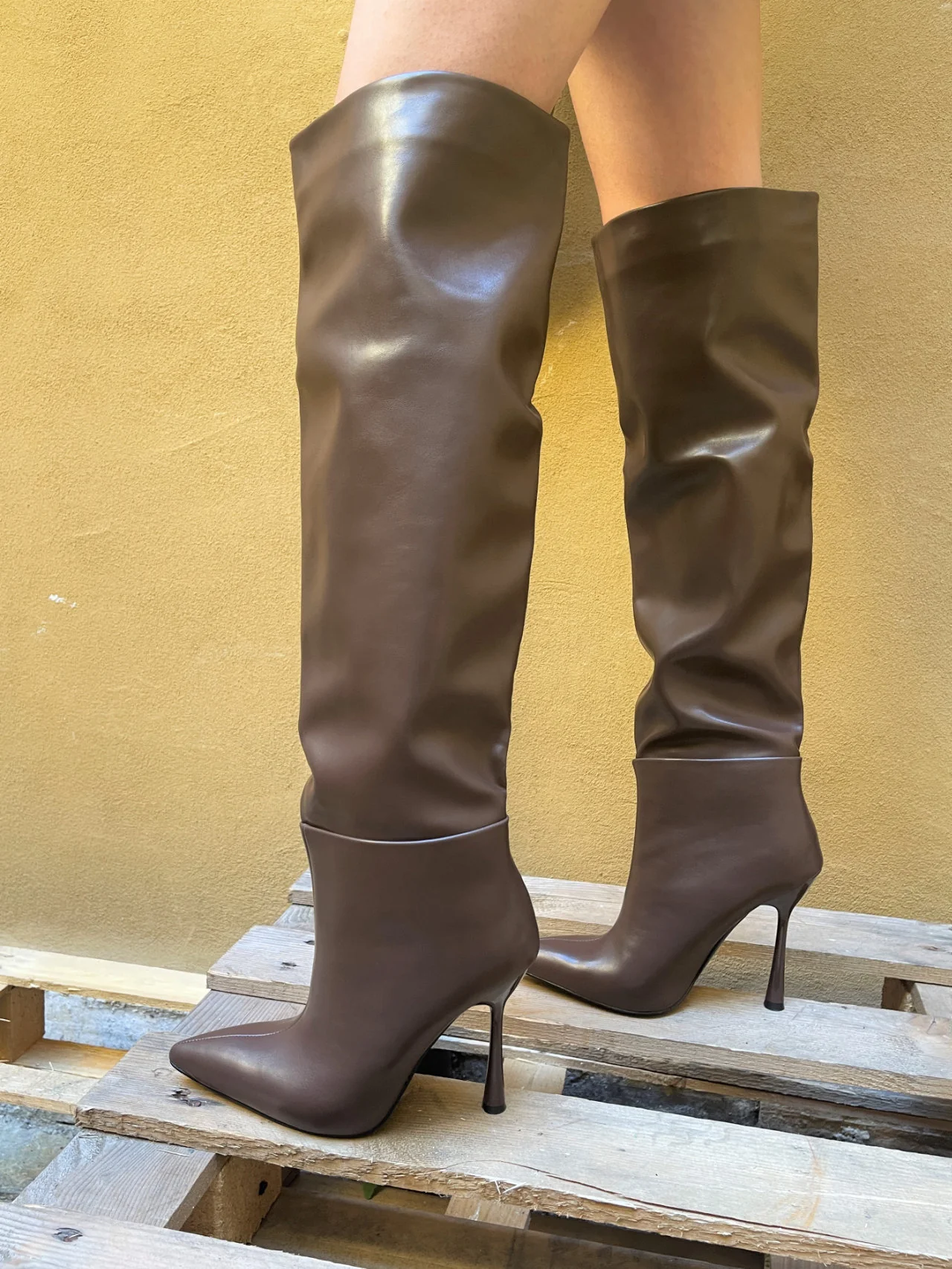 - Stivali da donna alti di gamba con tacco fino, in finta pelle morbida dal look fashion e trendy