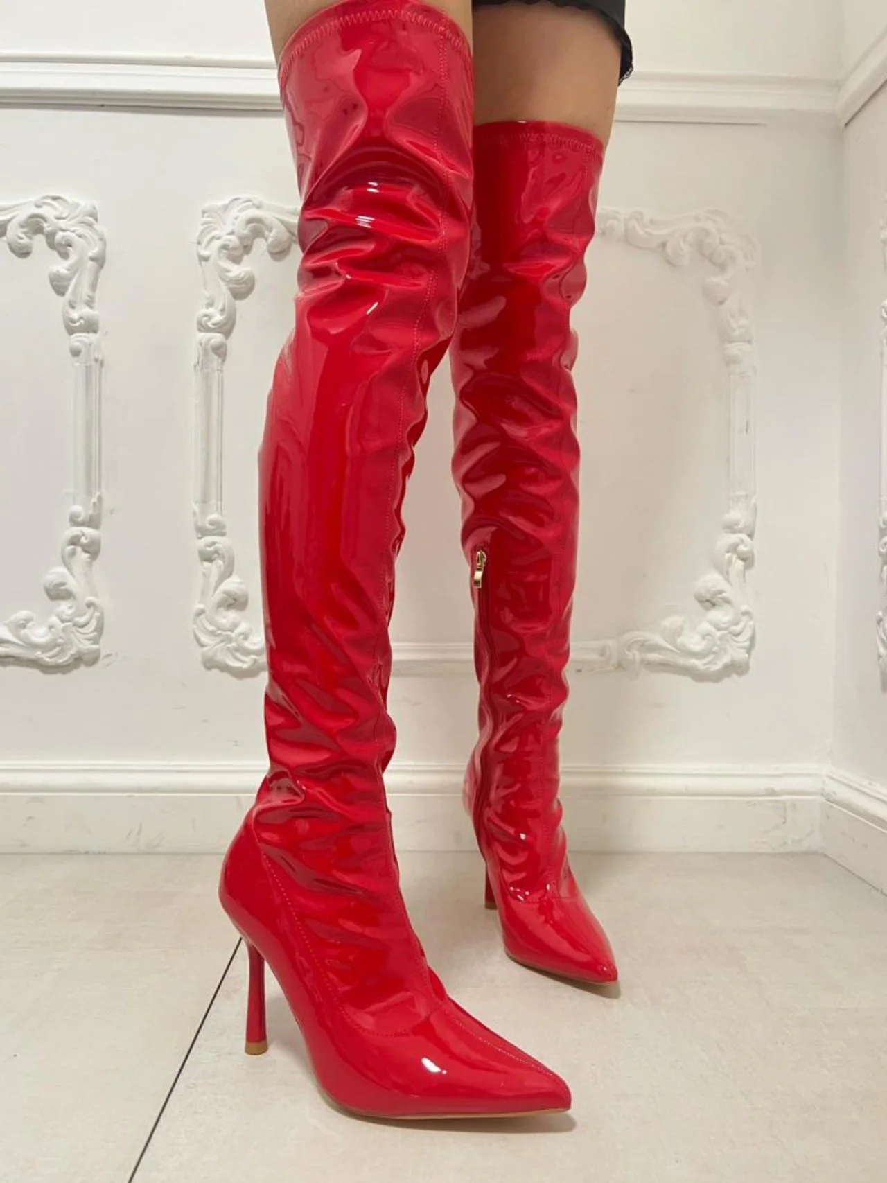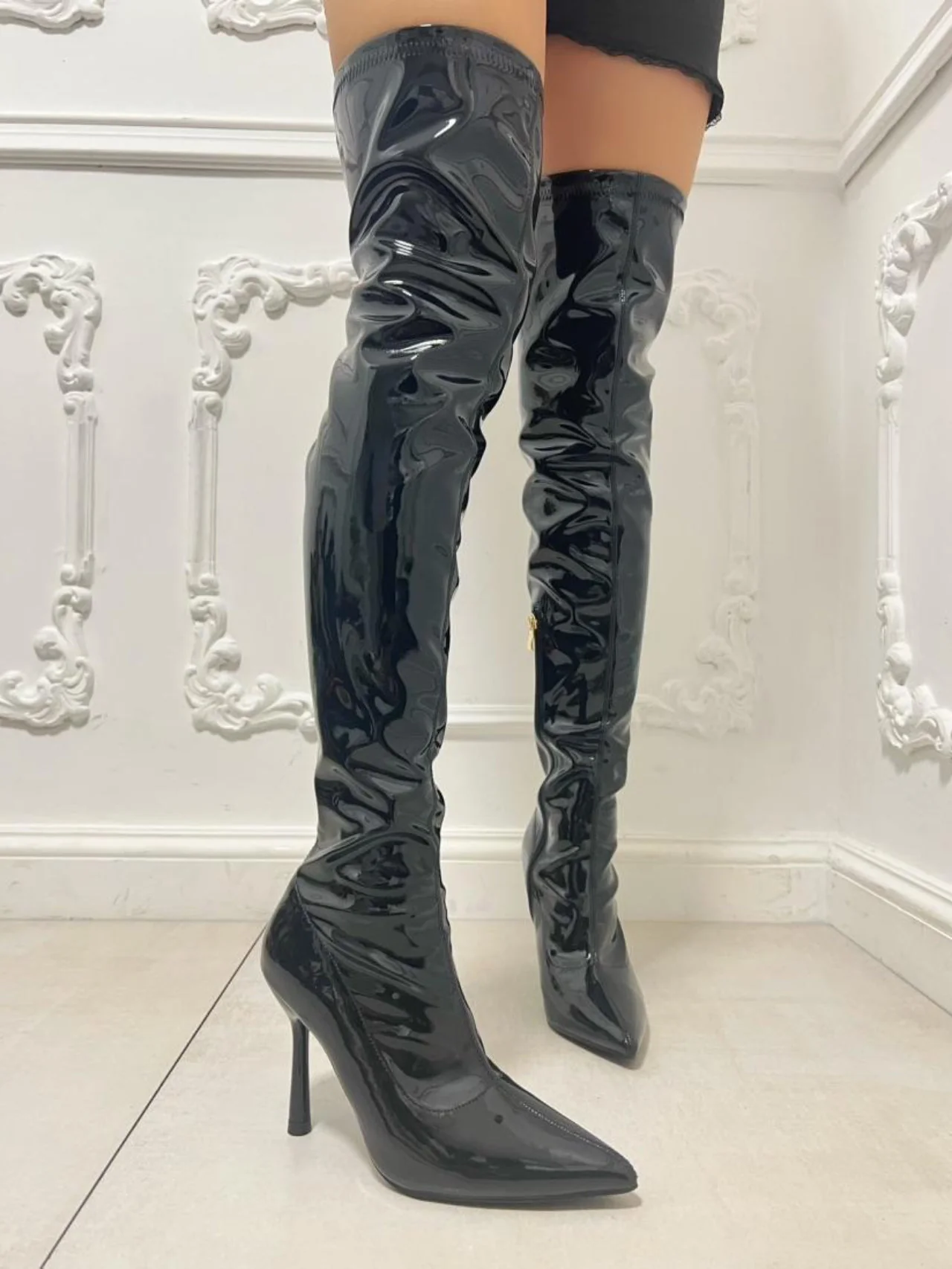 - Gli stivali alti di gamba lucidi da donna rappresentano un vero must, realizzati in materiale ecopelle dal look elegante e alla moda, con tacco fine a spillo e punta.