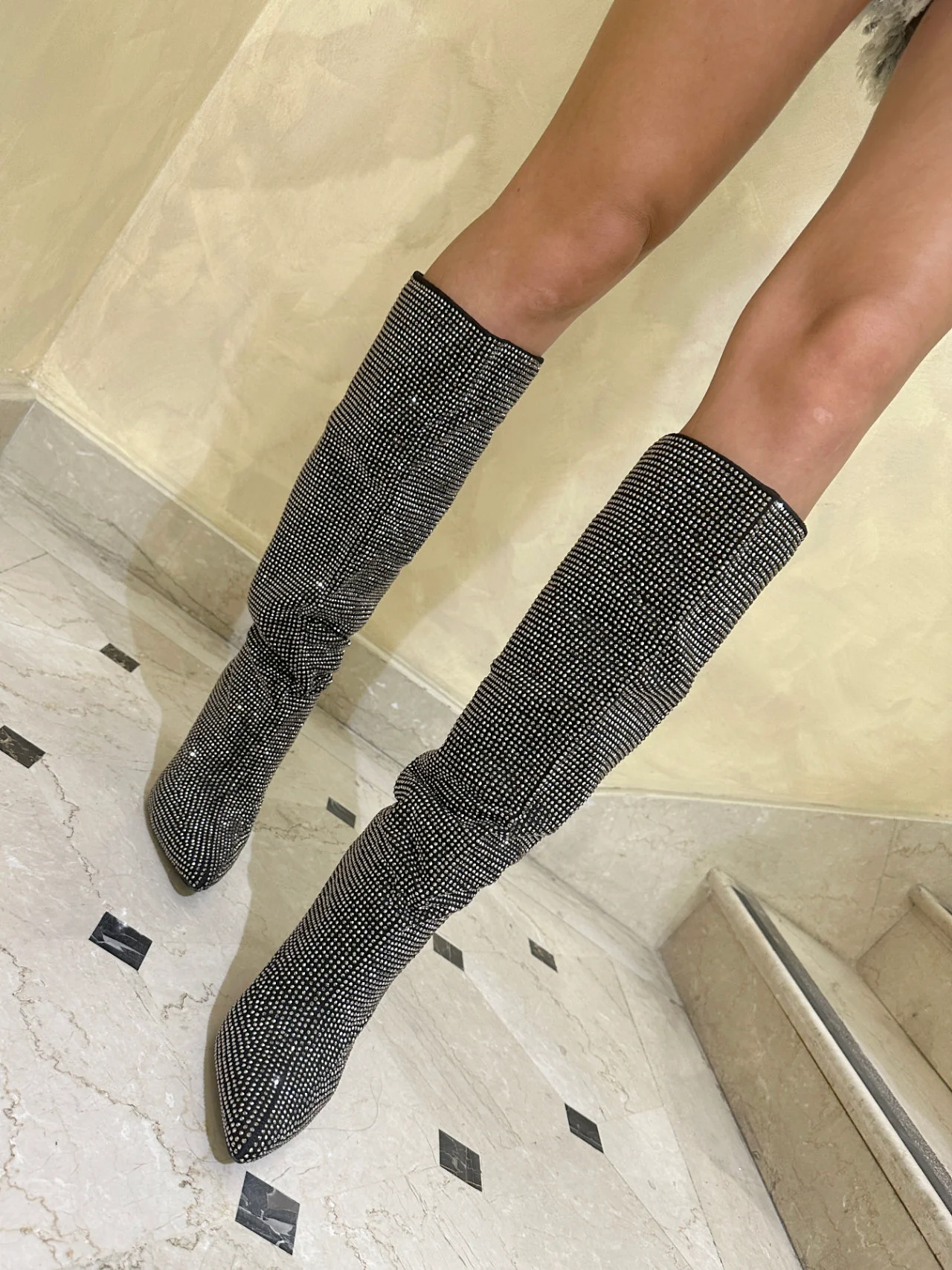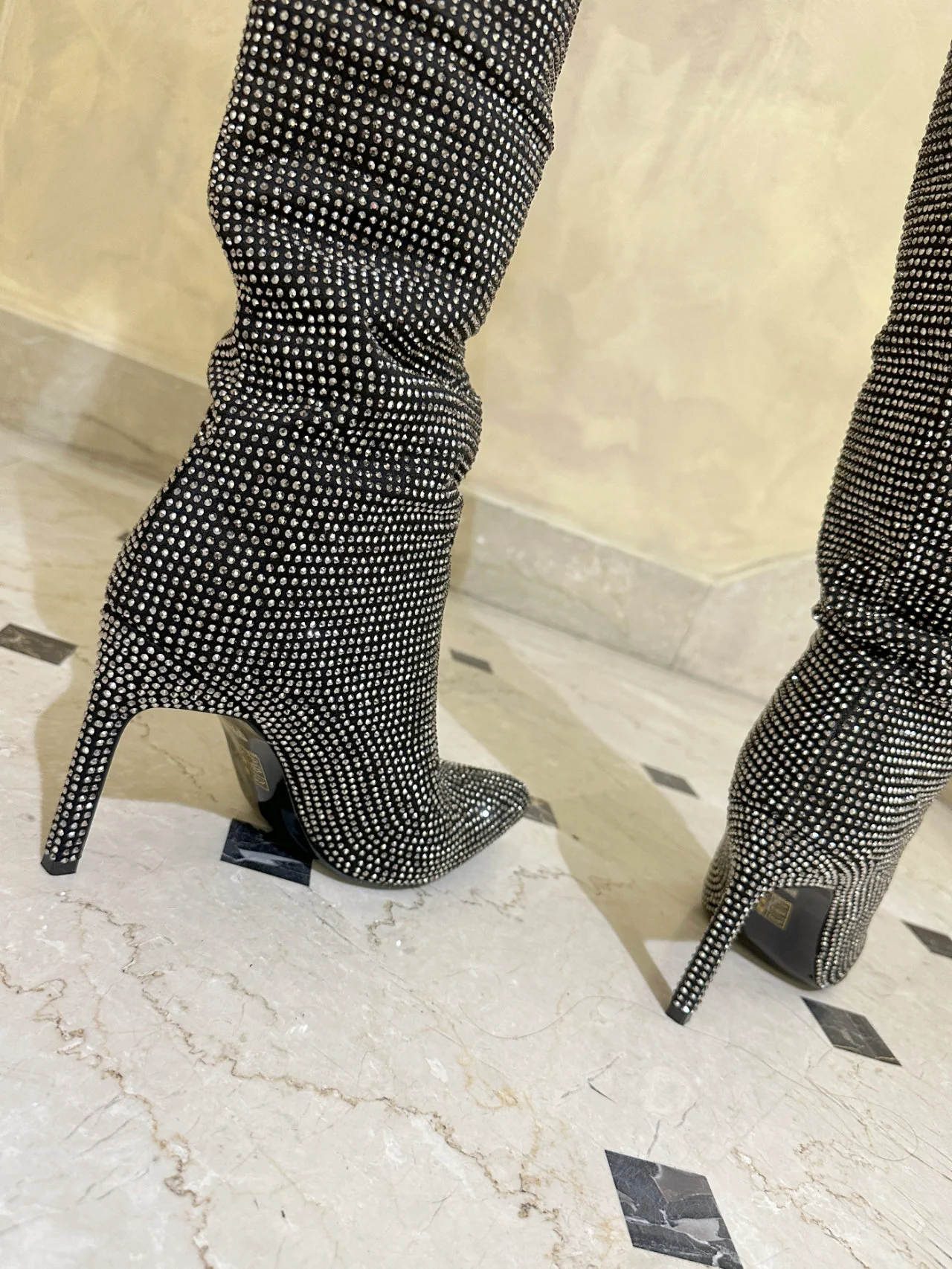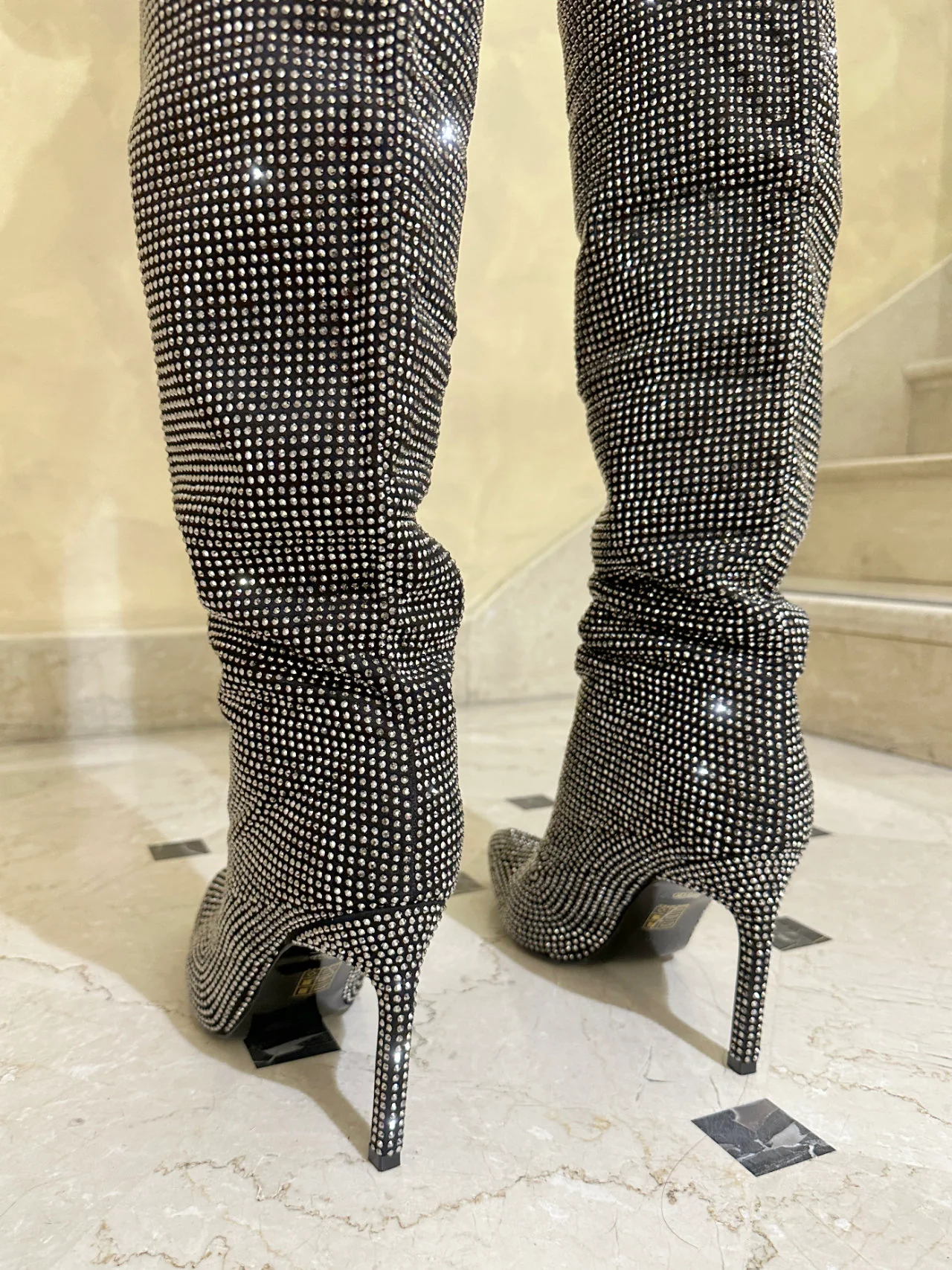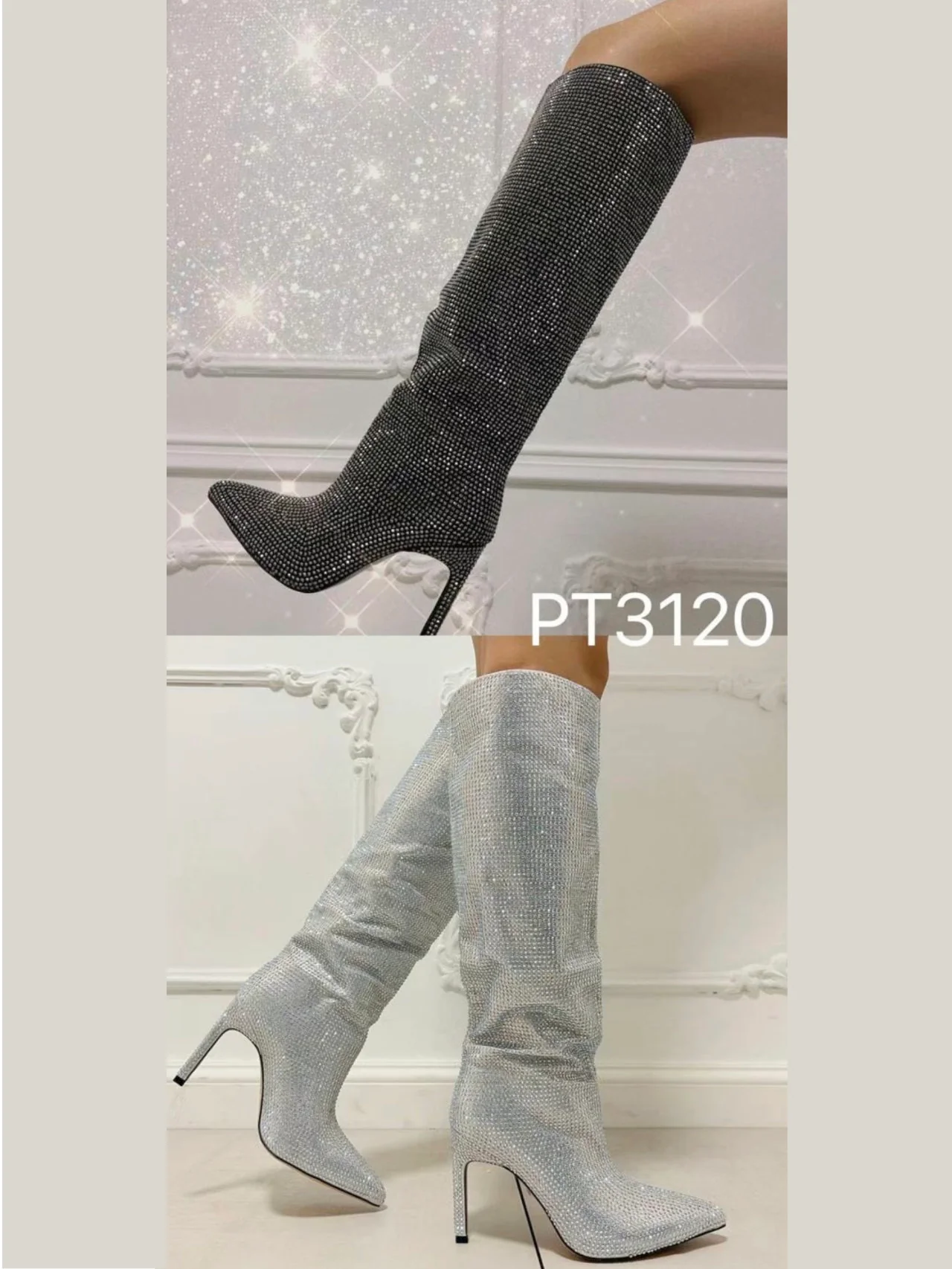 Aggiungi lucentezza ad ogni tuo passo con questi meravigliosi stivali da donna con tacco a spillo ricoperti da strass scintillanti.
