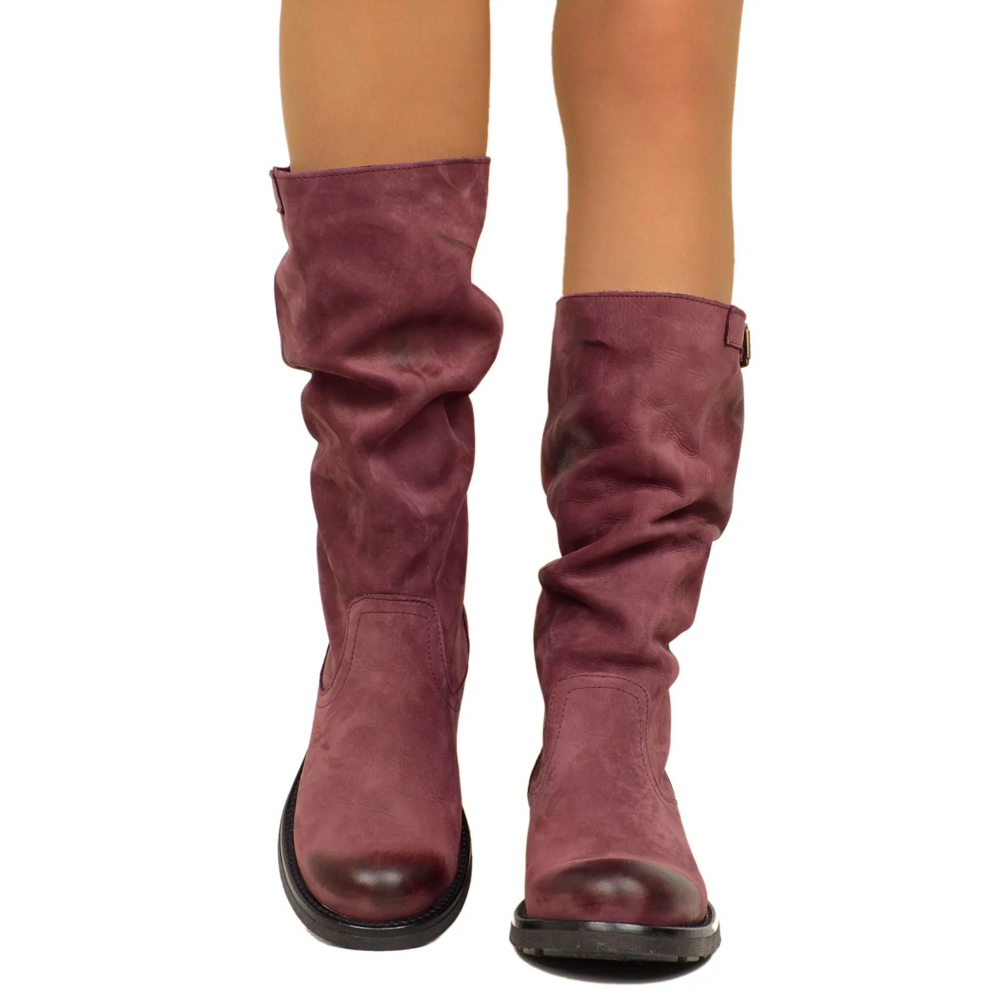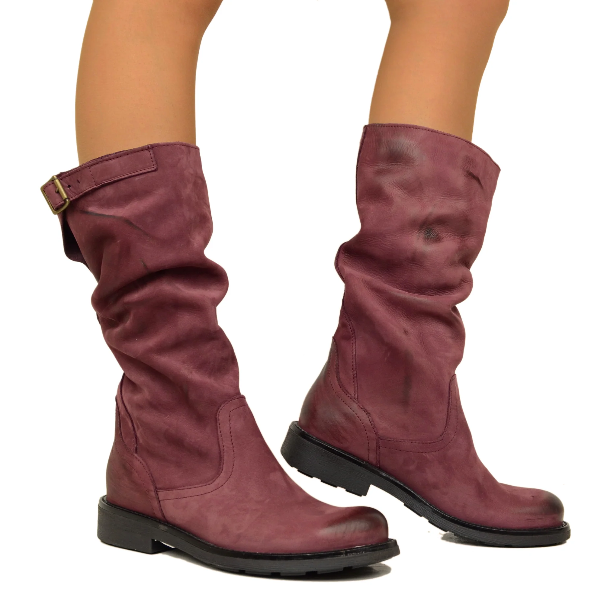 Boots in Vera Pelle Vintage Sfumata, Altezza Metà Polpaccio con Fibbia Laterale.