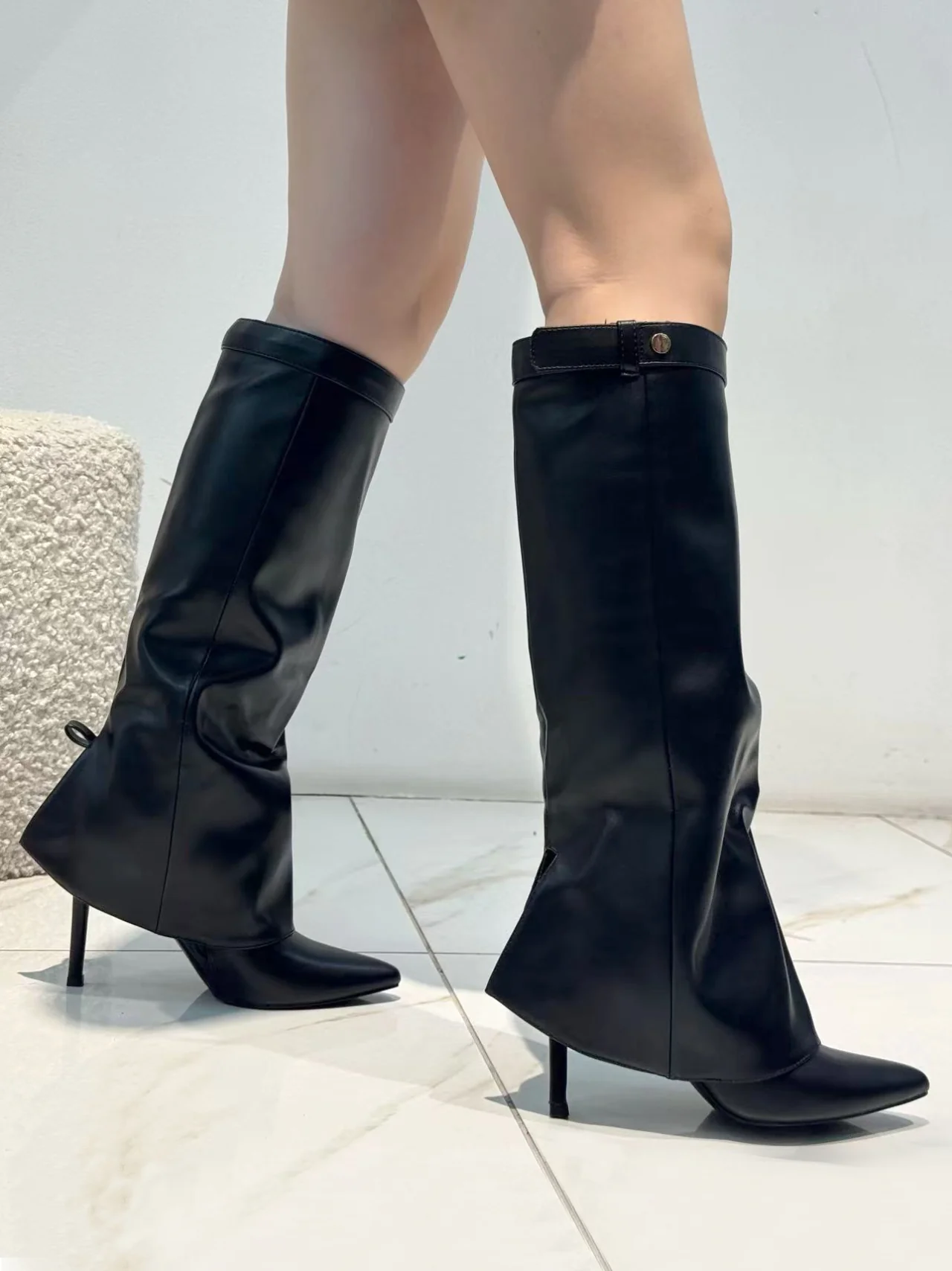 Dona un tocco di eleganza al tuo look con questi stivali dotati di risvolto e tacco a spillo. Realizzati in pelle sintetica, combinano praticità e stile per un fascino sempre attuale e sofisticato.