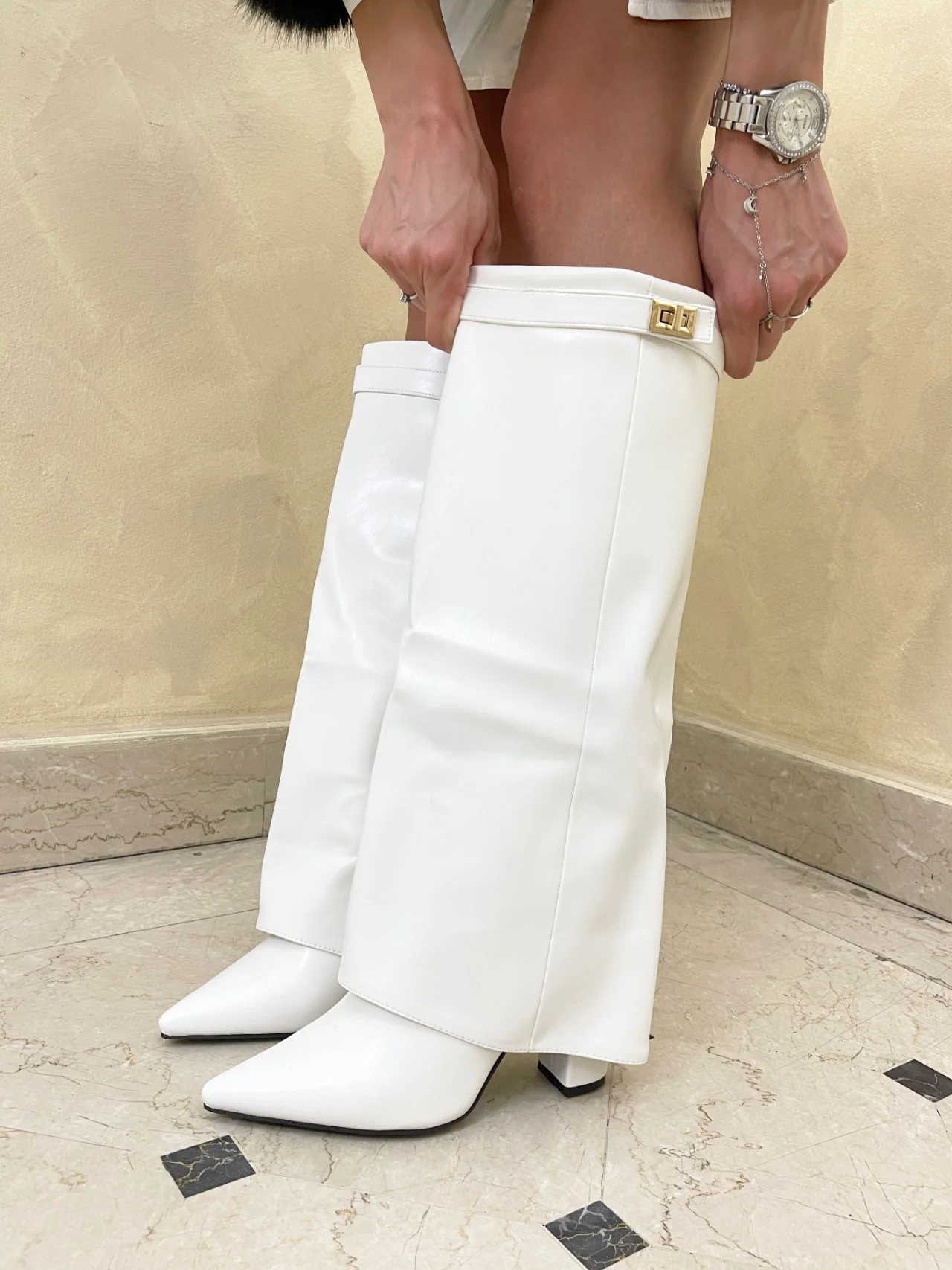 I nostri stivali con risvolto in ecopelle sono l’accessorio perfetto per rendere ogni outfit unico! La fibbia colore oro conferisce un tocco glamour, mentre il tacco grosso, super comodo, completa il look. Provali subito!