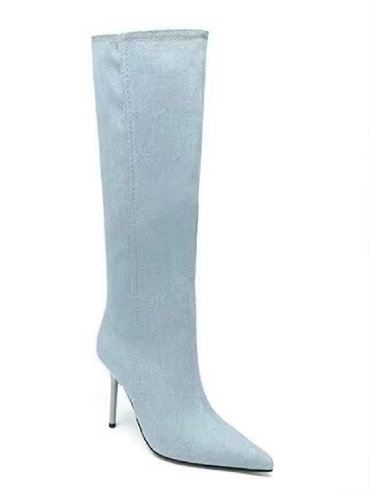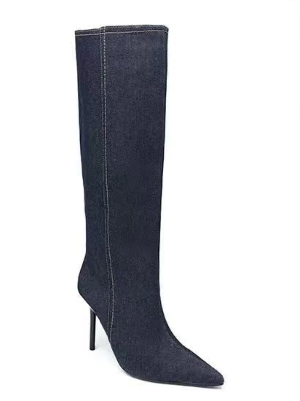 - Stivali in denim con tacco e cerniera per un look moderno e sofisticato. Lo stile che non passa inosservato.