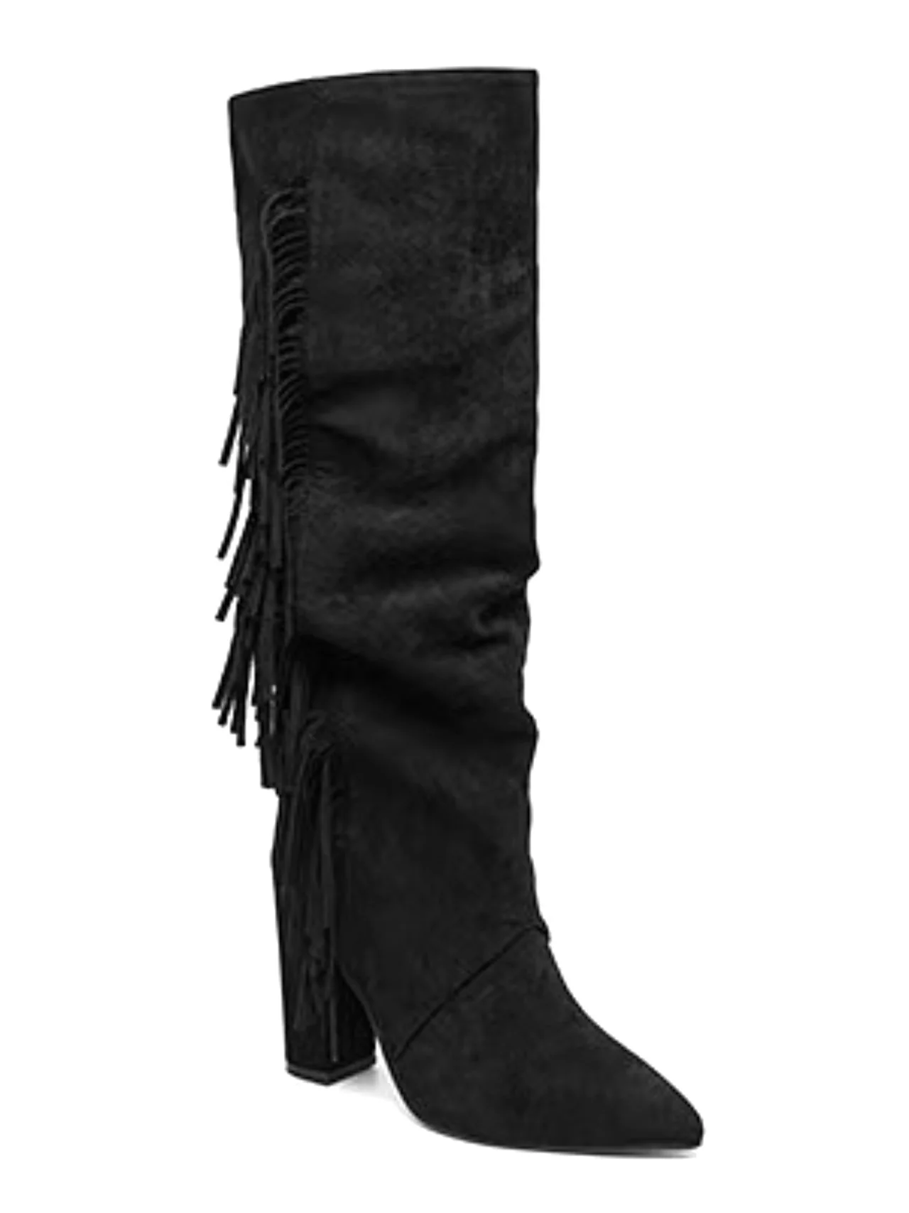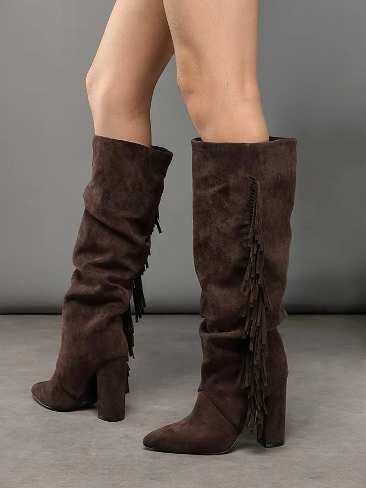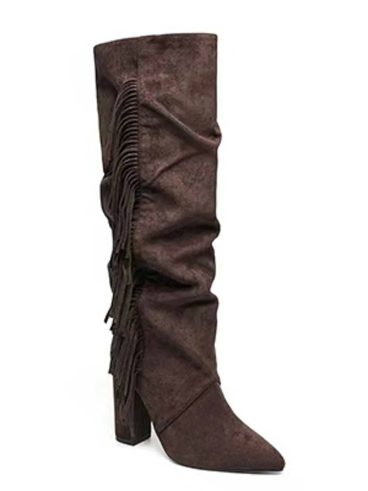 Stivali slouch in scamosciato con frange laterali che aggiungono movimento e stile. Il tacco robusto assicura comodità tutto il giorno, mentre il design rilassato si adatta a qualsiasi occasione. Un pezzo versatile per chi vuole personalità nel proprio look.