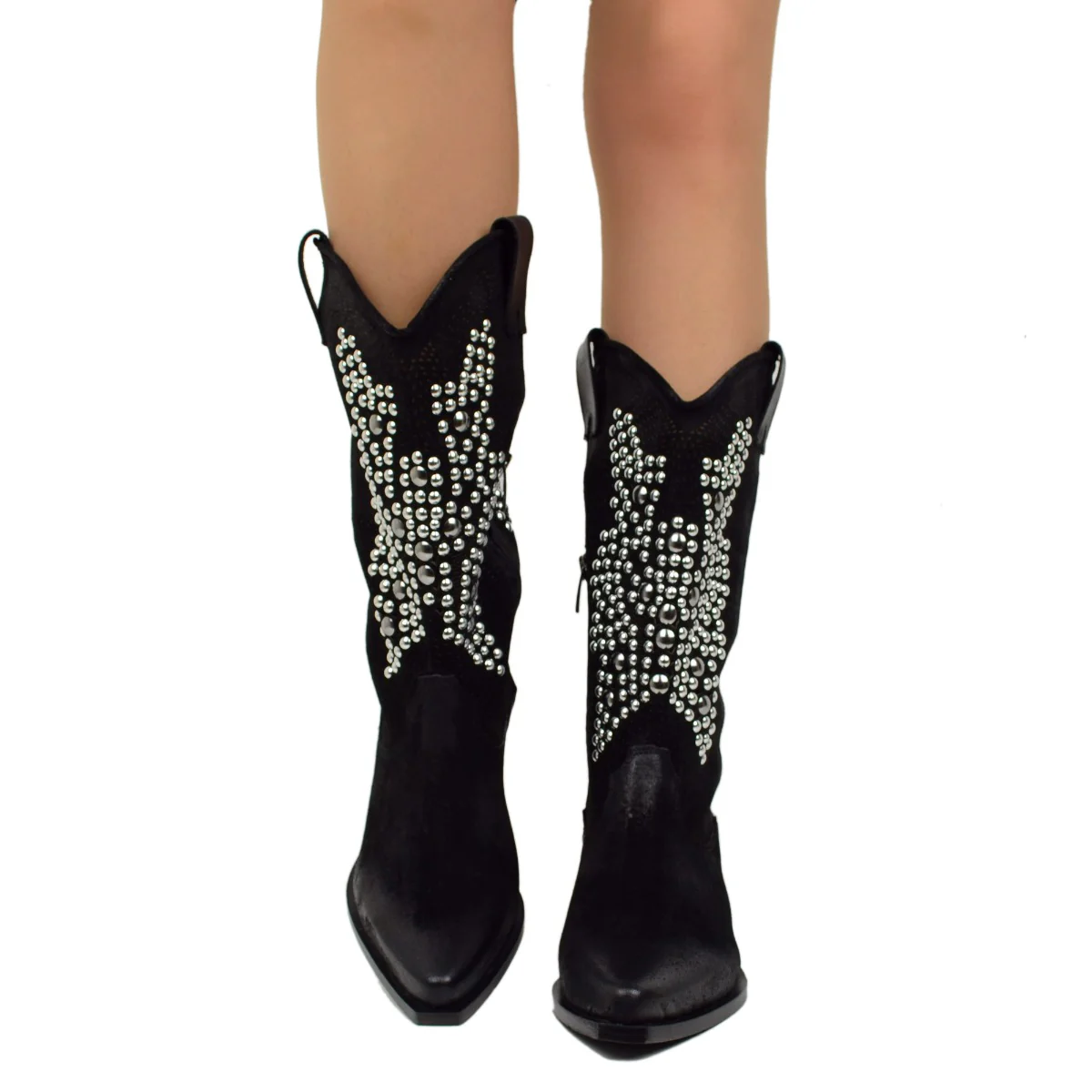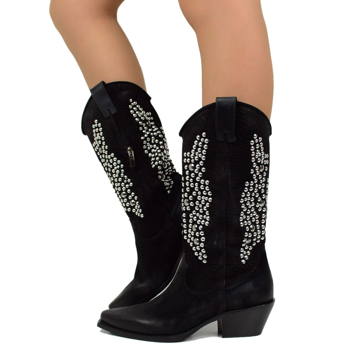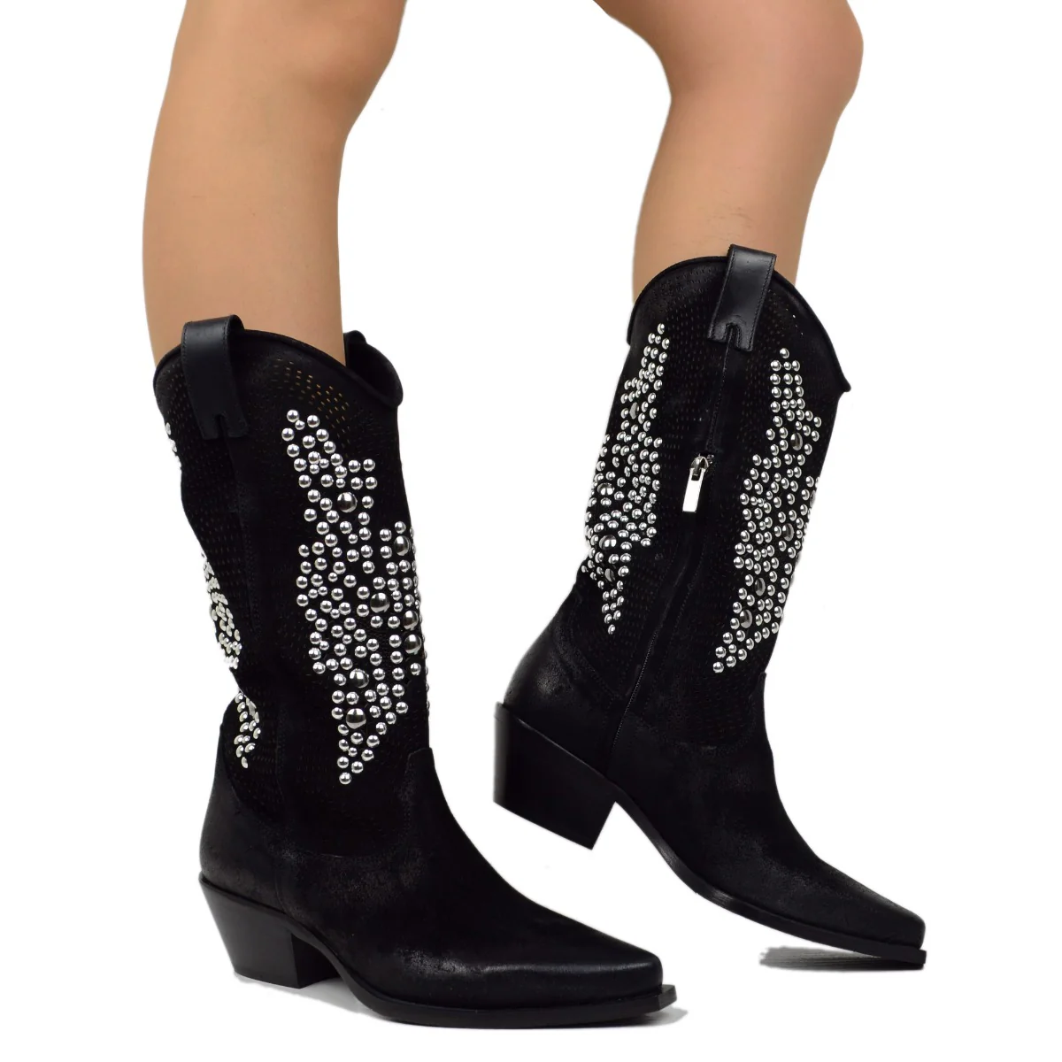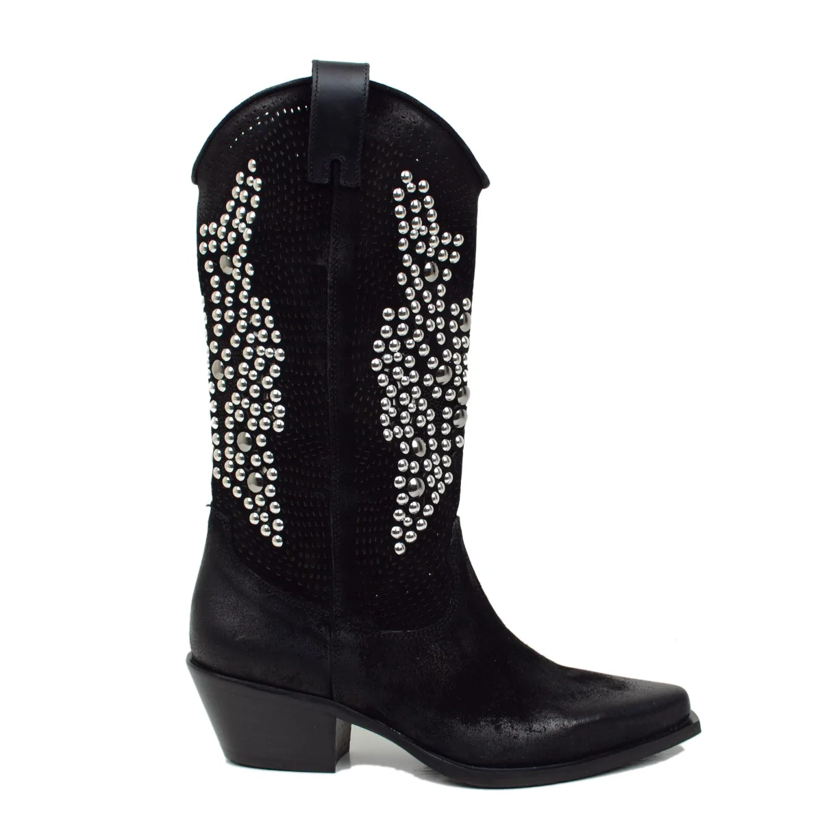 Stivali Texani Traforati Neri in Pelle Scamosciata con Borchie, Made in Italy.