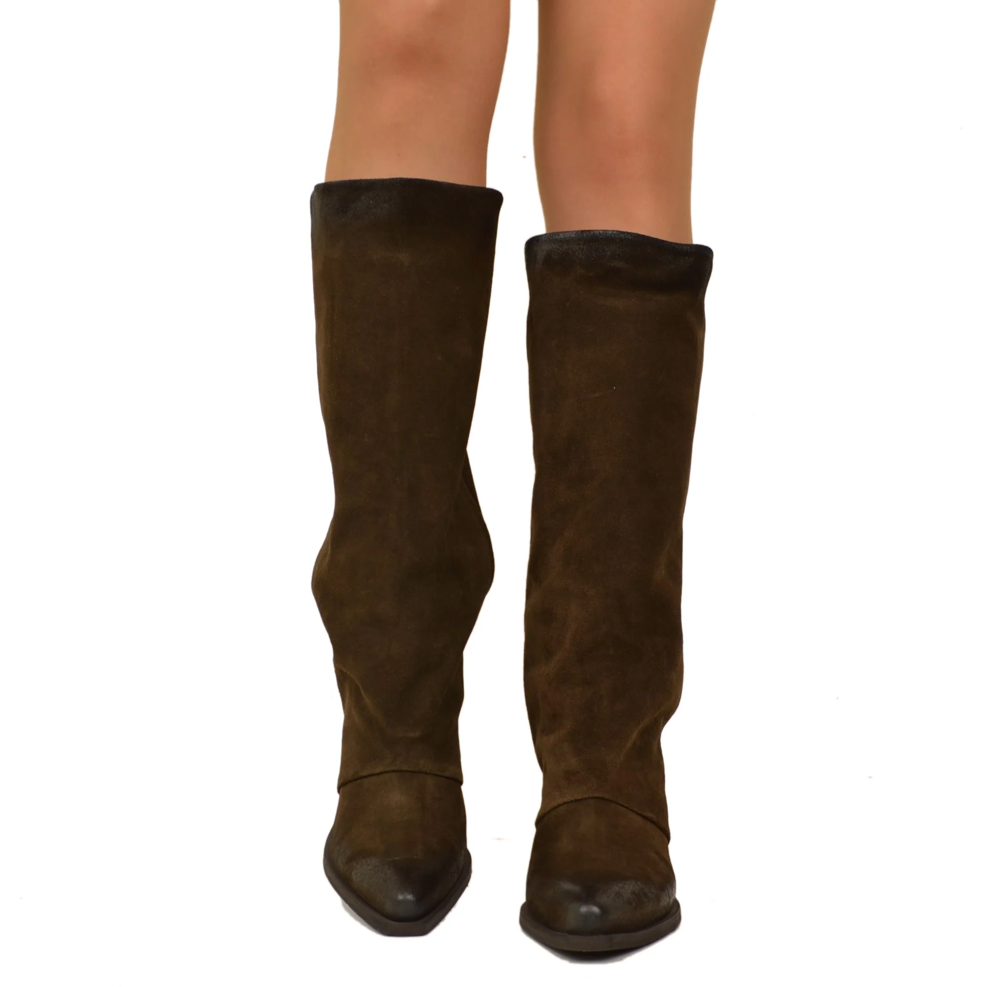Texani Alti con Ghetta Pelle Scamosciata Tacco Alto Marrone