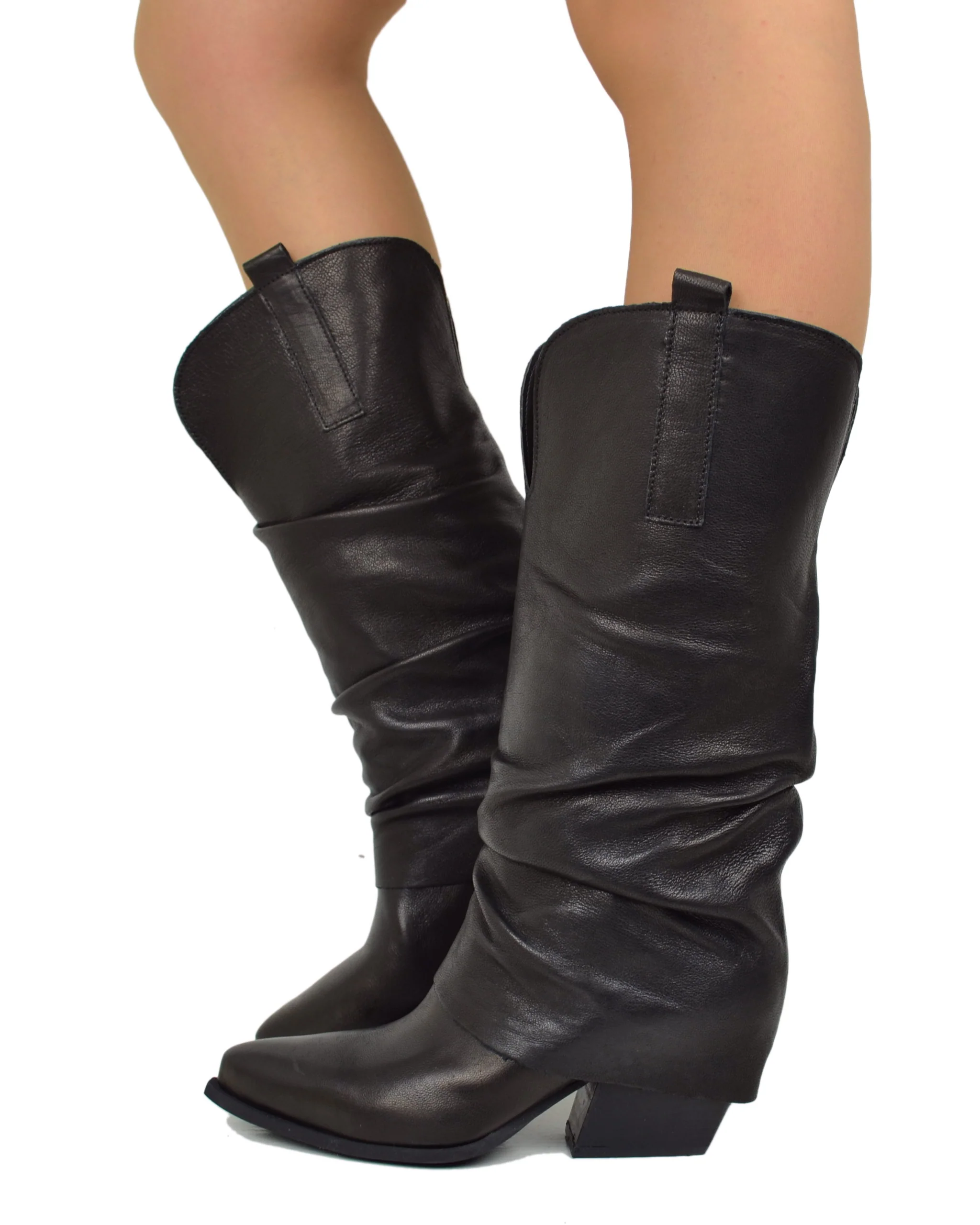 I nostri texani sono realizzati in morbida pelle vera con gambale largo e ghetta morbida per garantire un comfort ottimale. Il tacco da 7 cm dona un tocco di femminilitร mentre la tomaia nera si abbina facilmente a qualsiasi outfit. Perfetti per un look trendy e sofisticato.