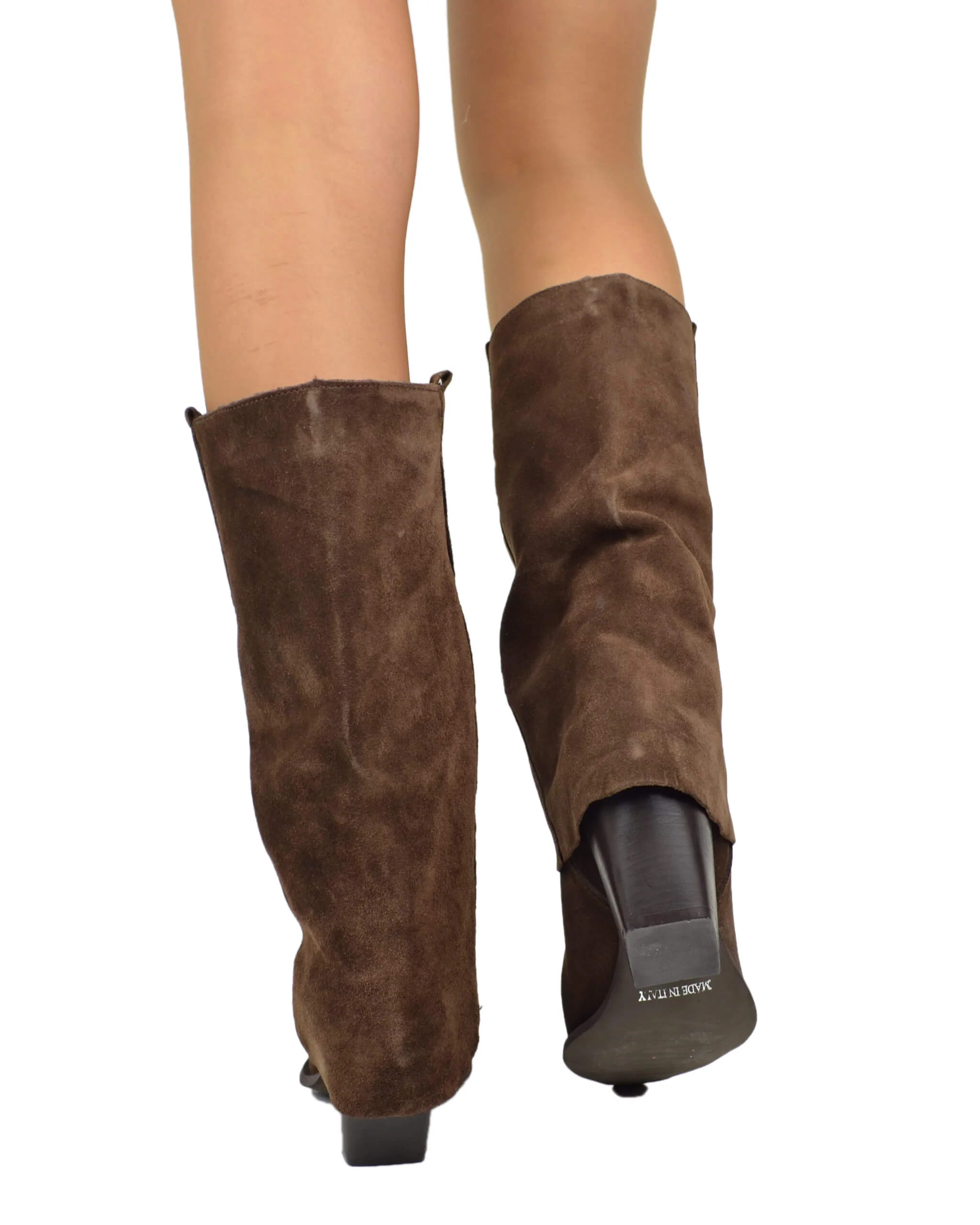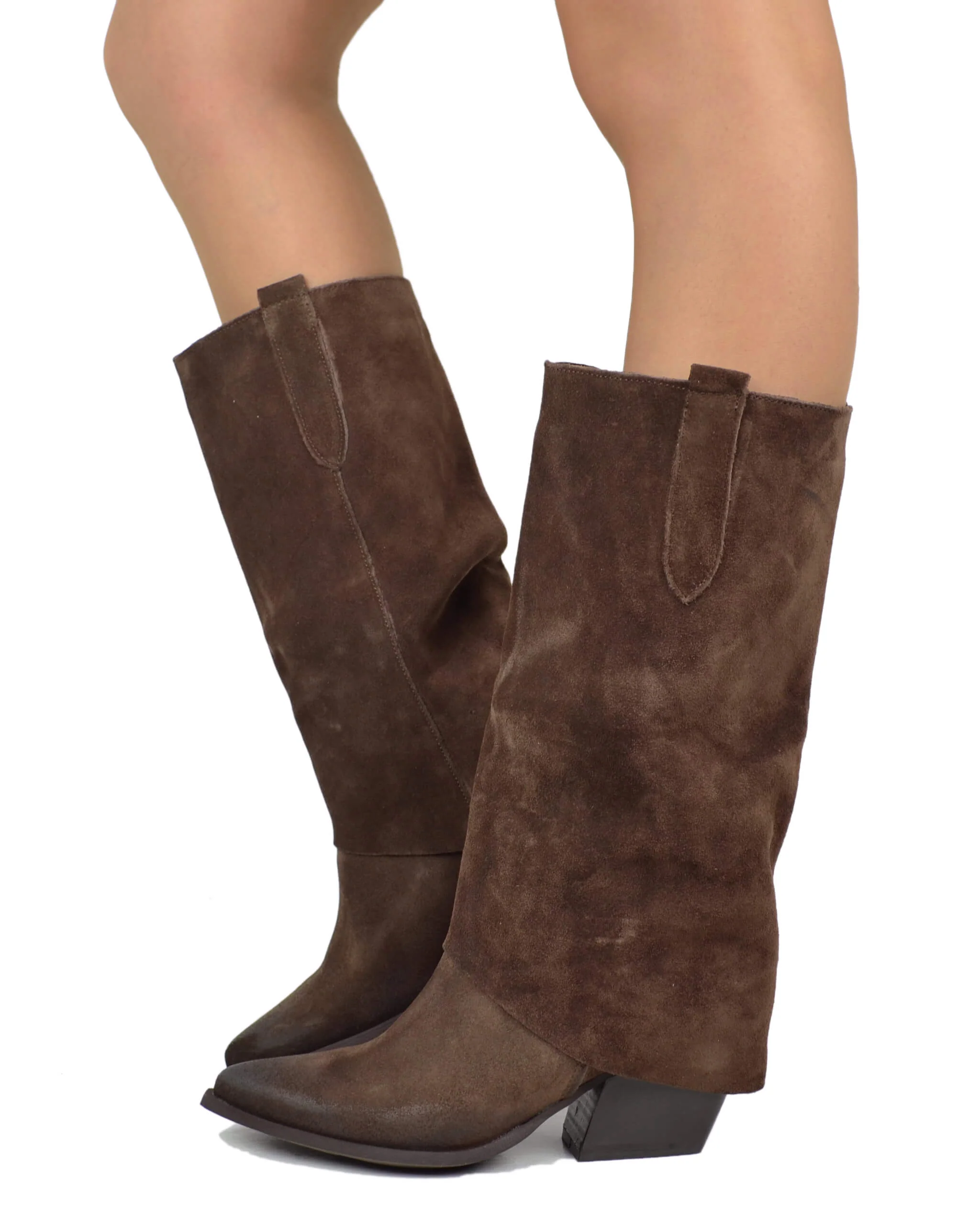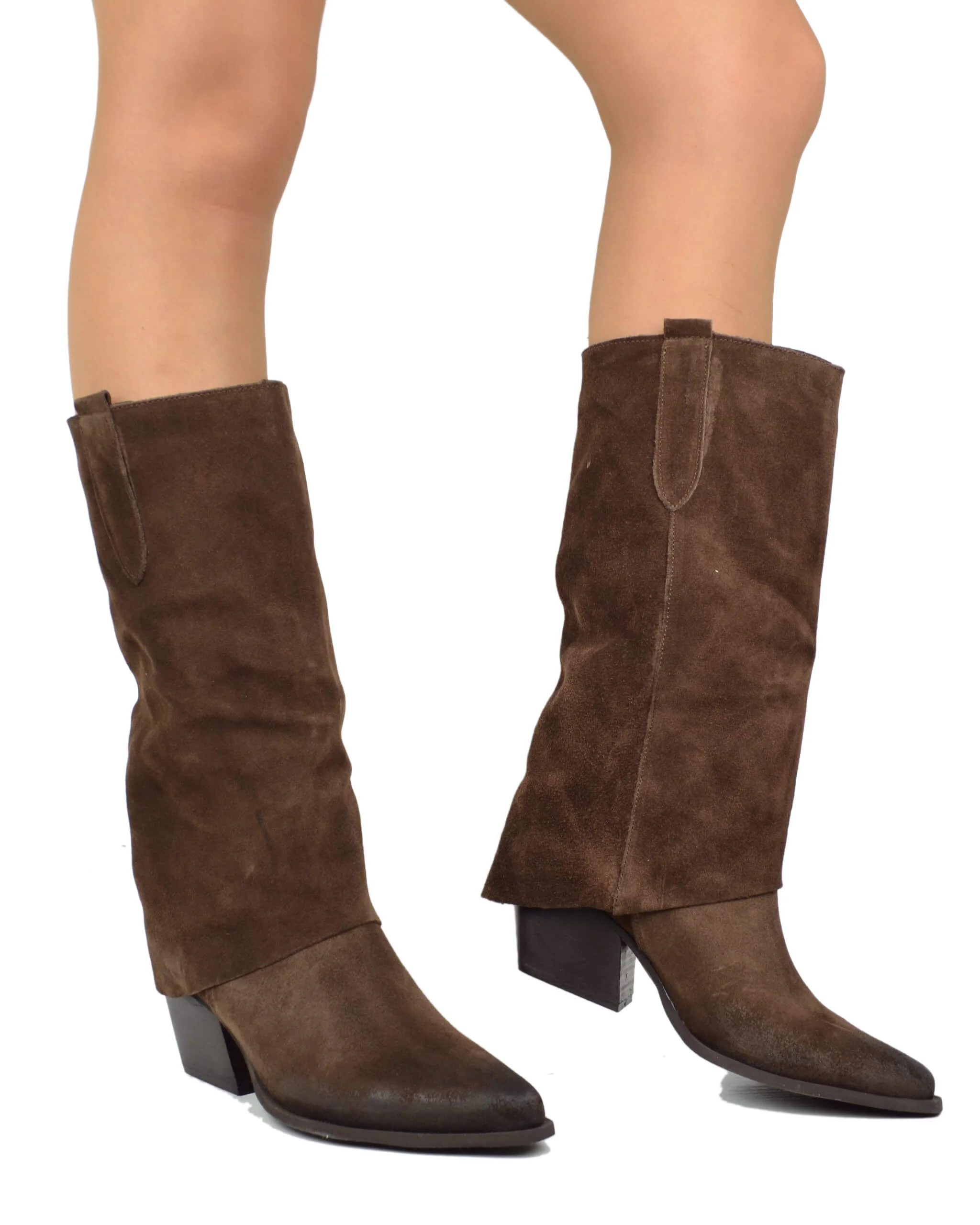 Texani con Ghetta Cioccolato Tacco Medio Vera Pelle Scamosciata Artigianali Marroni