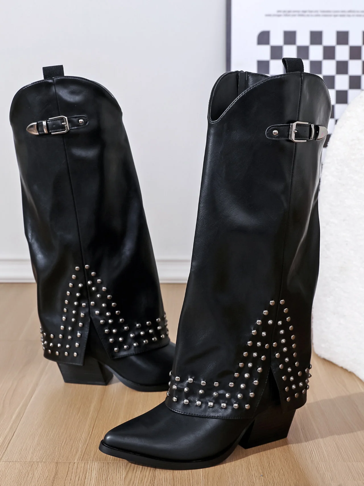 Eleva il tuo look con i nostri stivali texani con risvolto e borchie! Questa versatile calzatura aggiungerà un tocco di classe e completamento all’outfit grazie alla sua pelle sintetica di qualità.