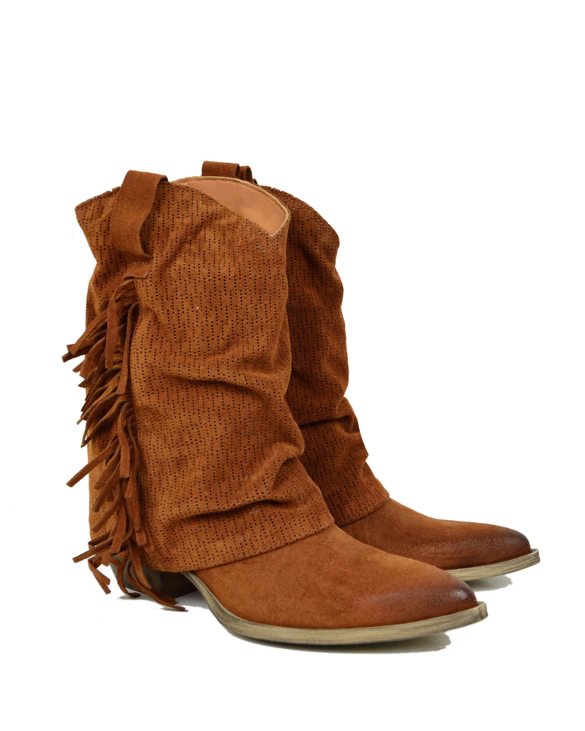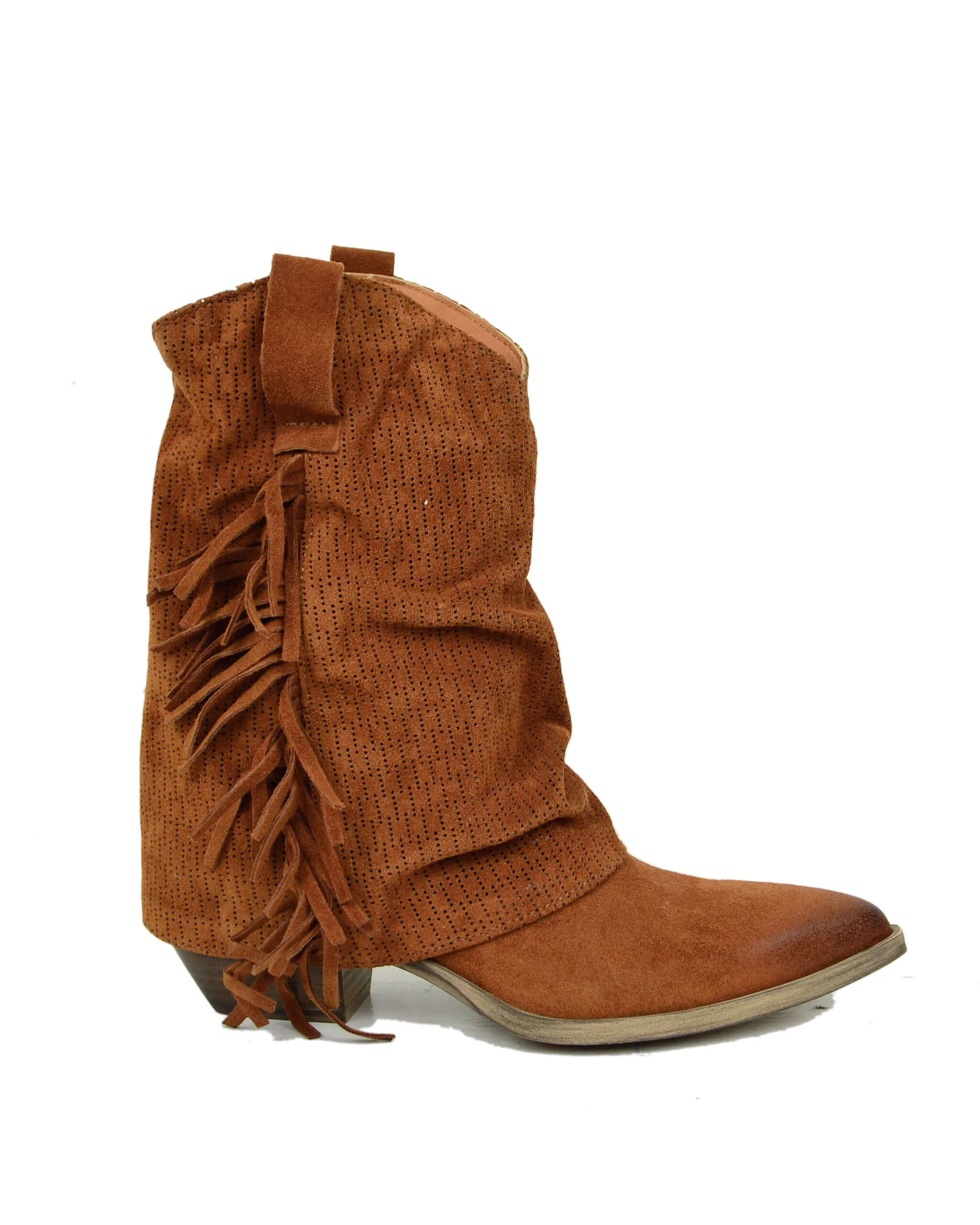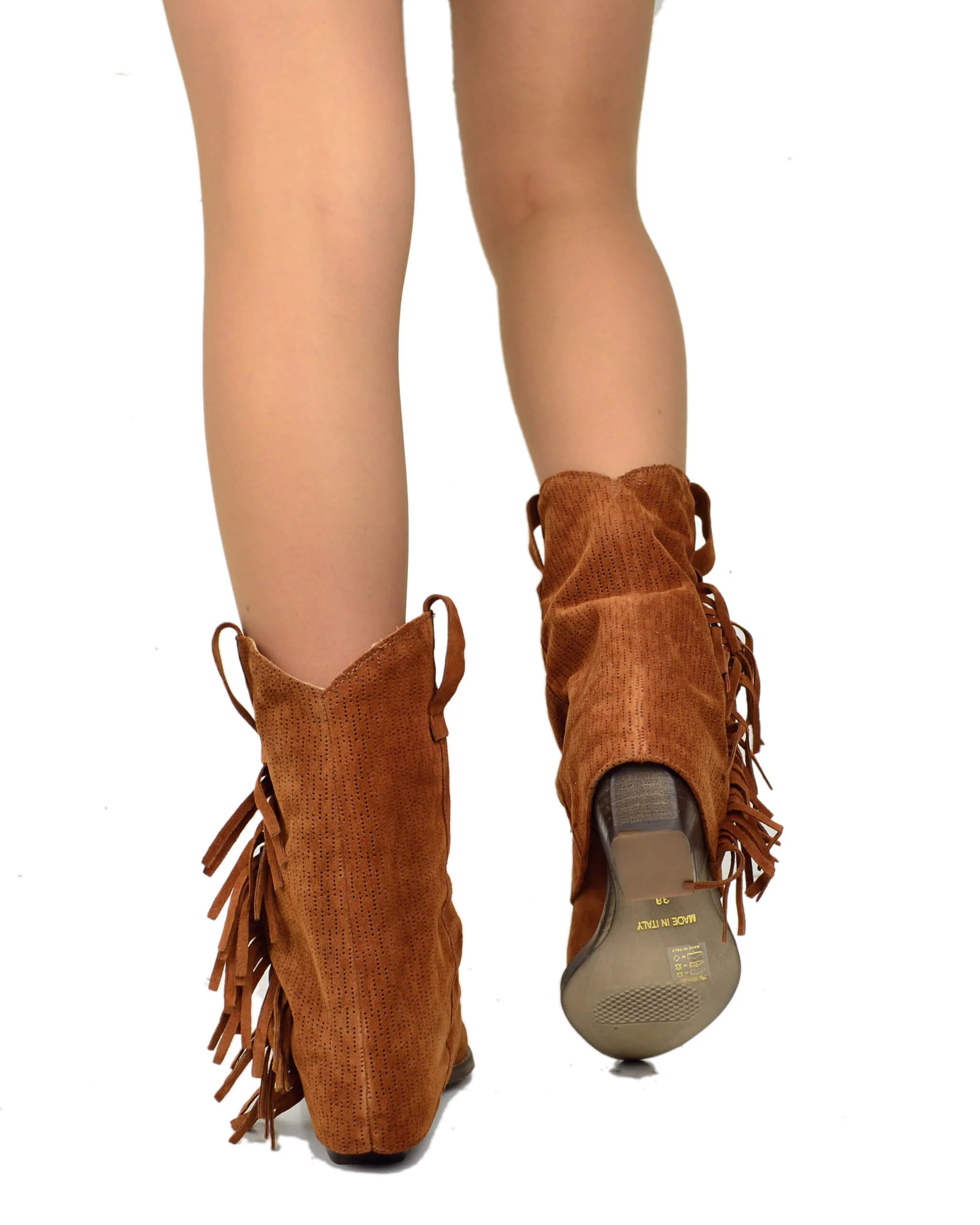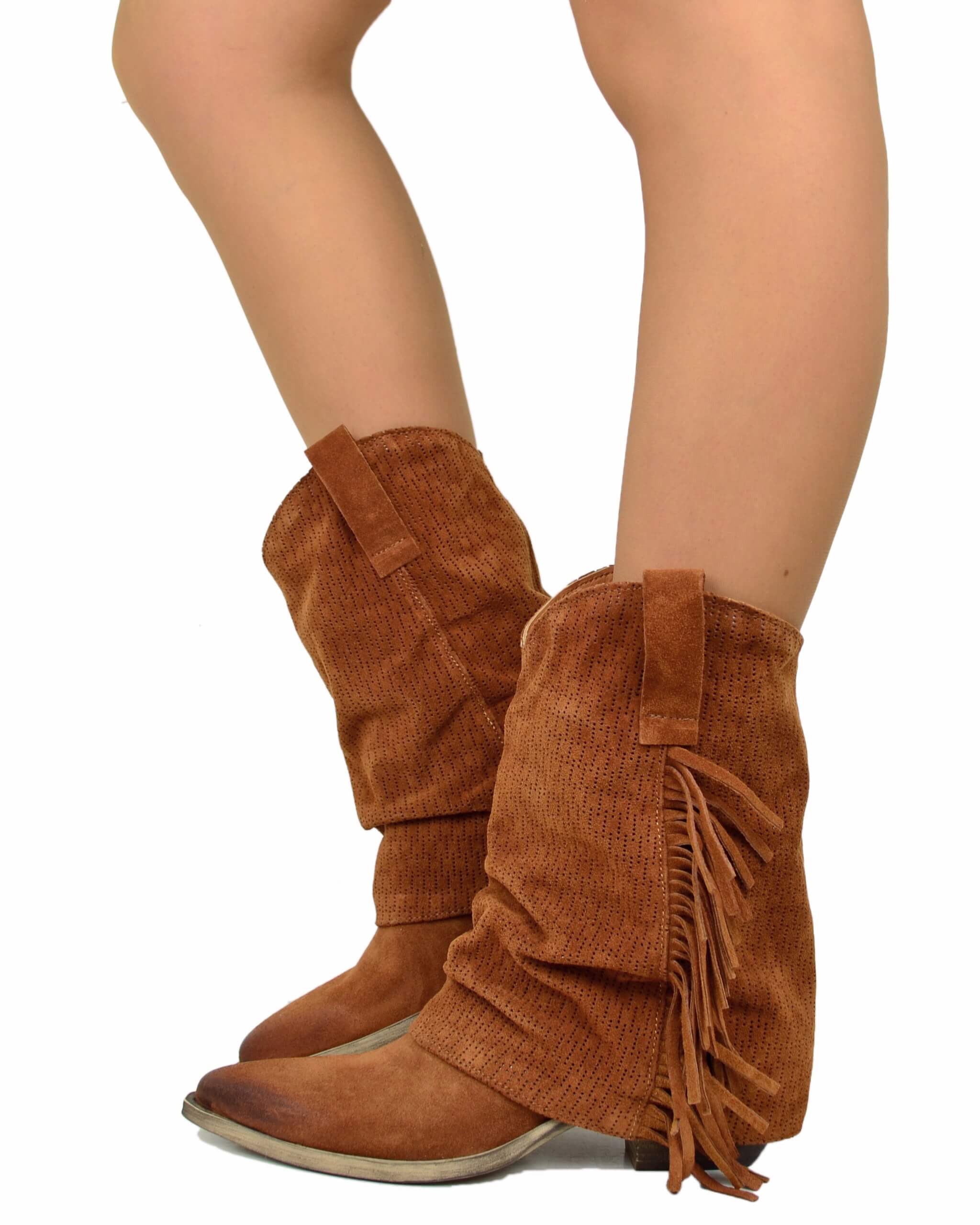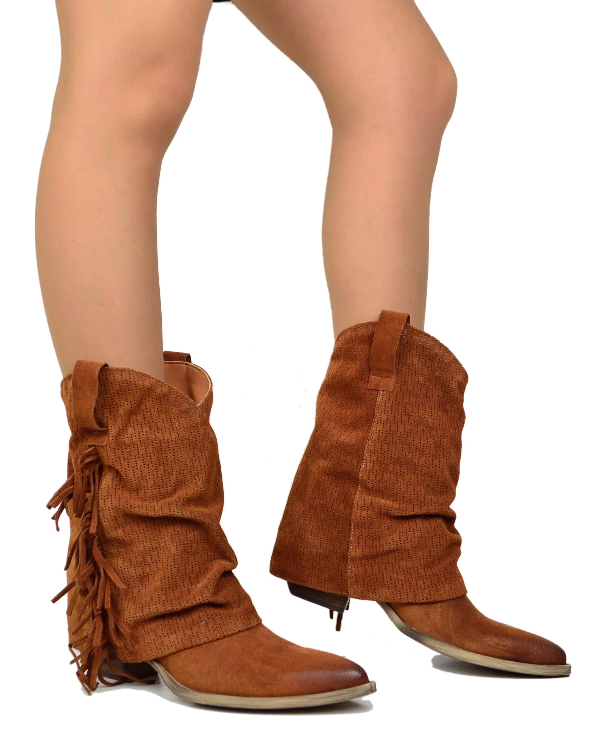 Texani Ghetta Traforati Frange Morbidi in Pelle Scamosciata Cuoio