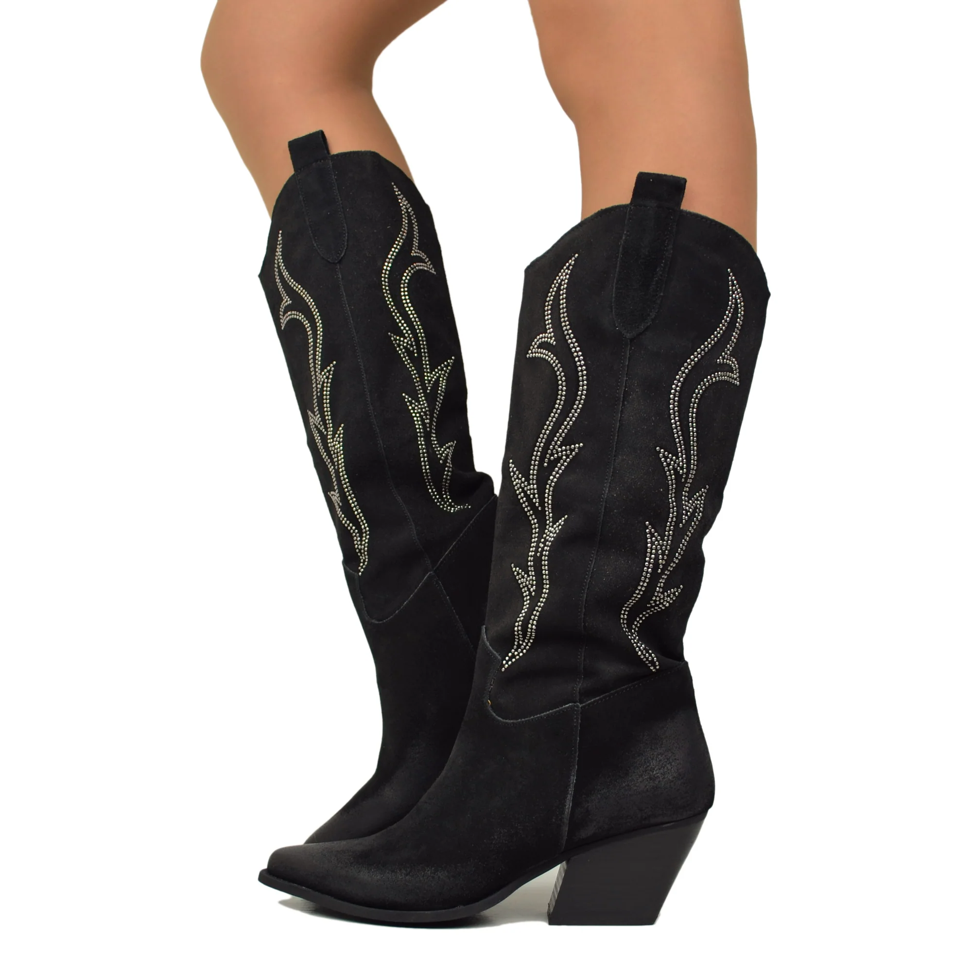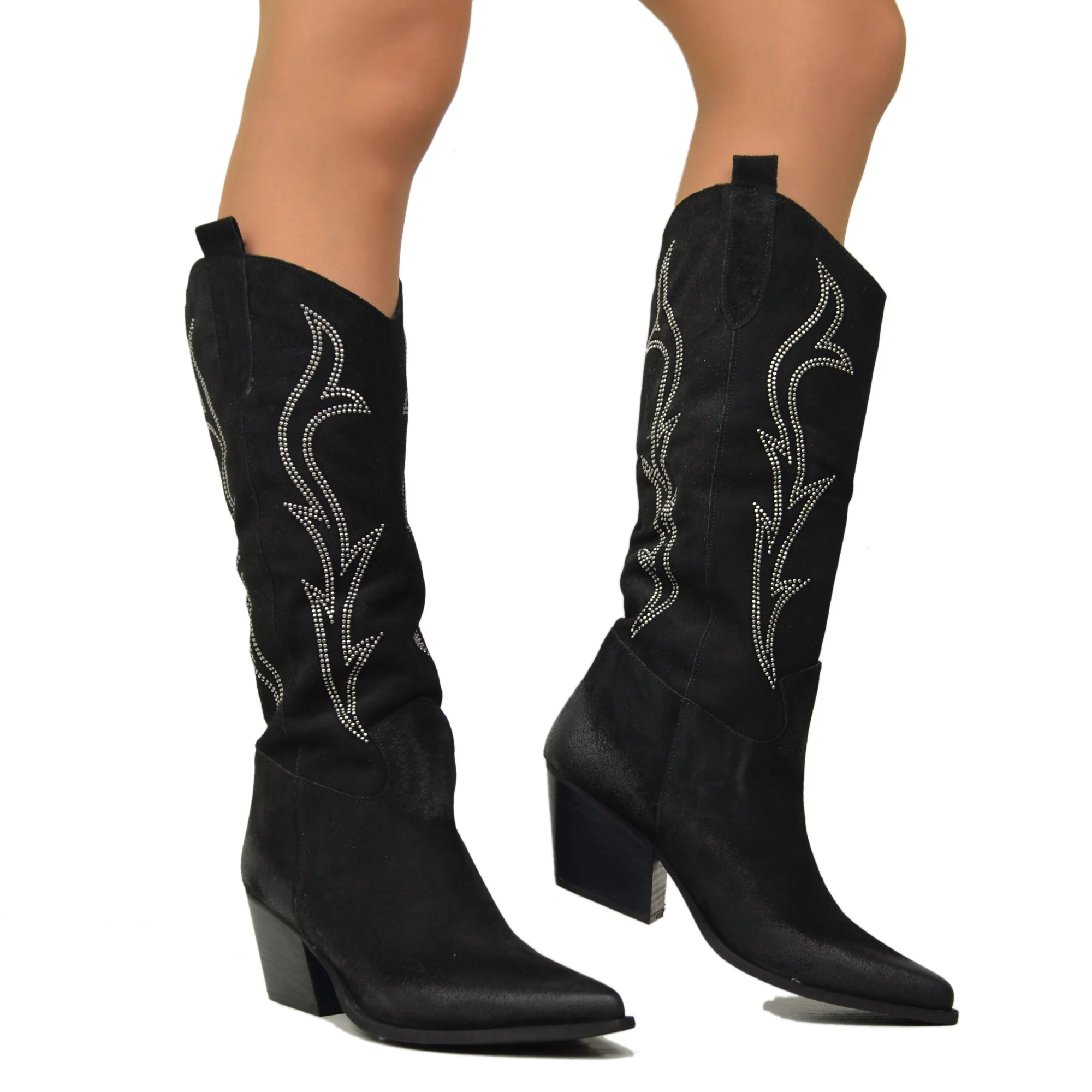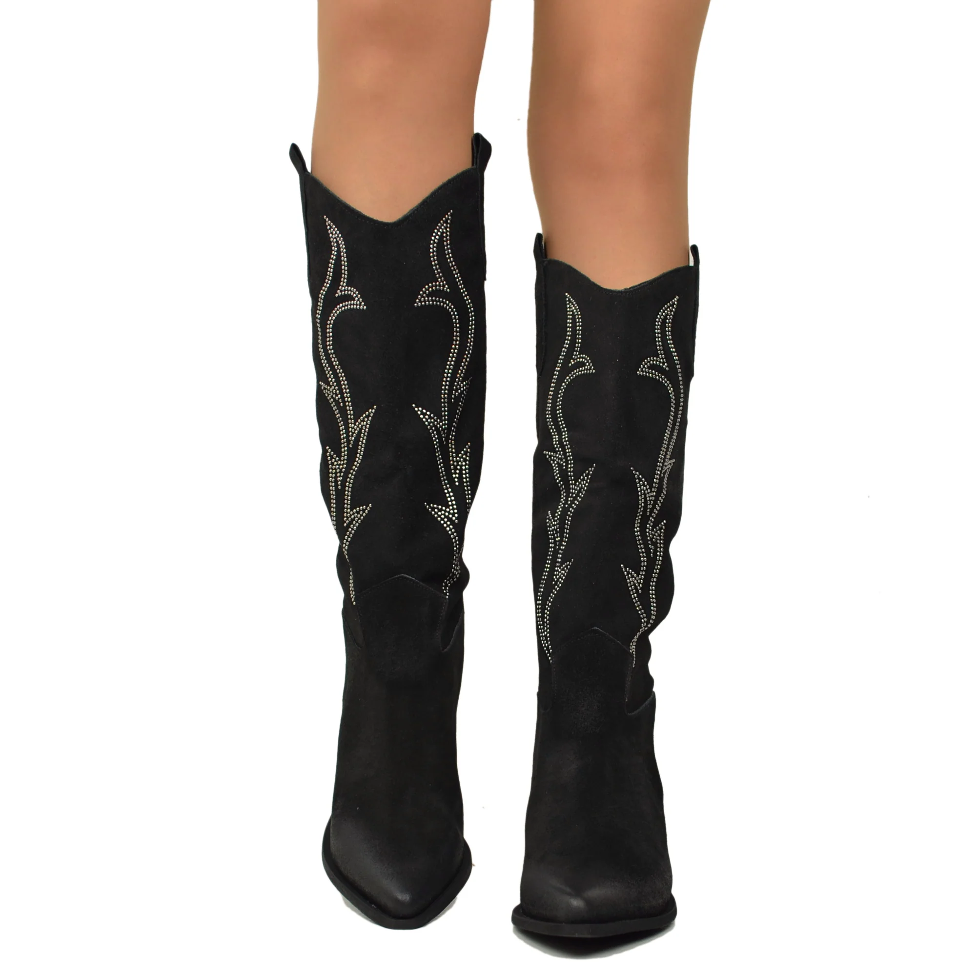 Texani Scamosciati con Strass a Fiamma Neri in Vera Pelle Tacco 7 cm