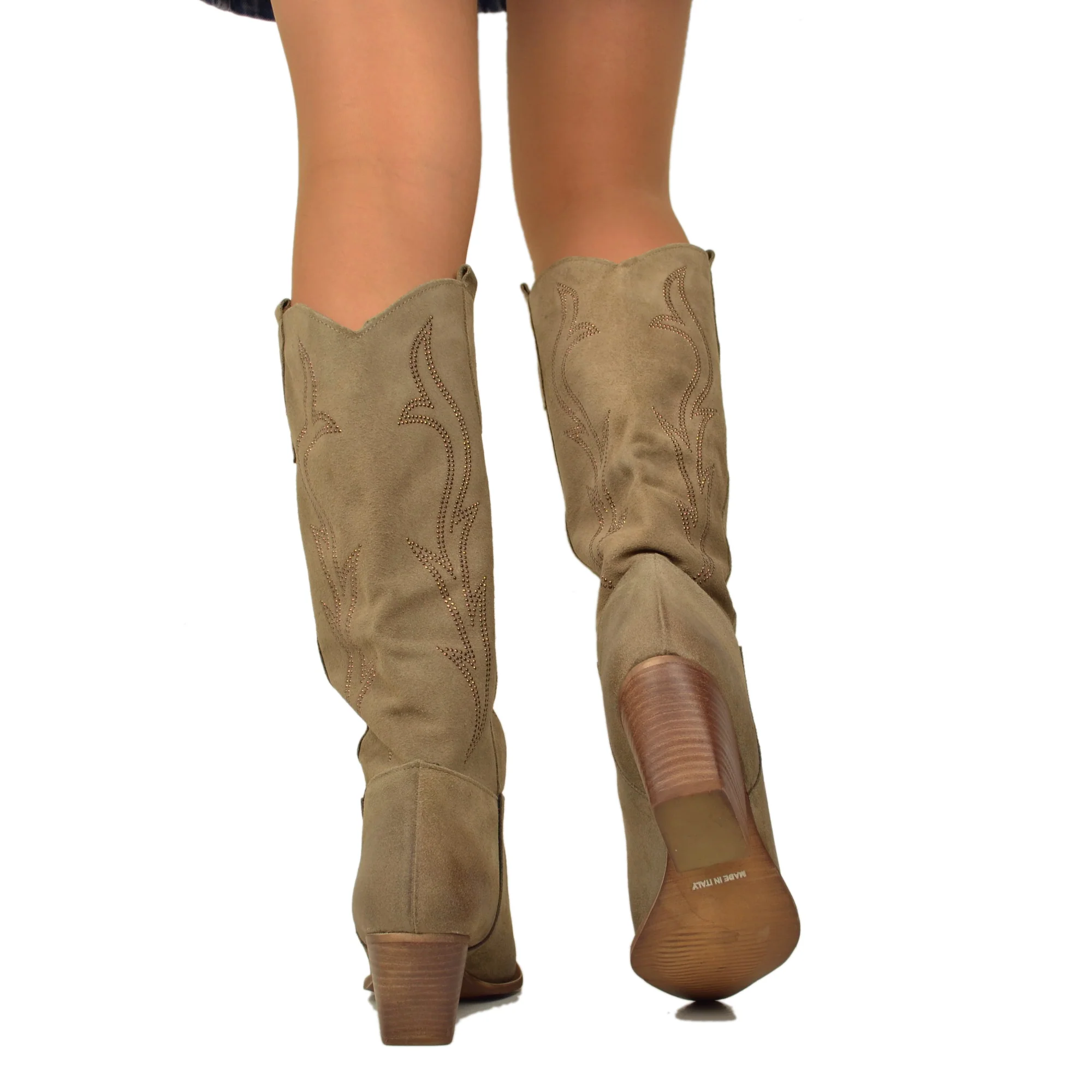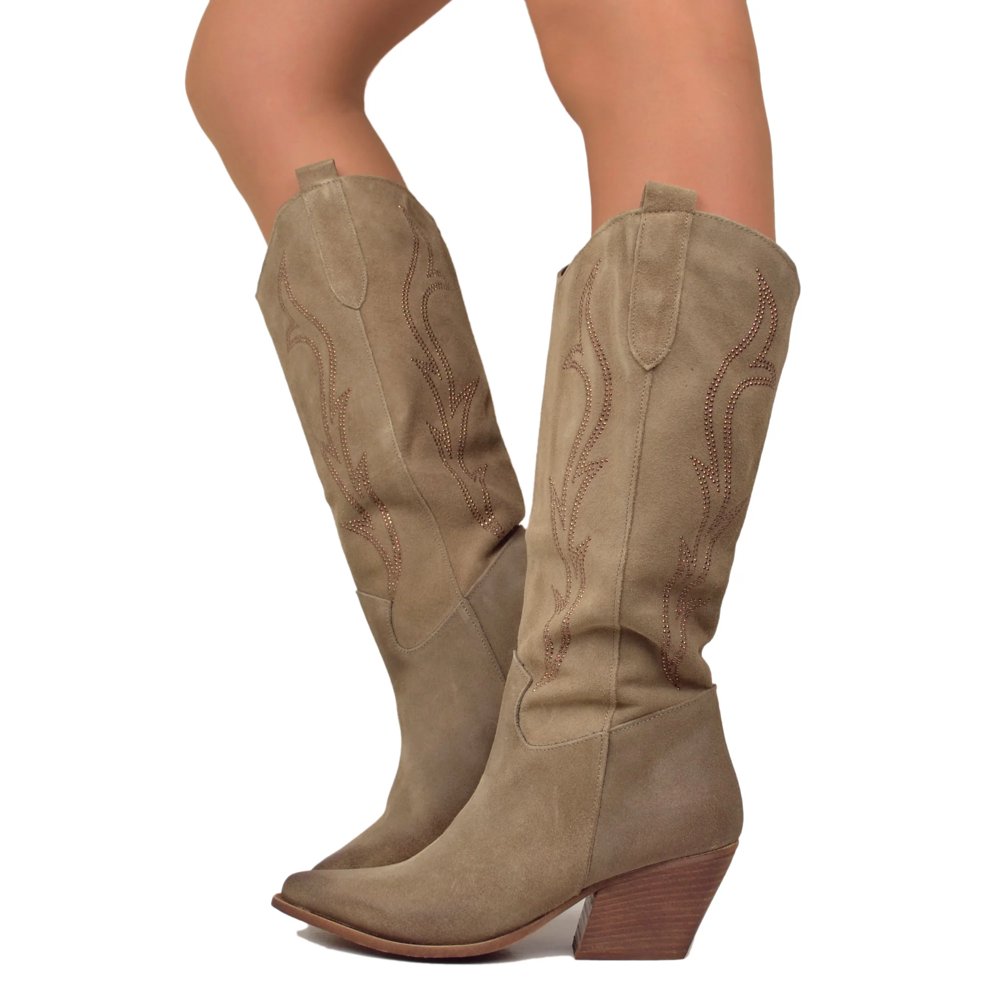 Texani Scamosciati Taupe con Strass a Fiamma in Vera Pelle Tacco 7 cm