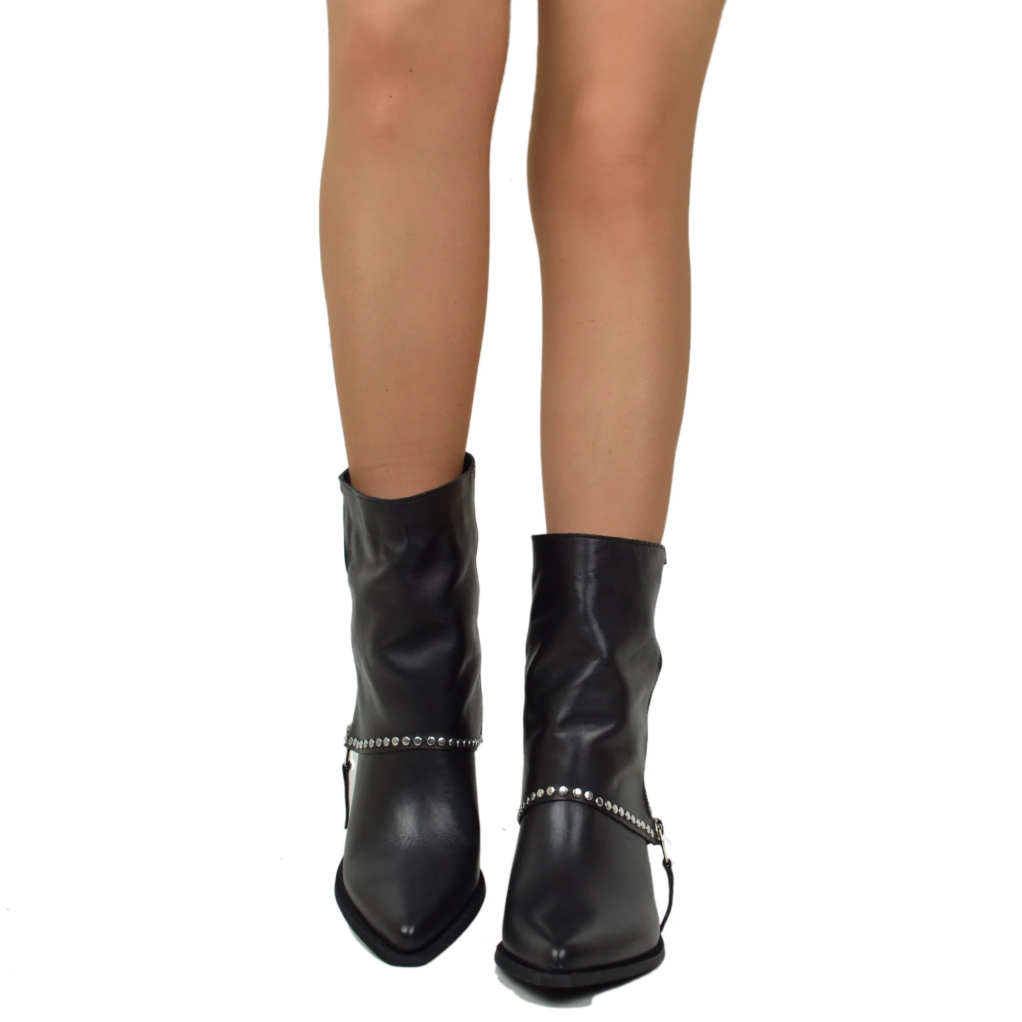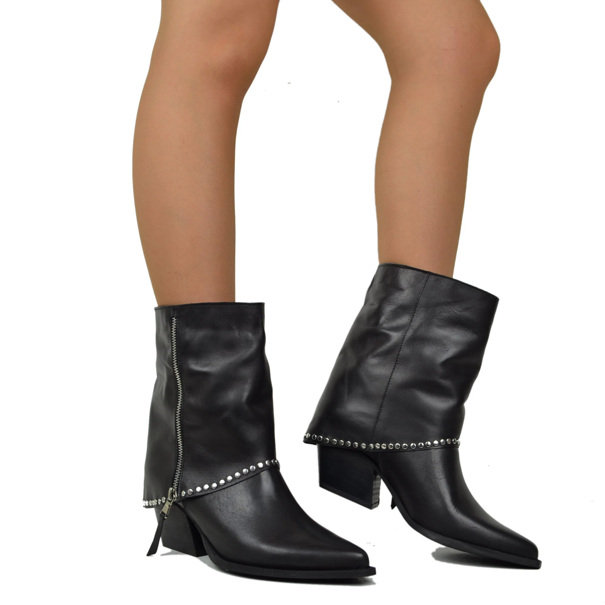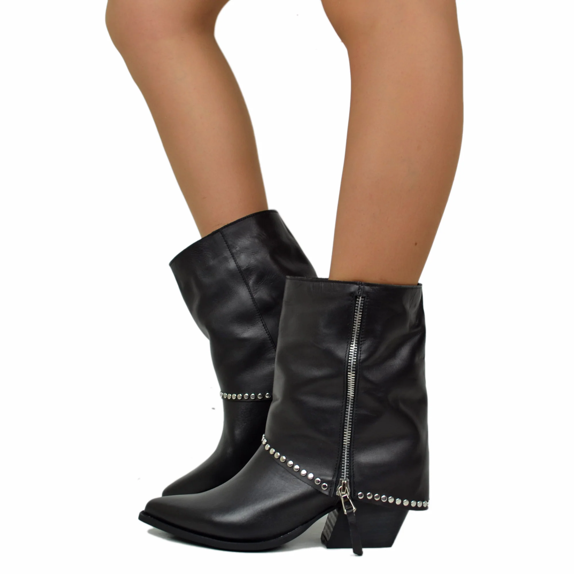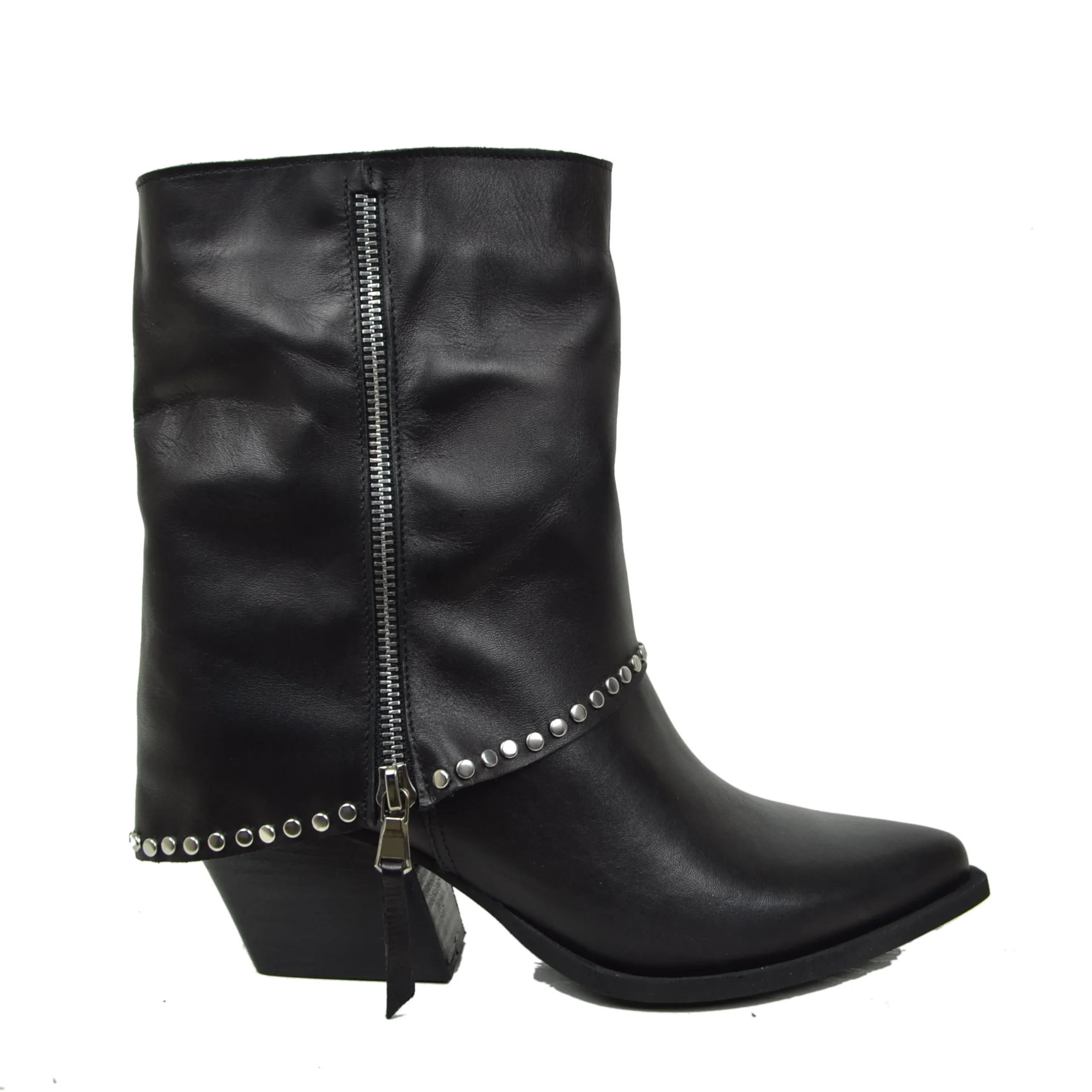 Texanini con Ghetta Borchiati e Zip alla Caviglia Vera Pelle Artigianali Neri