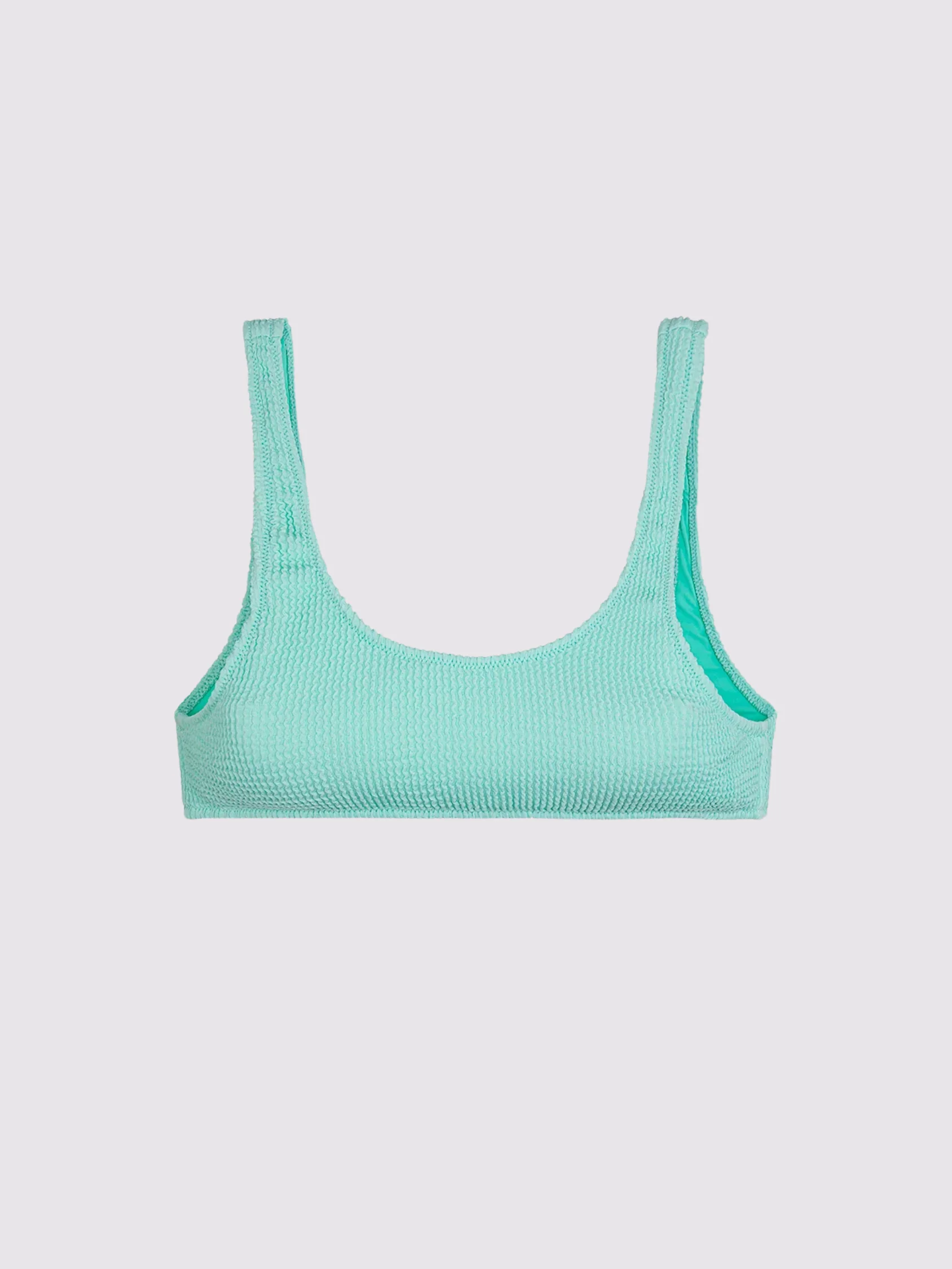 Top bikini fisso, realizzato in Lycra goffrata, un tessuto elasticizzato che garantisce comfort e una vestibilità perfetta. Il design strutturato offre un sostegno ottimale, mentre l’imbottitura interna estraibile permette di personalizzare il fit in base alle proprie esigenze.