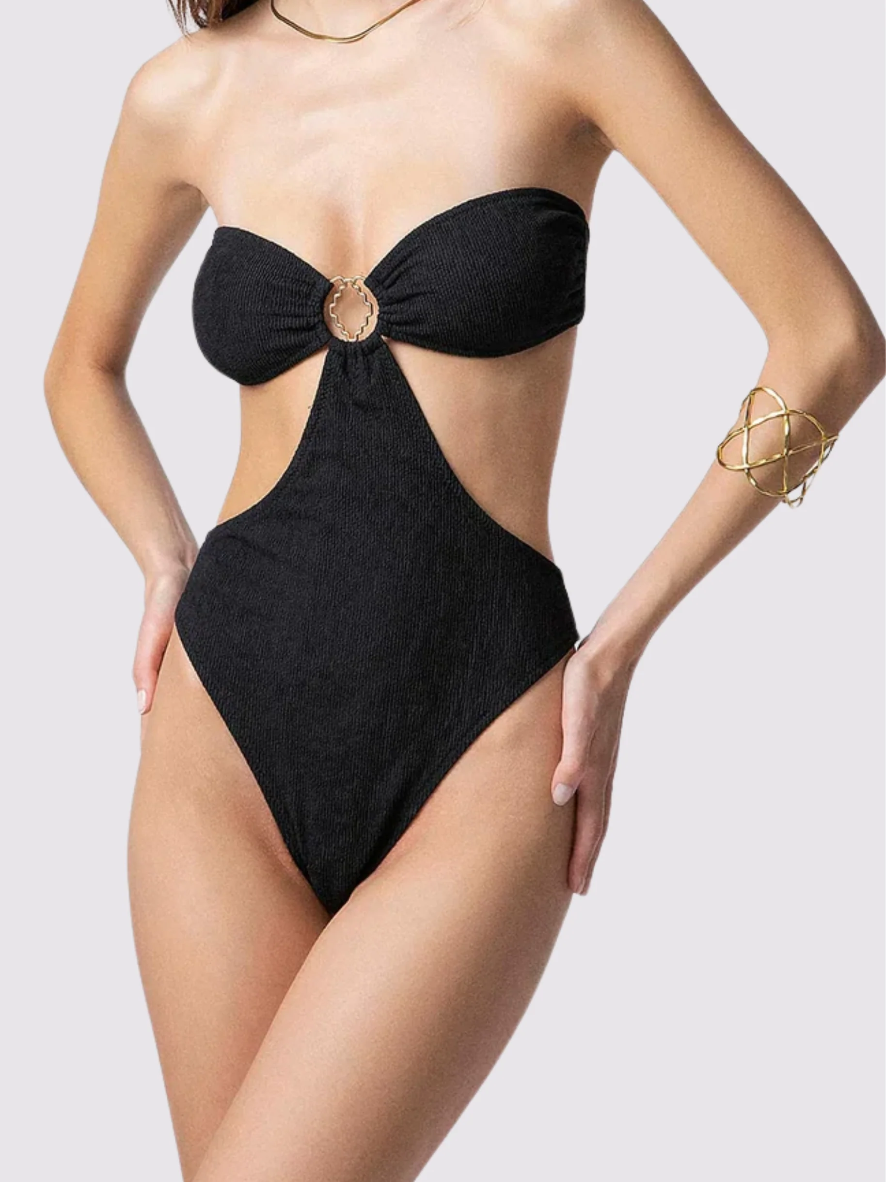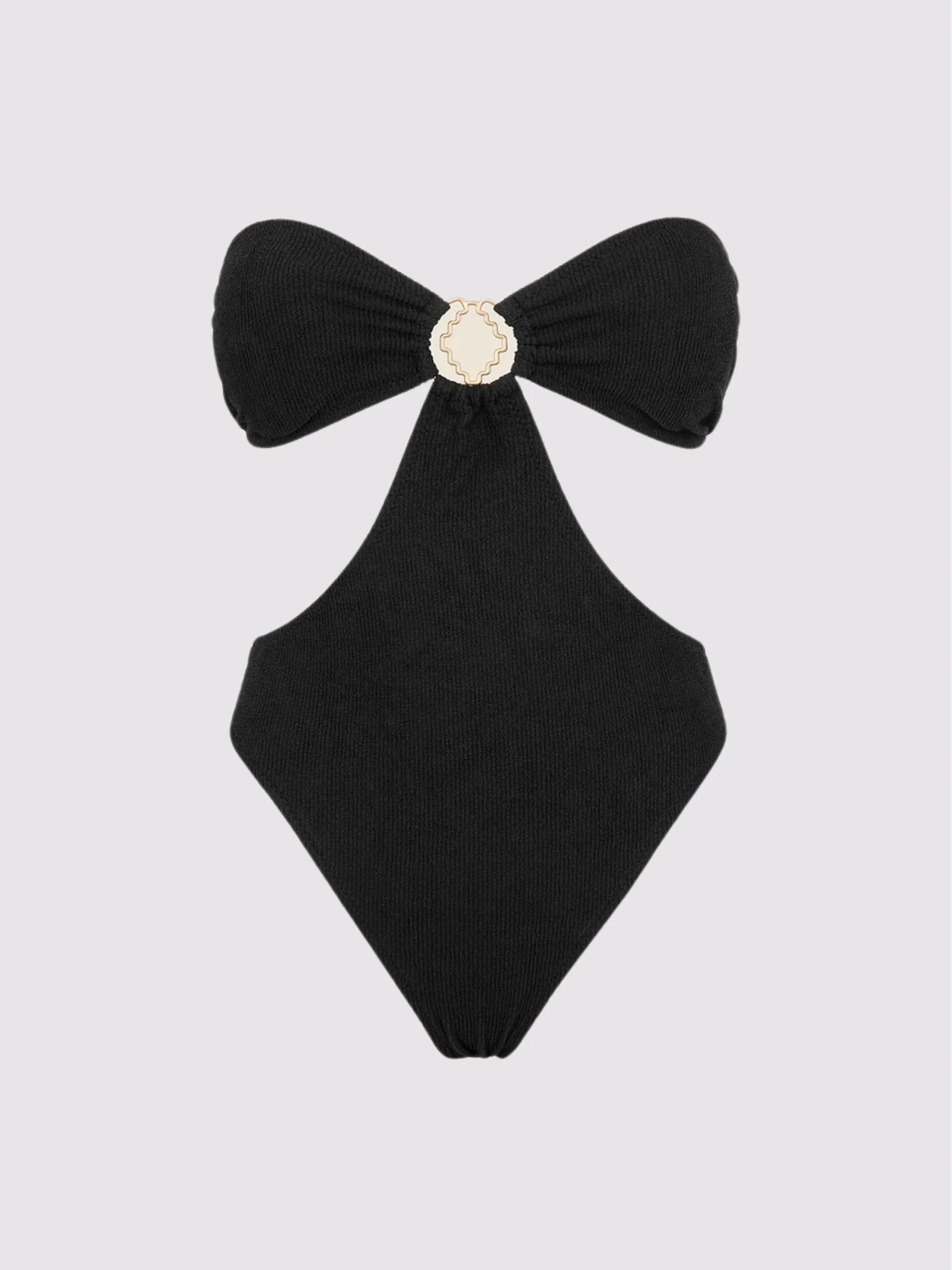 Questo trikini nero Me Fui unisce stile e sensualità in un design sofisticato. Realizzato in lycra goffrata (56% poliestere, 35% nylon, 9% elastan), presenta imbottitura interna estraibile per il massimo comfort e una chiusura con gancio che assicura una vestibilità perfetta. L’accessorio al centro del seno dona un tocco elegante, rendendo questo capo ideale per chi cerca un look esclusivo per l’estate. Per preservarne la qualità, si consiglia il lavaggio a mano in acqua tiepida. Perfetto per distinguersi con classe in ogni occasione balneare.