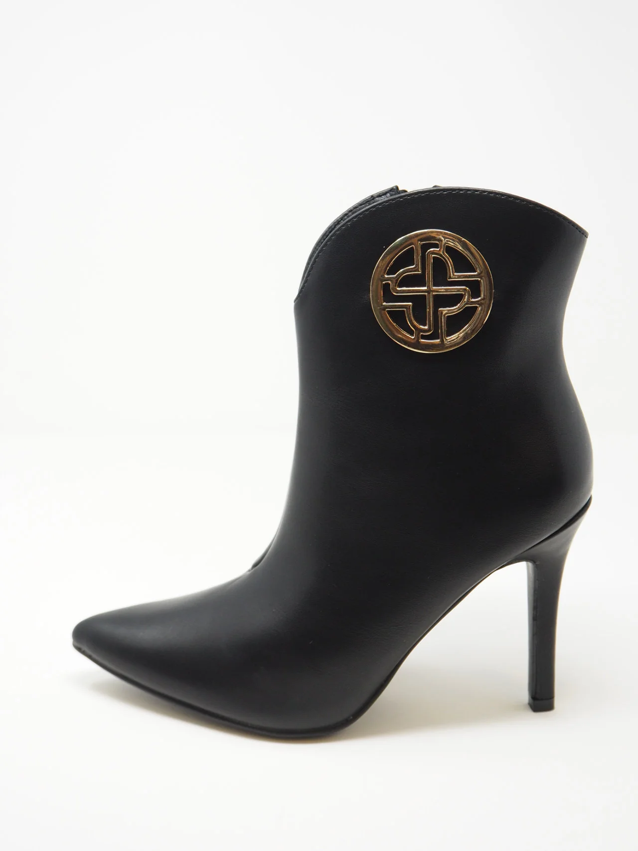Stivaletti bassi a punta con logo colore oro sul fianco, con chiusura cerniera zip, in finta pelle dal look fashion e trendy Tomaia similpelle Suola sintetica Tacco altezza: 10 cm Tacco diametro: 0,7 cm Altezza totale: 11 cm escluso tacco Art. X8172