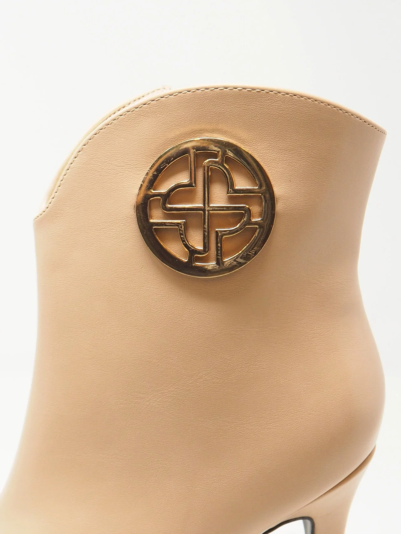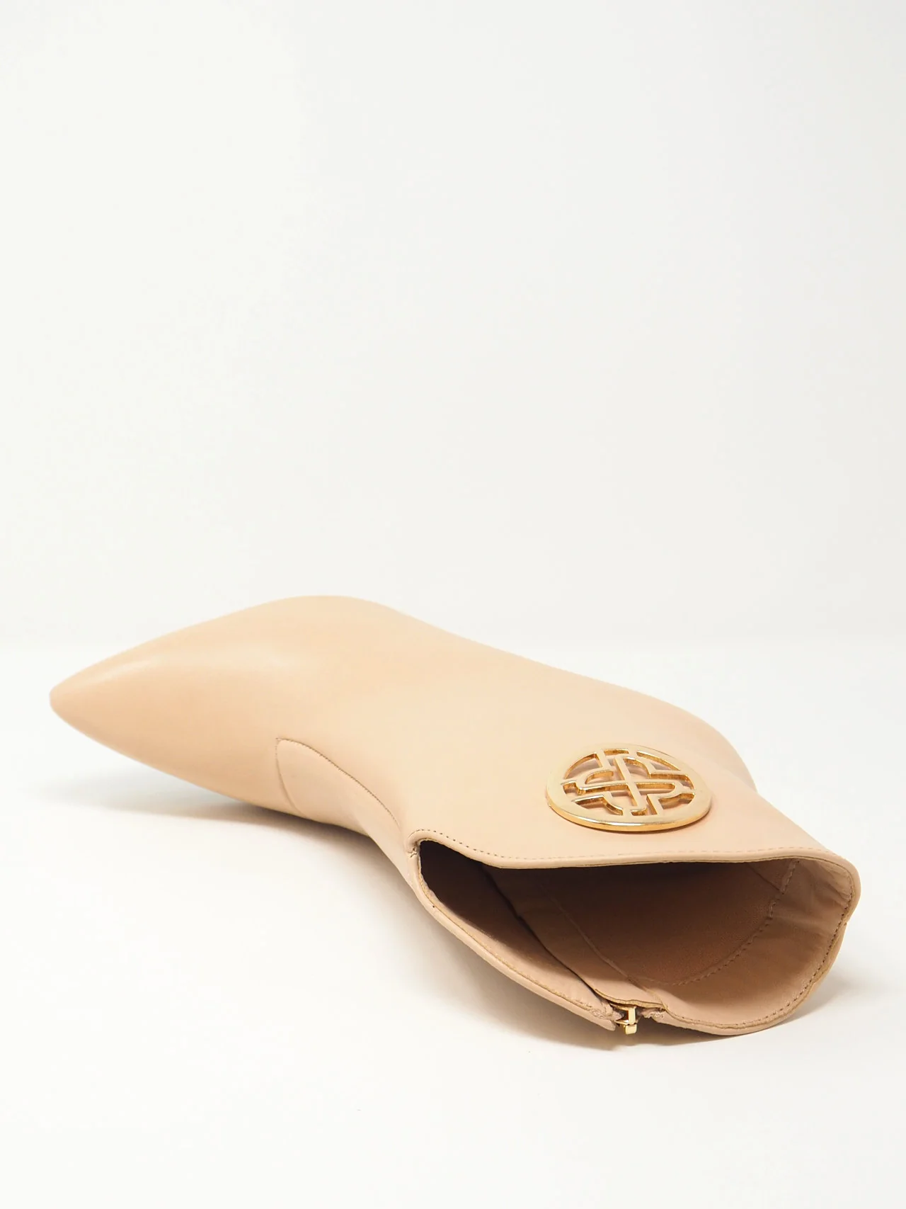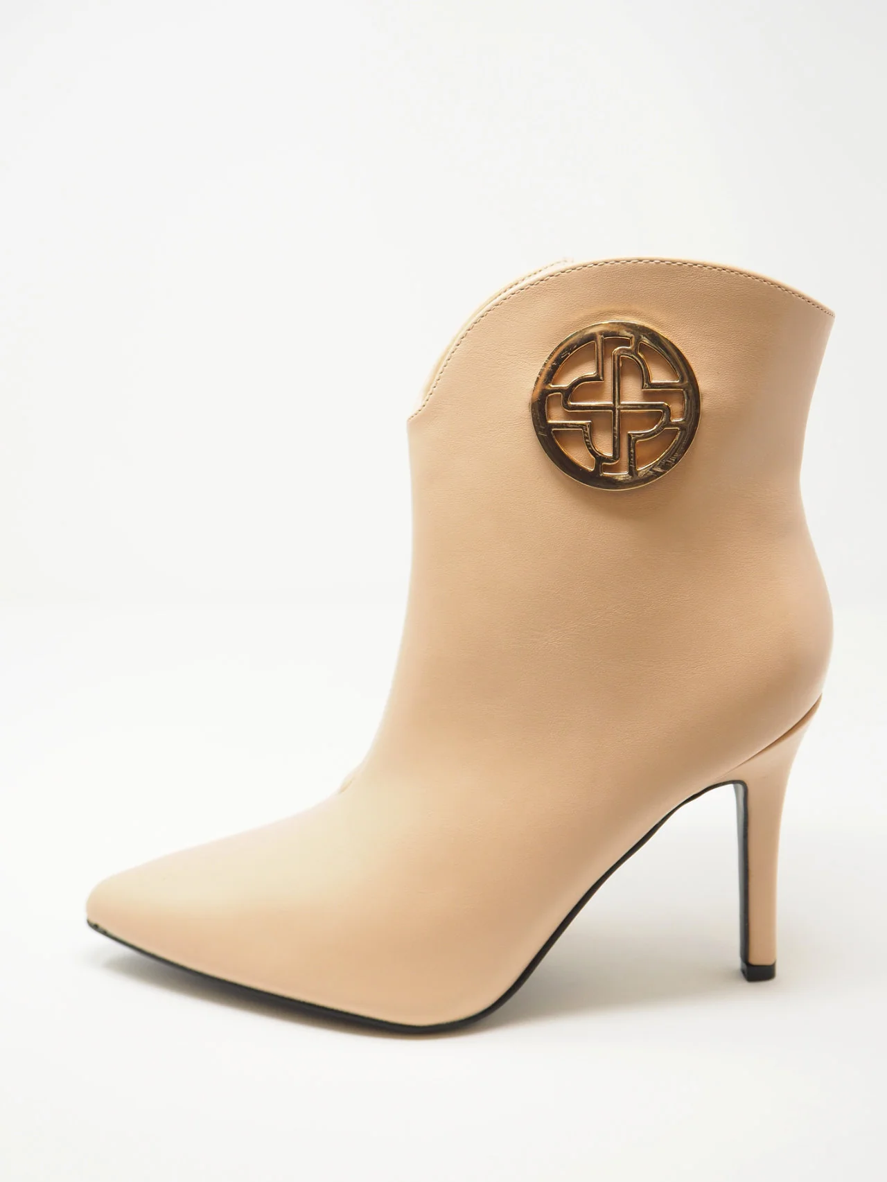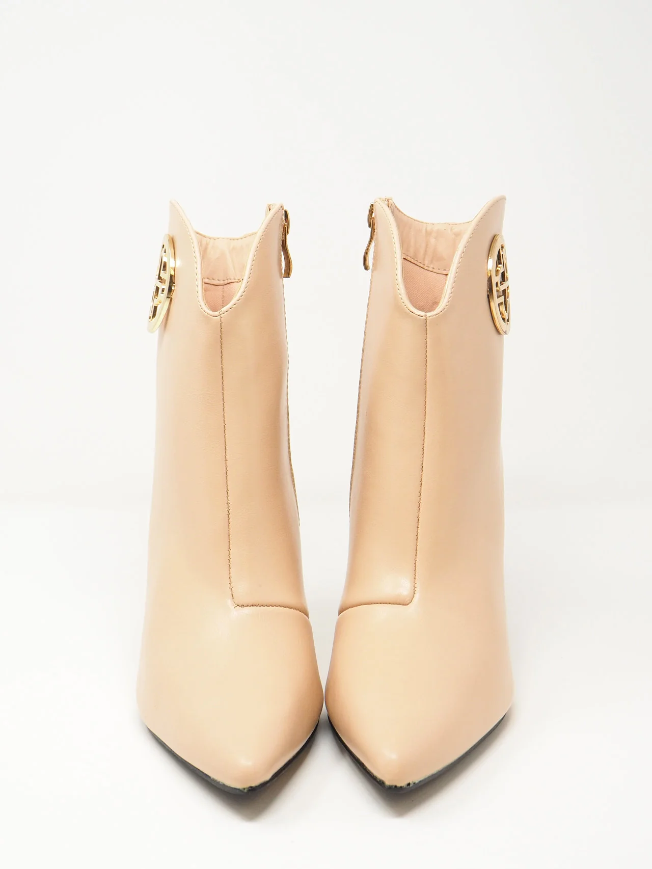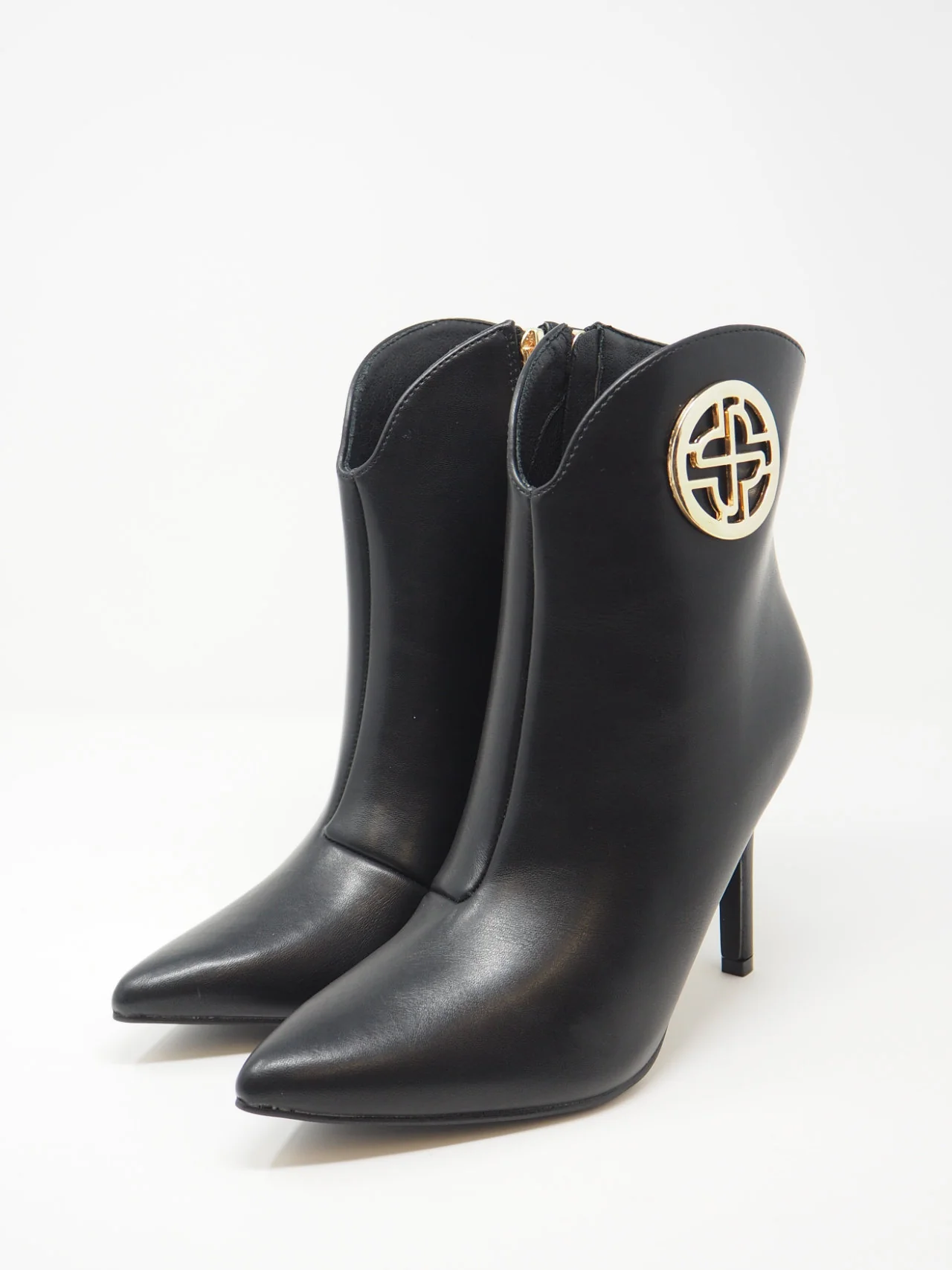 - Stivaletti bassi a punta con logo colore oro sul fianco, con chiusura cerniera zip, in finta pelle dal look fashion e trendy