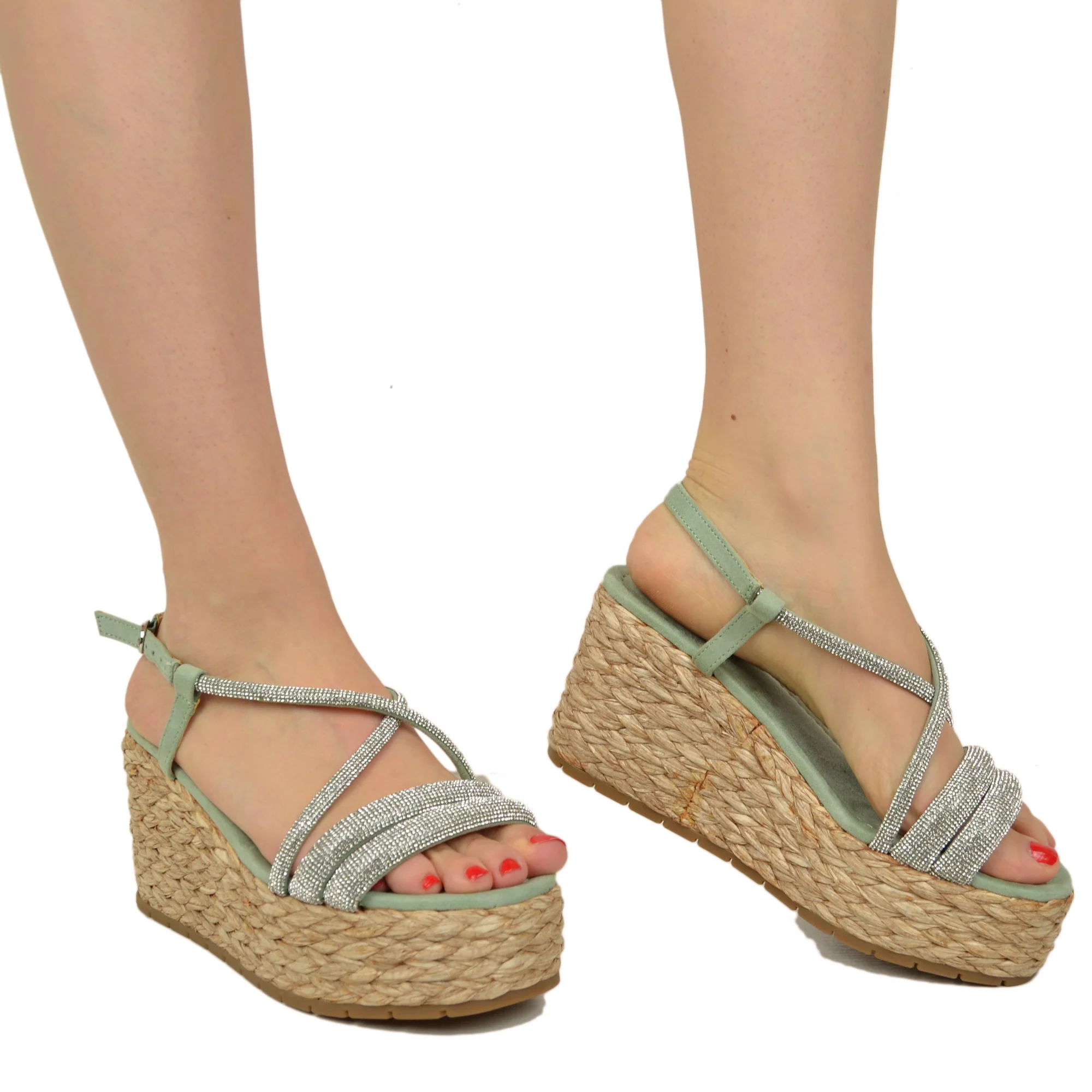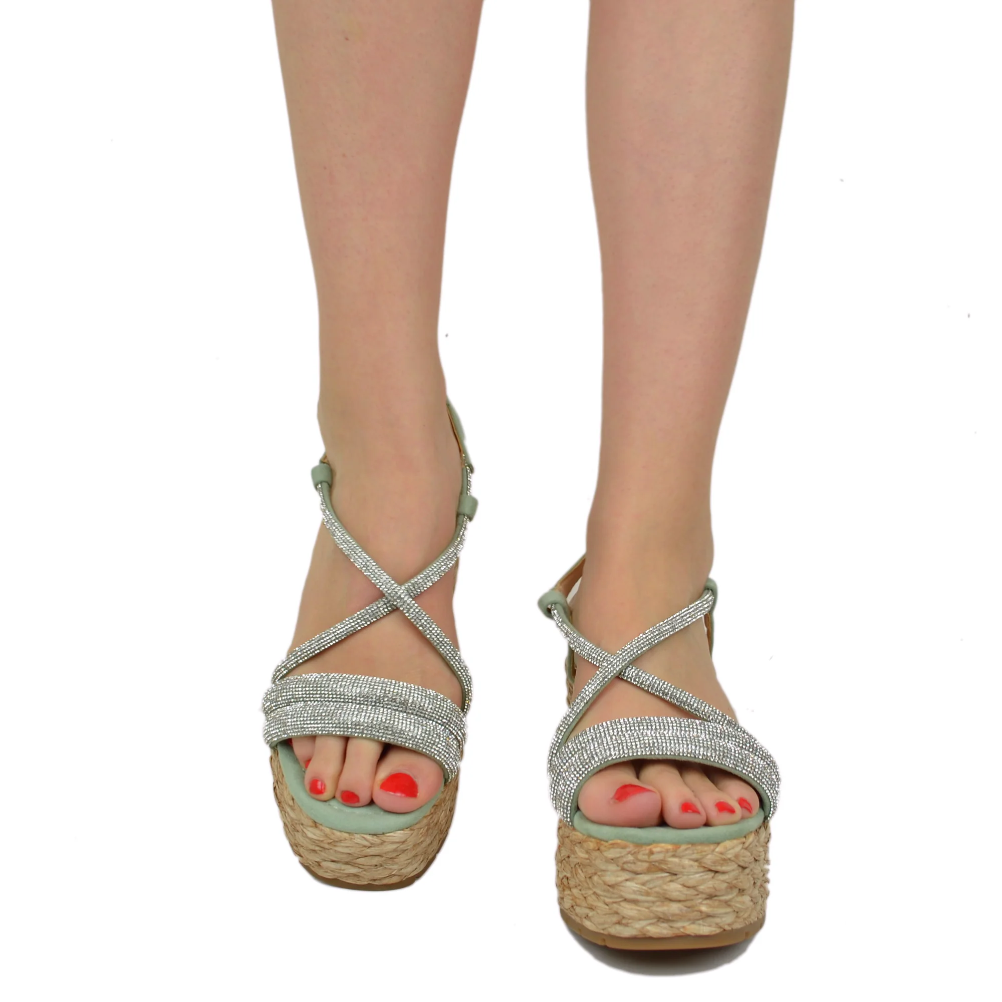 Zeppe Sandali Donna con Strass e Zeppa in Rafia Intrecciata Verde Acqua