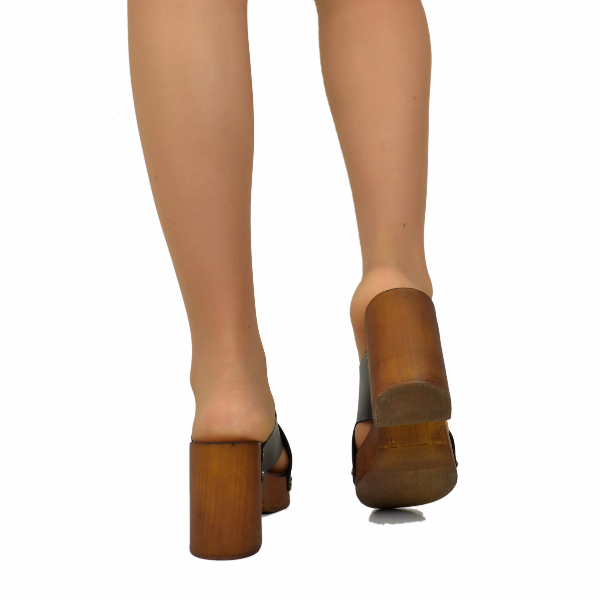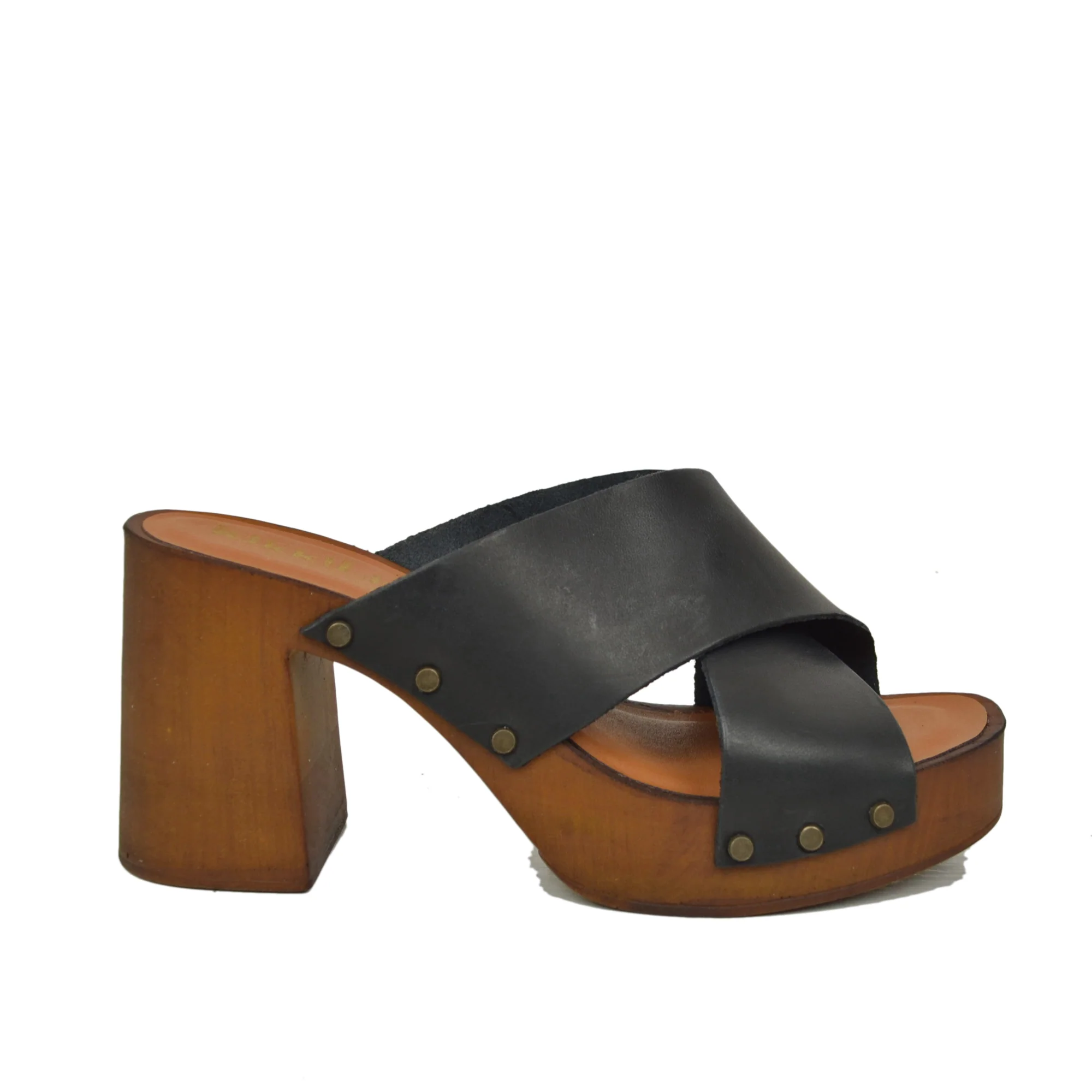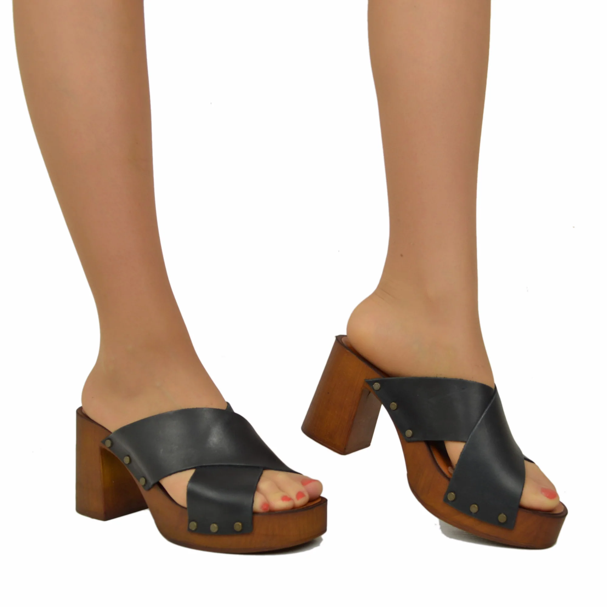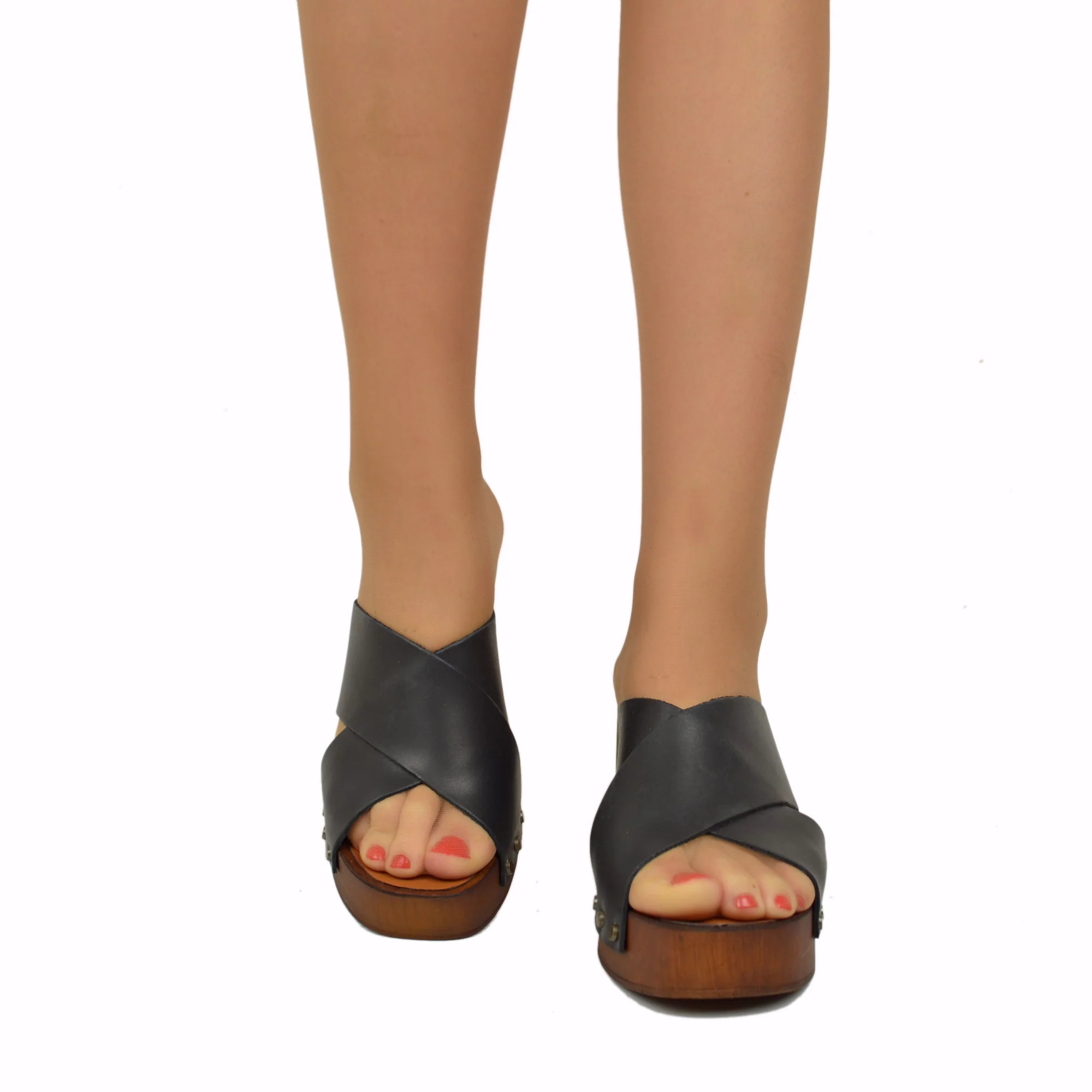 Zoccoli Donna Fascia Incrociata Neri in Pelle Ingrassata con Suola Morbida Imbottita