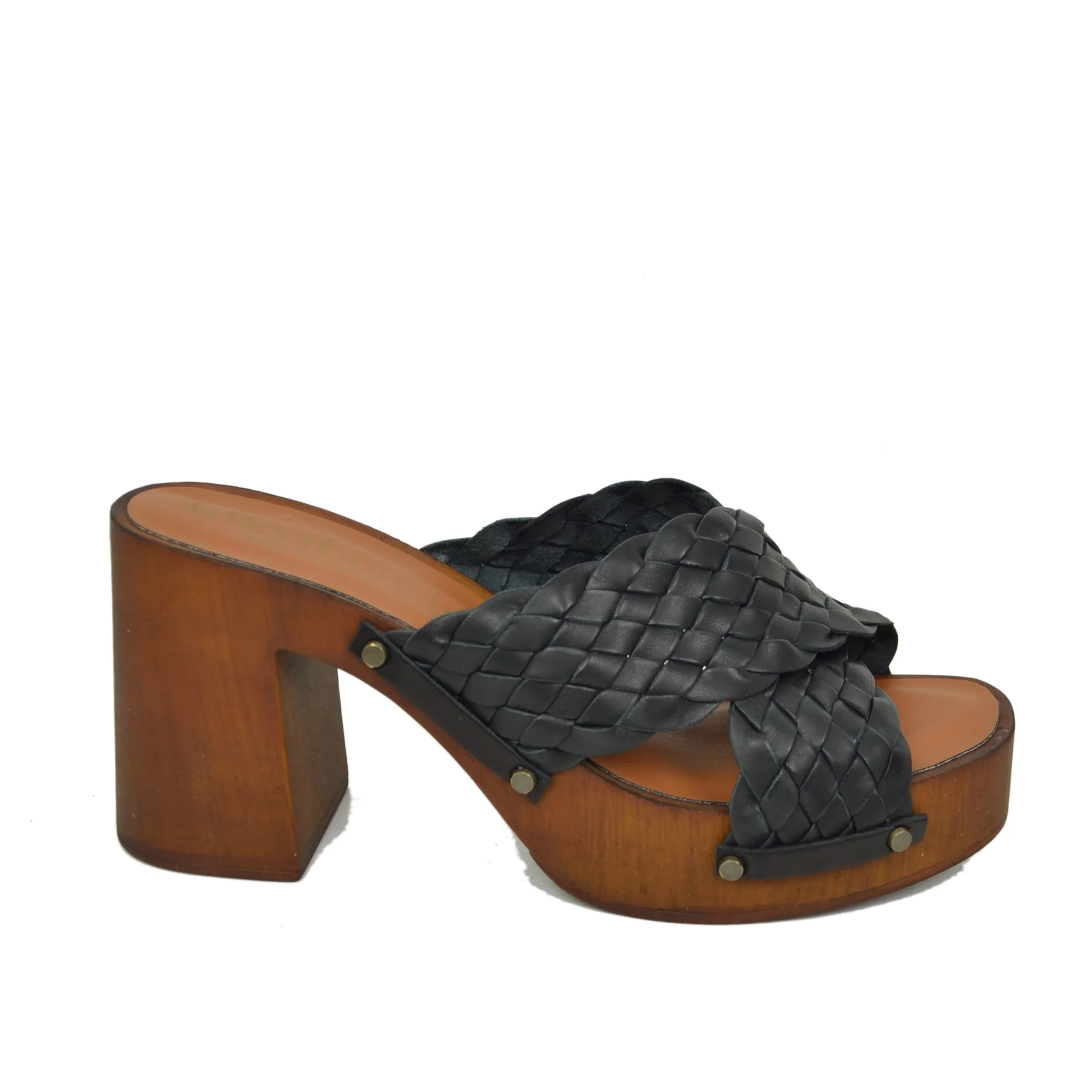 Zoccoli Donna Neri Ciabattone in Pelle Intrecciata Incrociati