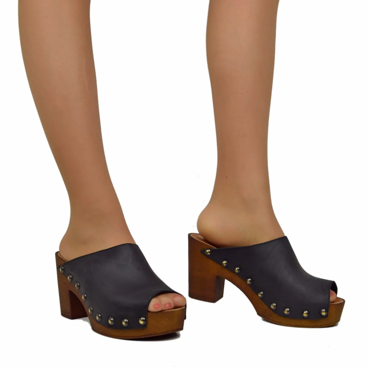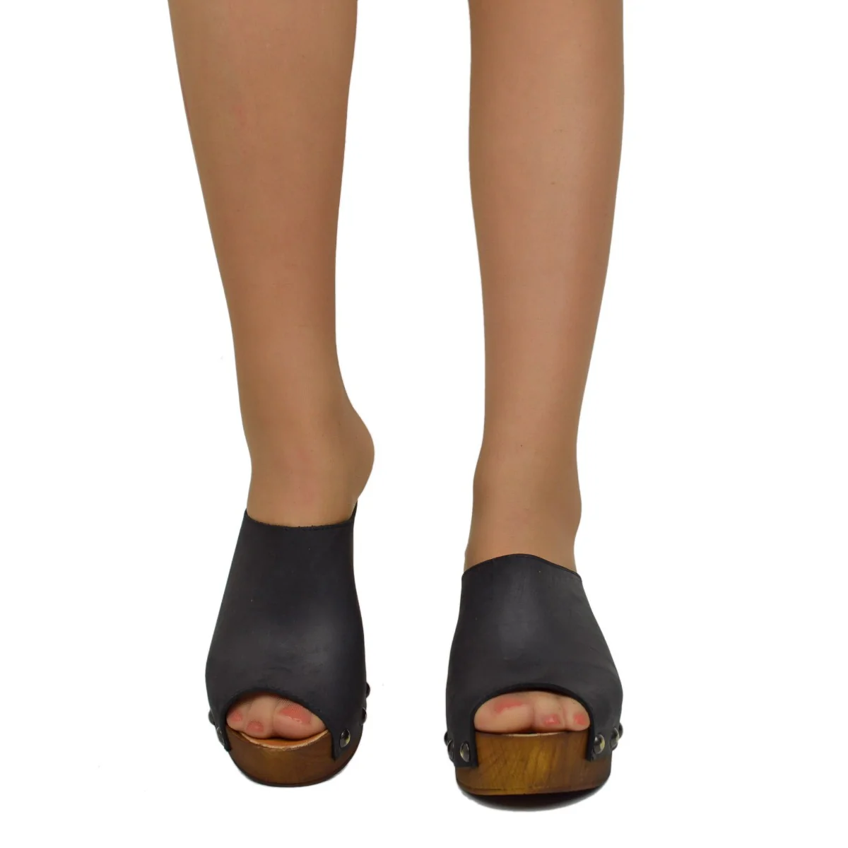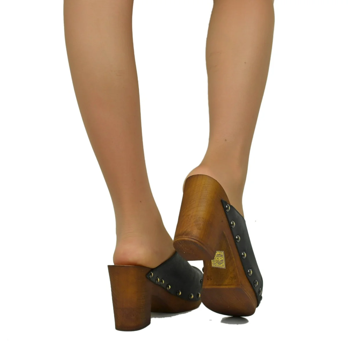 Zoccolo Donna in Pelle Ingrassata Neri con Fondo in Simil Legno