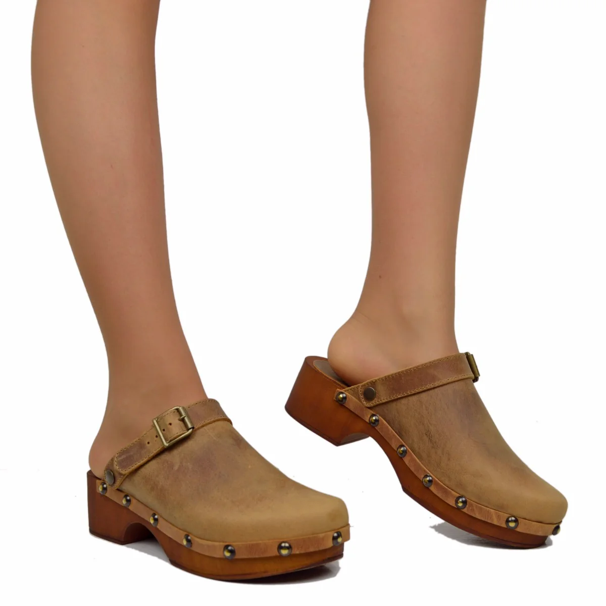 Zoccoli Donna in Pelle Ingrassata Vintage Camel con Cinturino che si trasforma in Sandalo, realizzata in pelle ingrassata di colore camel, dal design elegante e vintage.